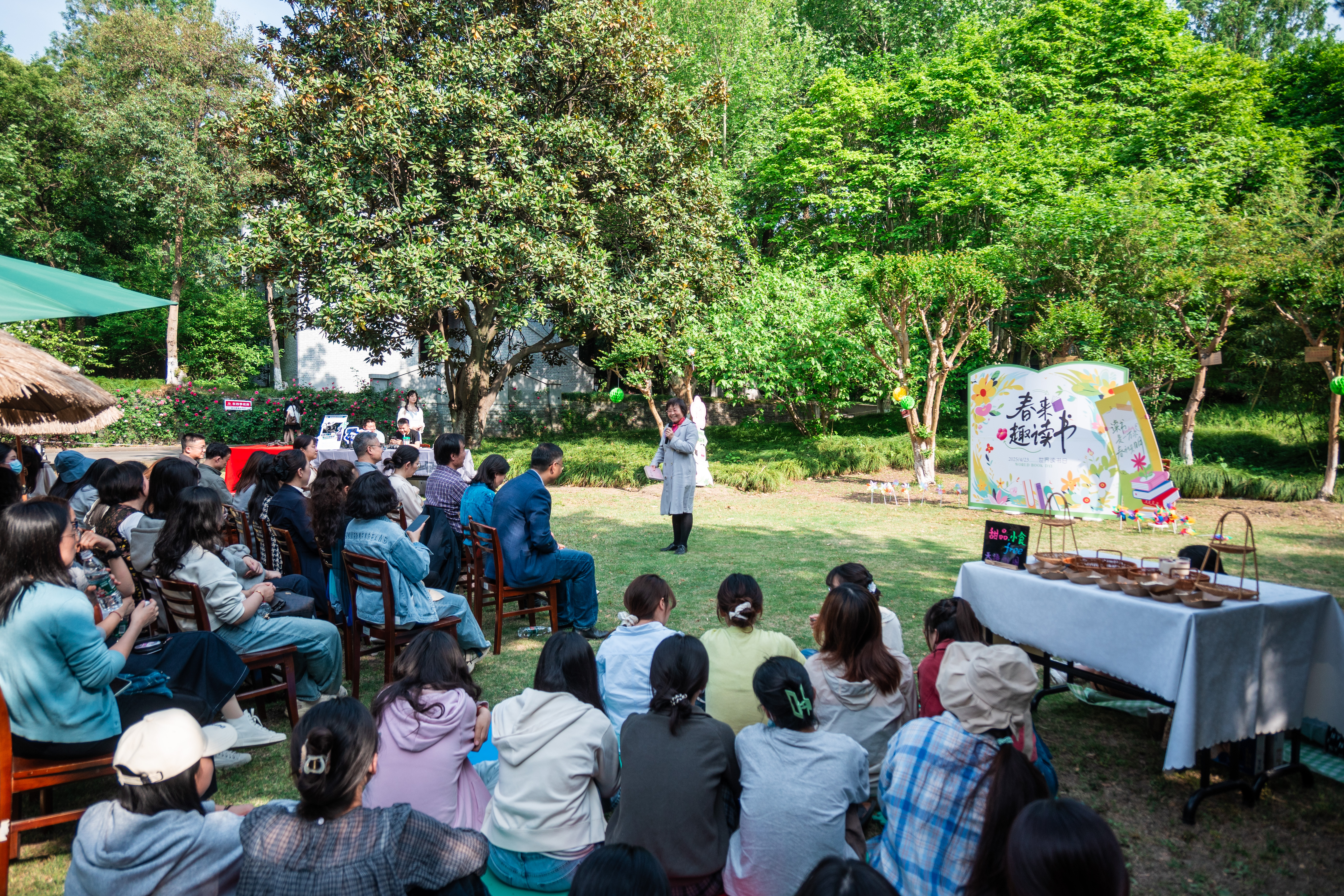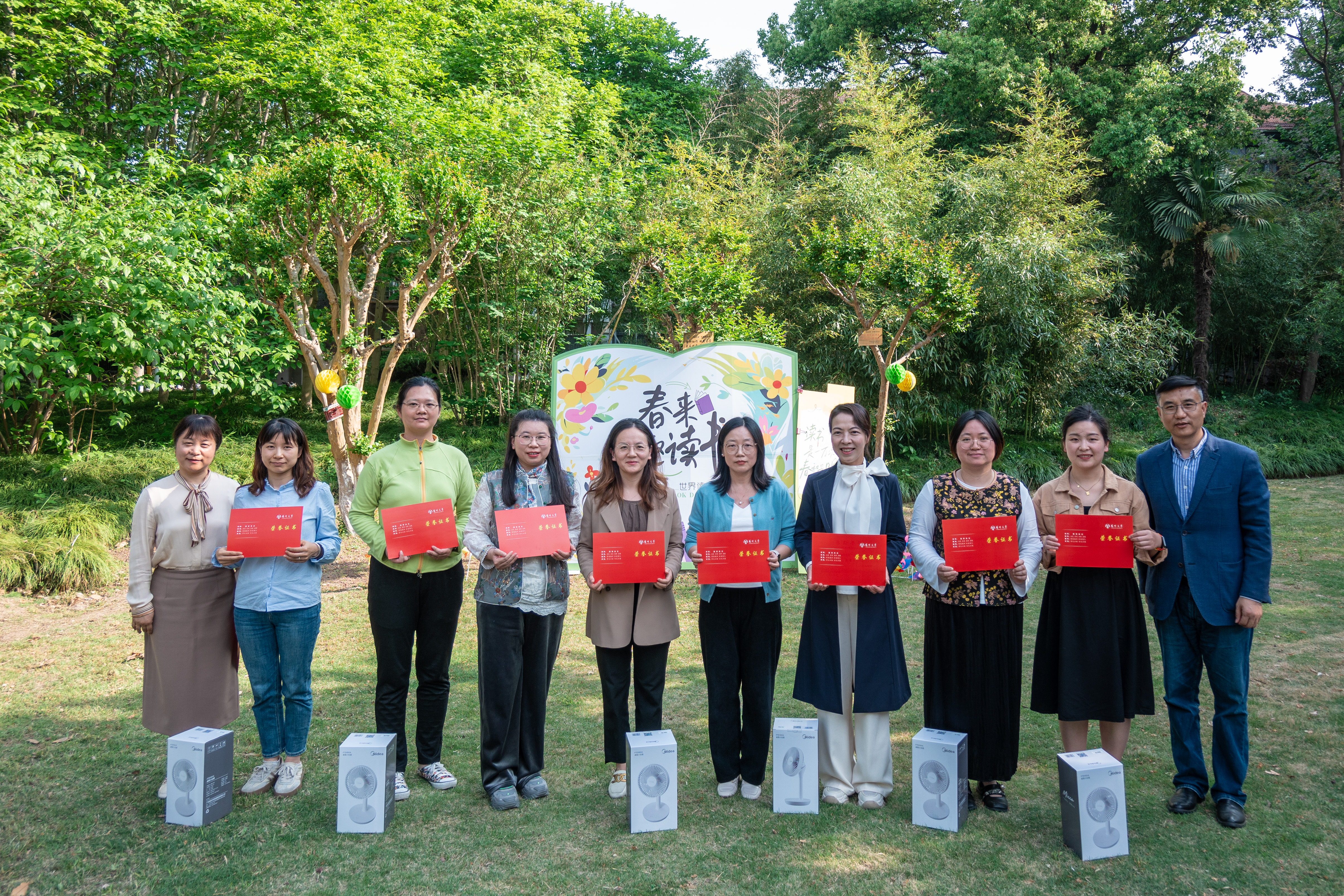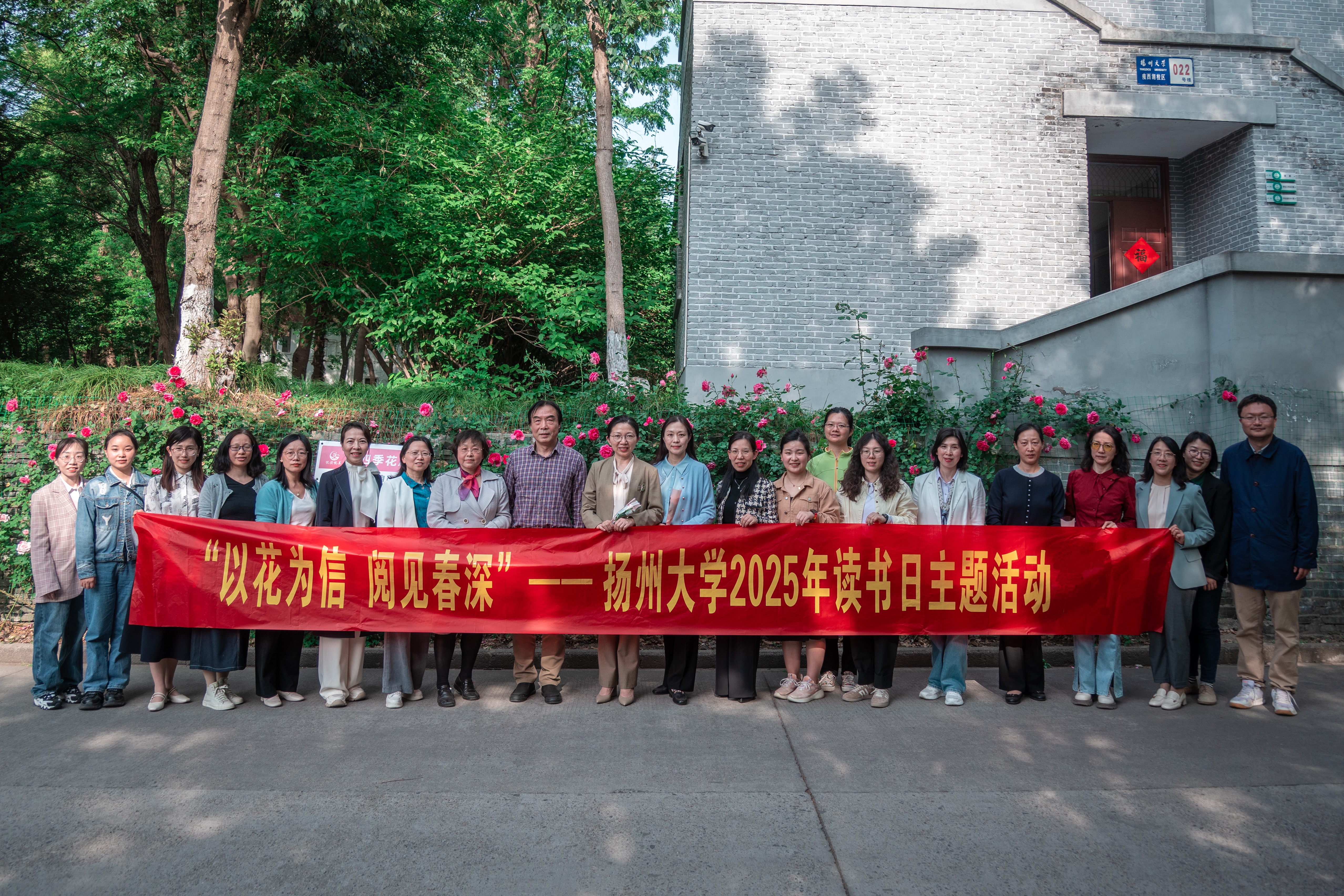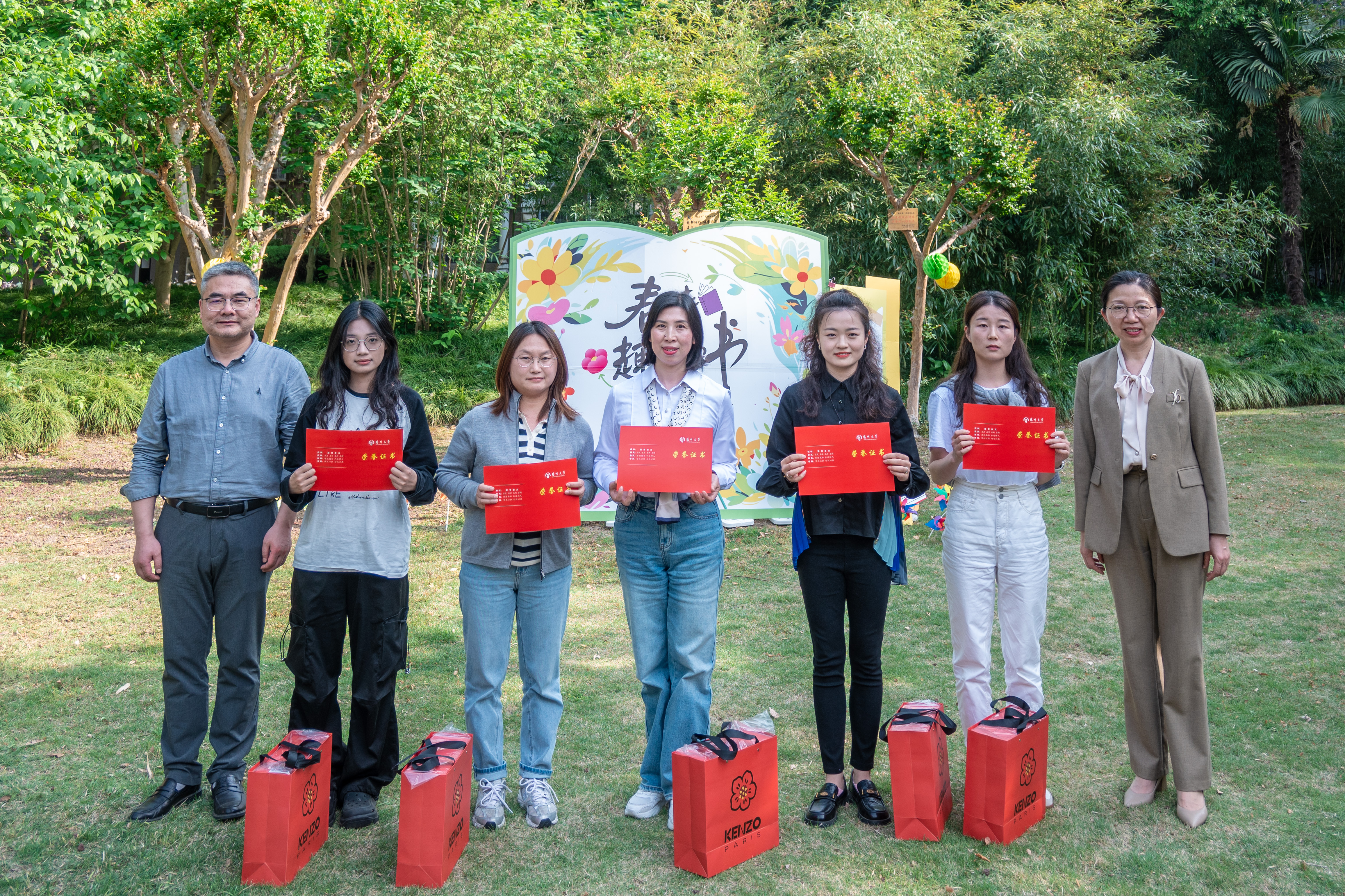 4月23日下午,由校工会主办、教职工阅读协会协办的“以花为信,阅见春深”世界读书日主题活动在敬文图书馆前草坪举行。校工会及文学院相关负责同志、校工会常委、教职工阅读协会会长以及协会成员、主题征文比赛获奖教师代表、文学院及教育科学学院(师范学院)(学前教育学院)师生代表等参加活动。