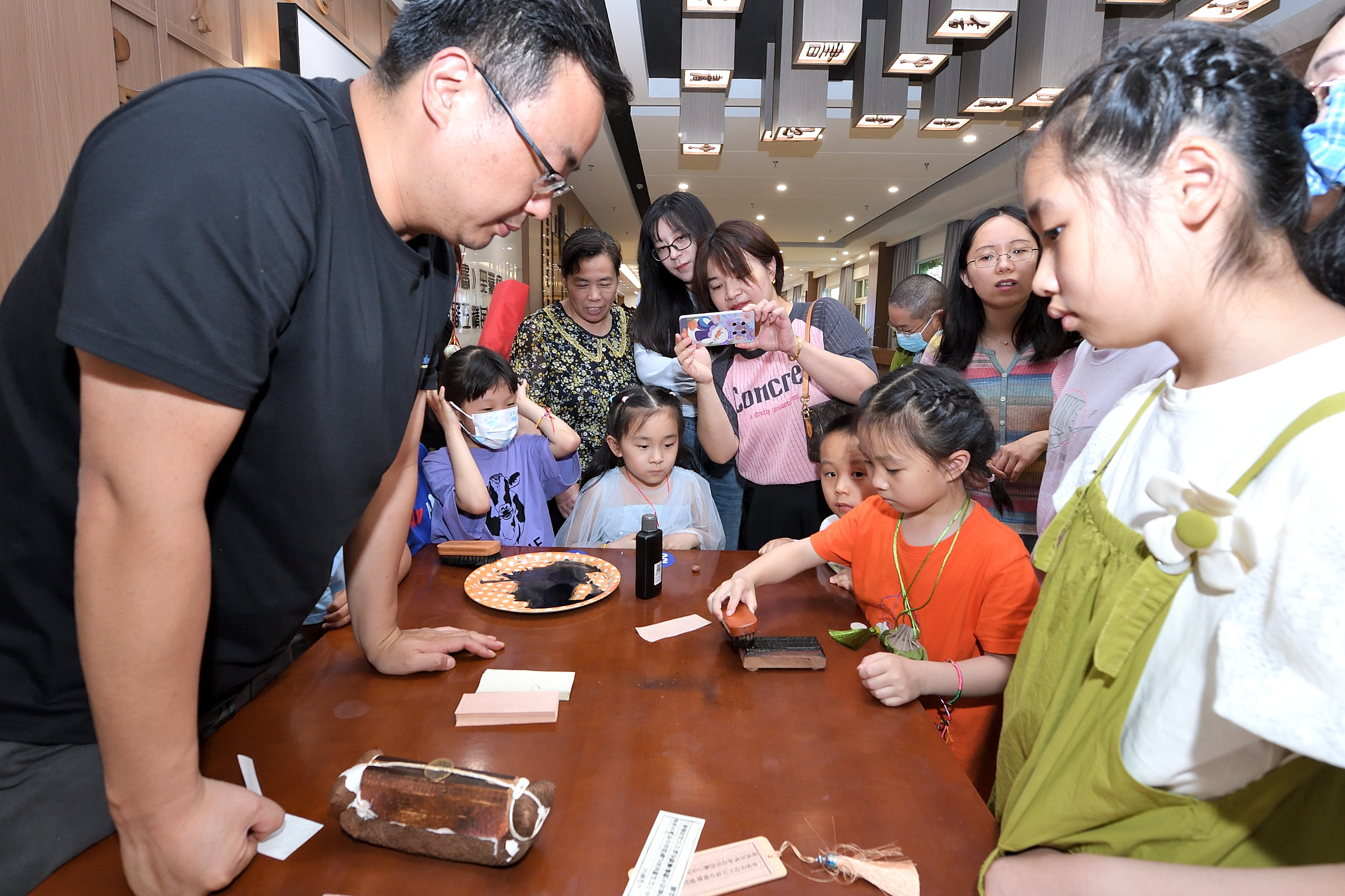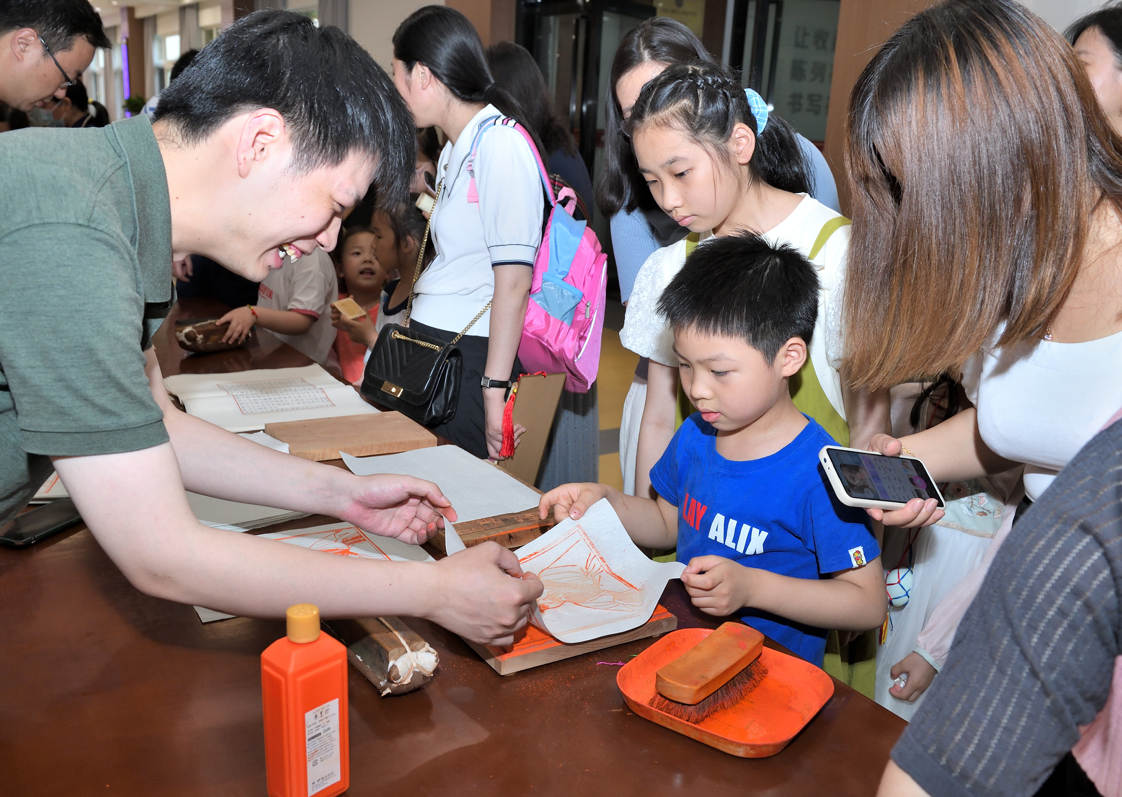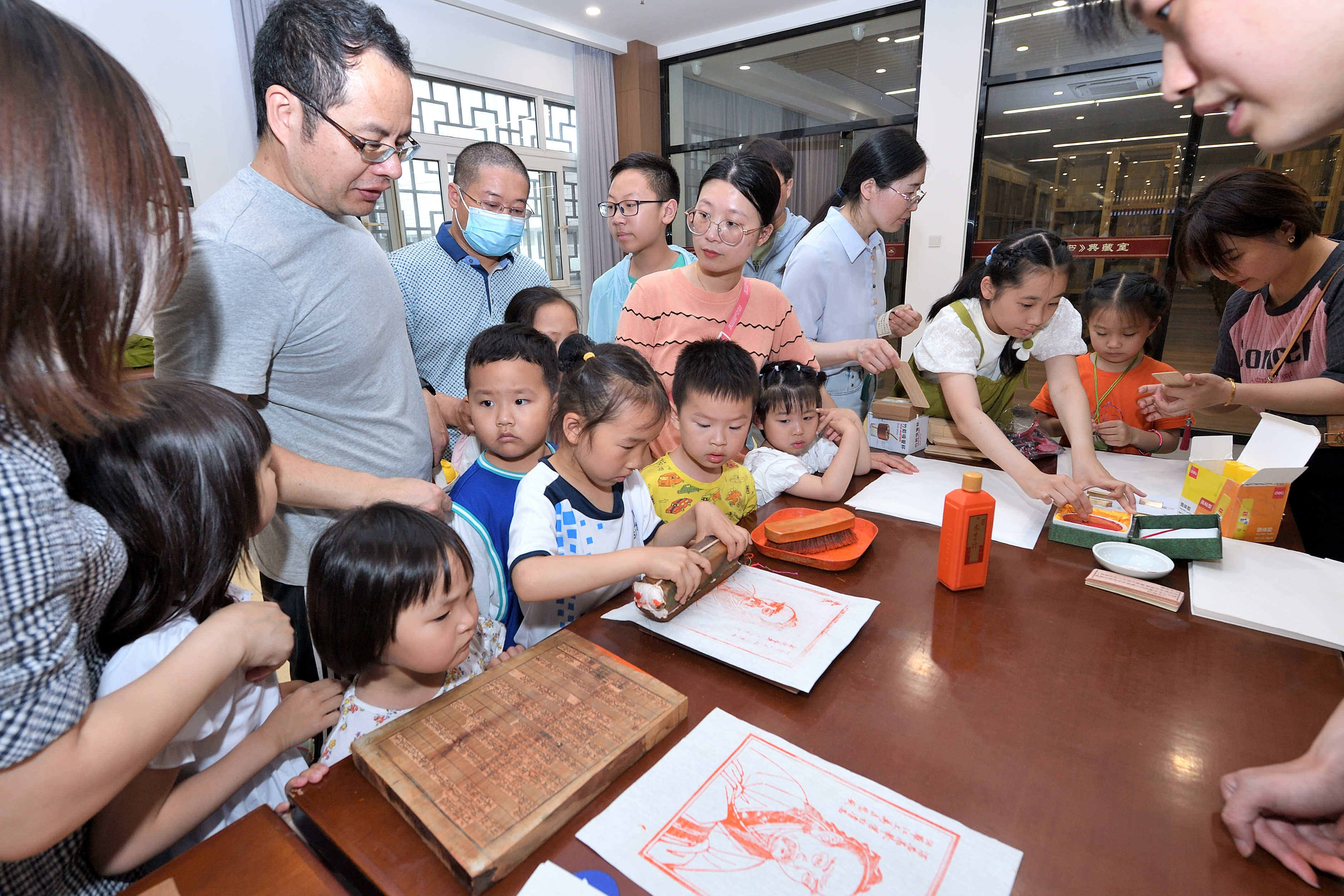 “印端午”环节,广陵古籍刻印社雕版技术省级非遗传承人为大家讲解了雕版印刷的流程,并带领孩子们进行了现场印刷体验,制作屈原像和古诗书签。现场所用雕版均跟据馆藏典籍雕刻而成,工艺精美,意蕴深远。
