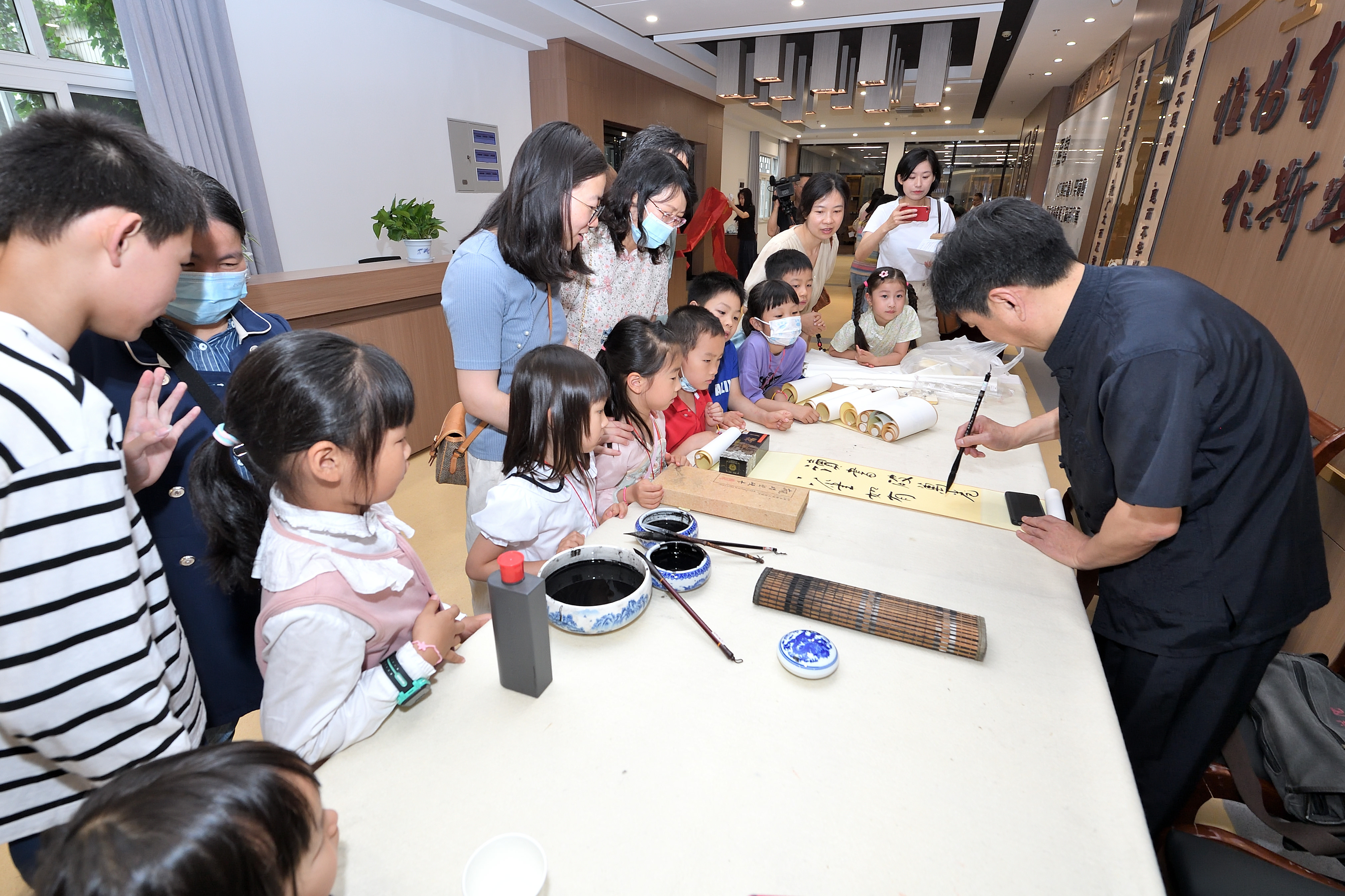 “书端午”环节,学校书画协会老师与活动现场的小朋友们一起书写端午相关诗词,并为爱好书法艺术的小朋友们量身创作了独一无二的寄语。