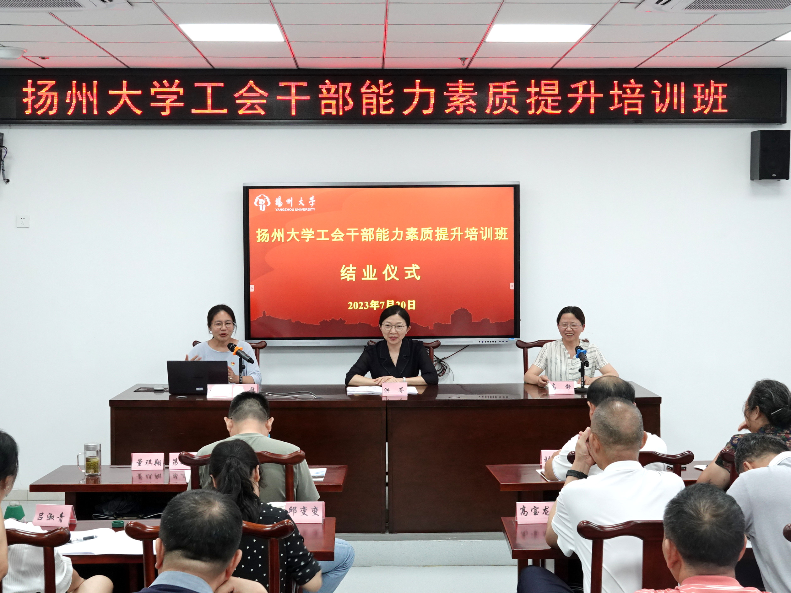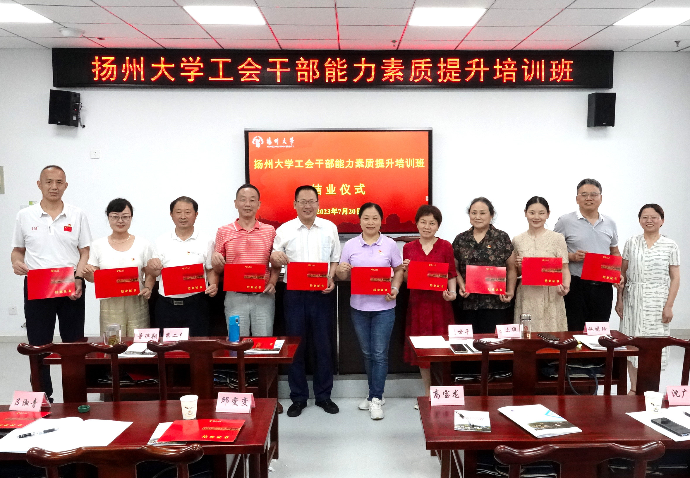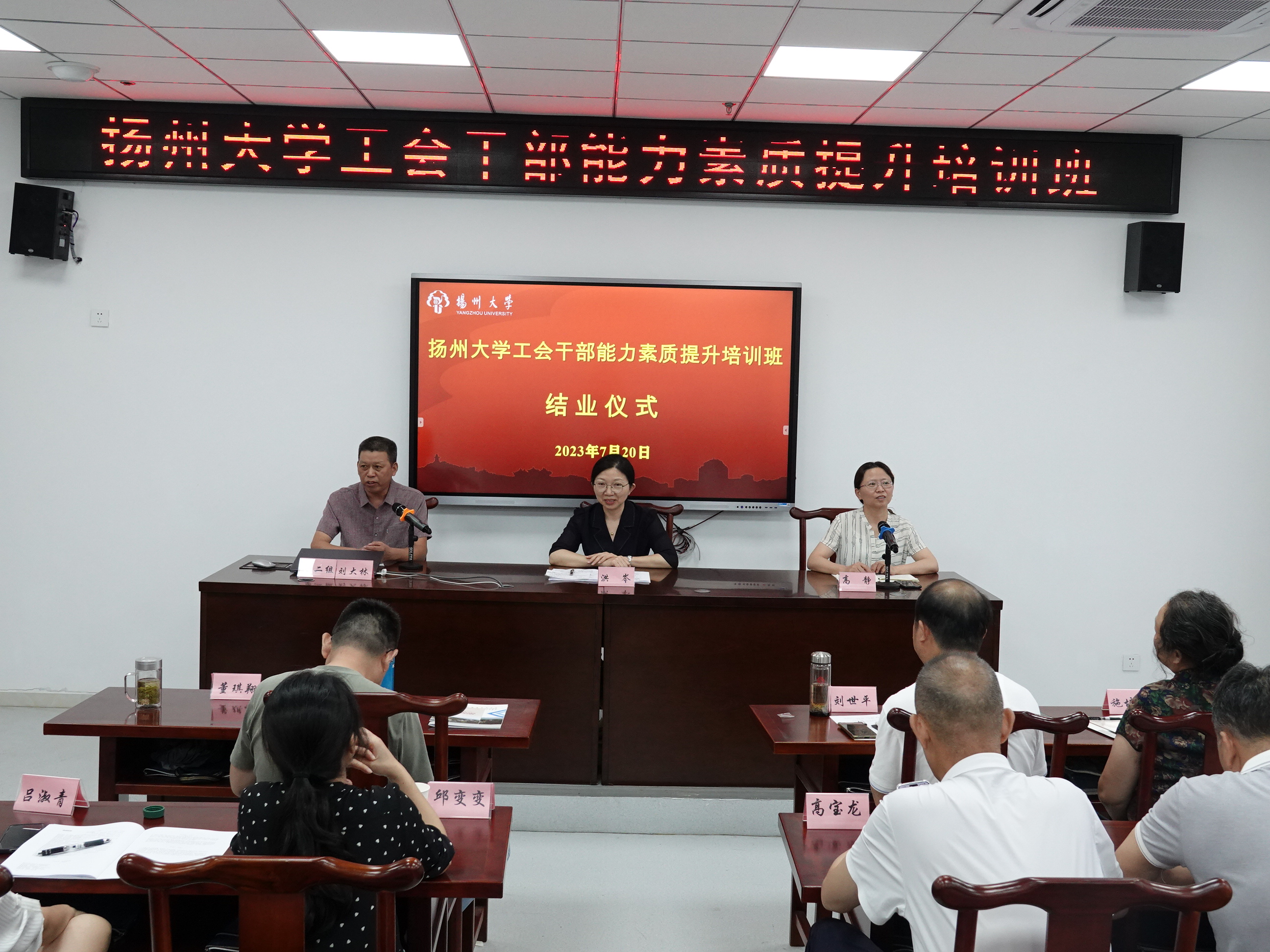 校工会主席洪岑、副主席高静为学员们颁发了结业证书。在总结讲话中,洪主席希望学员们通过培训学习,提高政治素质、拓展工作思路、创新工作方法、增进工作交流、凝聚工作合力、提升工作效能。“不日新、必日退”,要注重学习成果转化,把学习的内容真正落实到今后的工会工作中去。借此机会,洪主席还带领大家回顾了校工会上半年工作举措,部署了下半年重点工作,动员全体工会干部切实扛牢政治职责,维护教职工合法权益,竭诚服务教职工,彰显桥梁纽带作用,团结带领广大教职工以实干实绩为学校早日跻身国家“双一流”建设高校行列,奋力谱写高水平研究型大学建设现代化新篇章贡献工会力量。