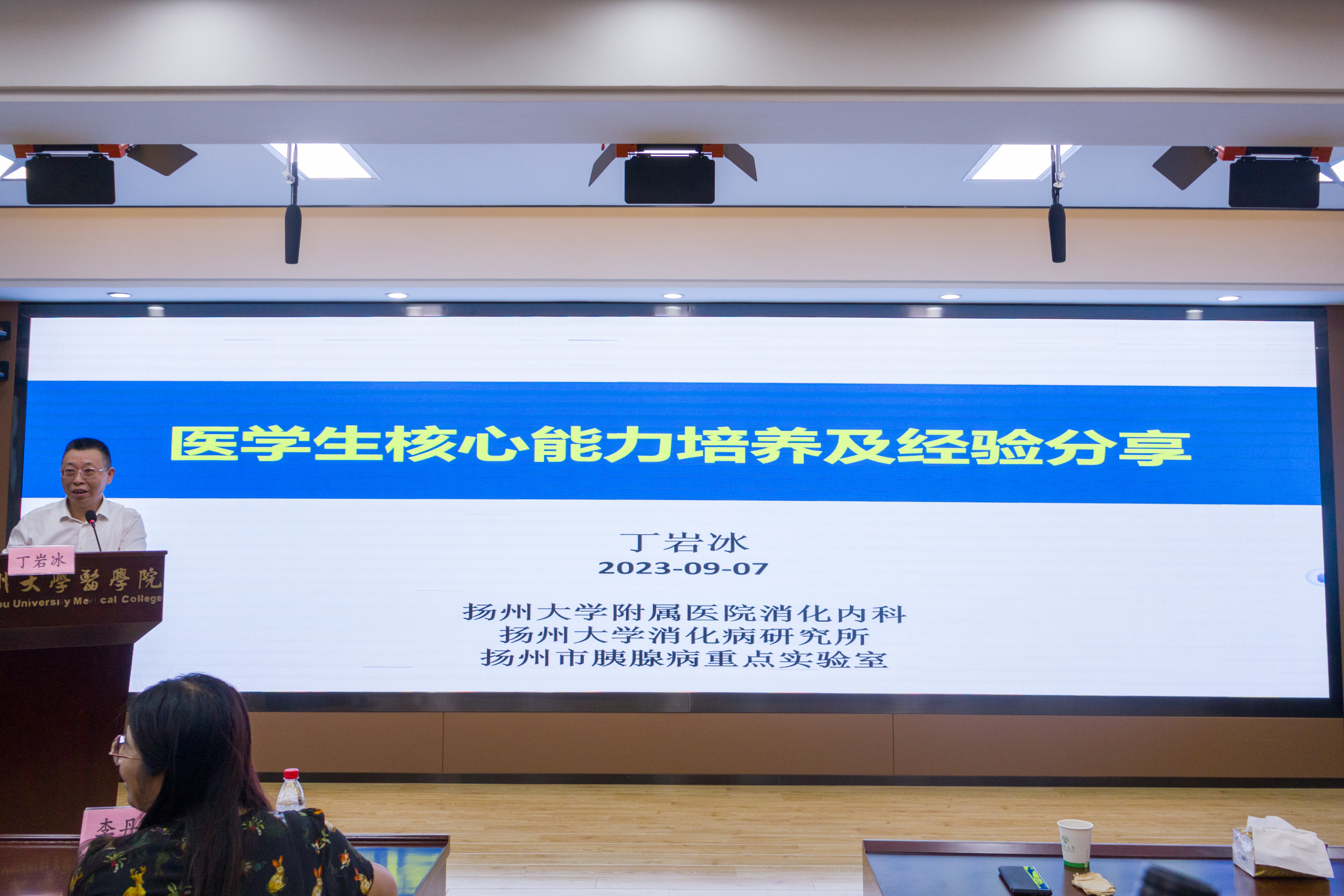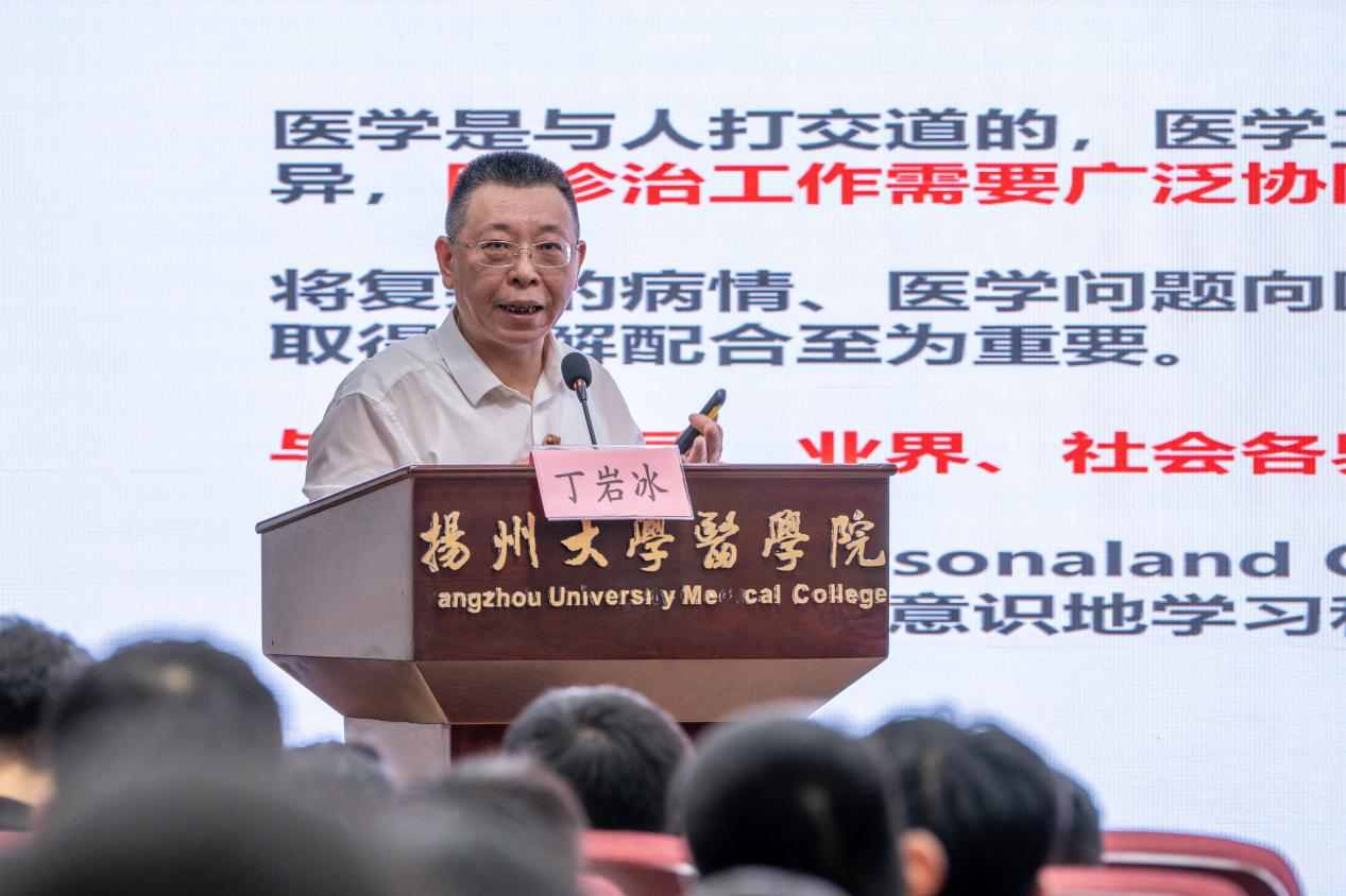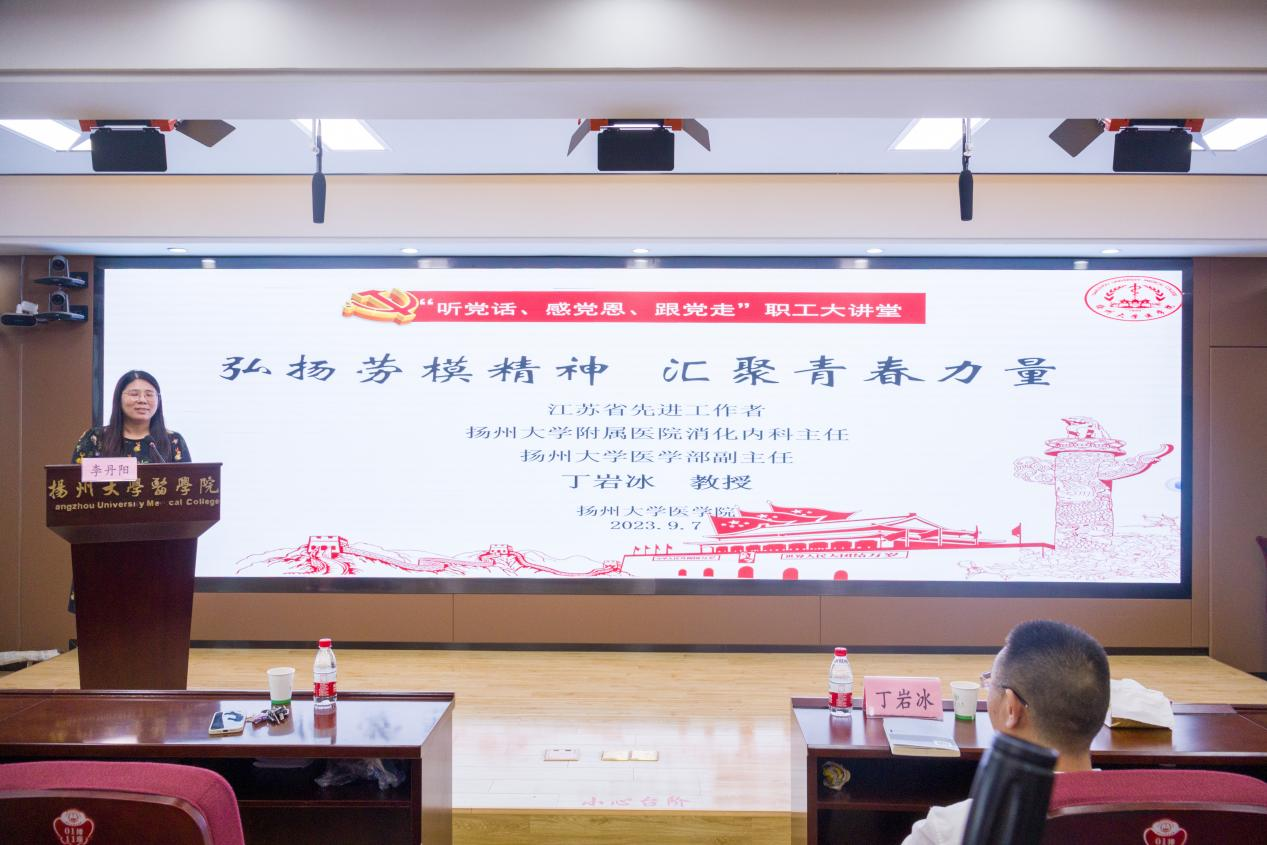9月7日下午,医学院邀请江苏省先进工作者、扬州大学医学部副主任、扬州大学附属医院消化内科主任丁岩冰教授,在江阳路北校区5号楼401报告厅为2023级新生作题为“弘扬劳模精神,汇聚青春力量”的主题讲座。丁岩冰教授结合生动案例,向大家讲授医生应该必备的六大核心能力,并从学涯、职涯两方面与大家分享自己从医之路和人生感悟,鼓励同学们不忘初心,努力追求个人理想,厚植家国情怀,勇挑时代重担,坚韧不拔在求医之路走下去,不断为增进人民健康作出自己应有贡献。