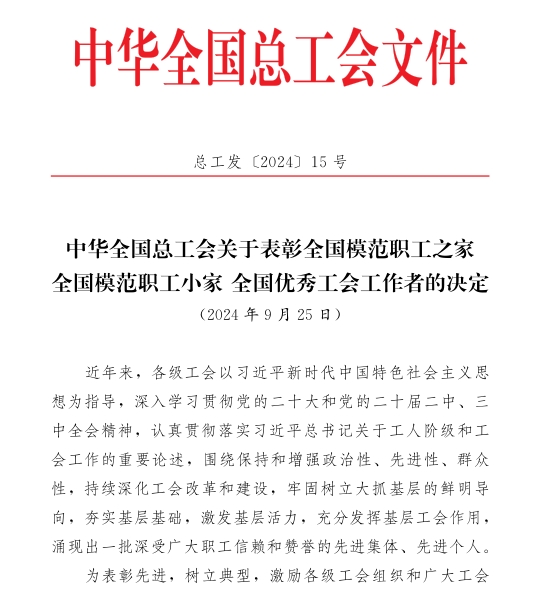 近日,中华全国总工会发布了《中华全国总工会关于表彰全国模范职工之家全国模范职工小家全国优秀工会工作者的决定》,我校后勤保障处工会小组被授予“全国模范职工小家”荣誉称号。