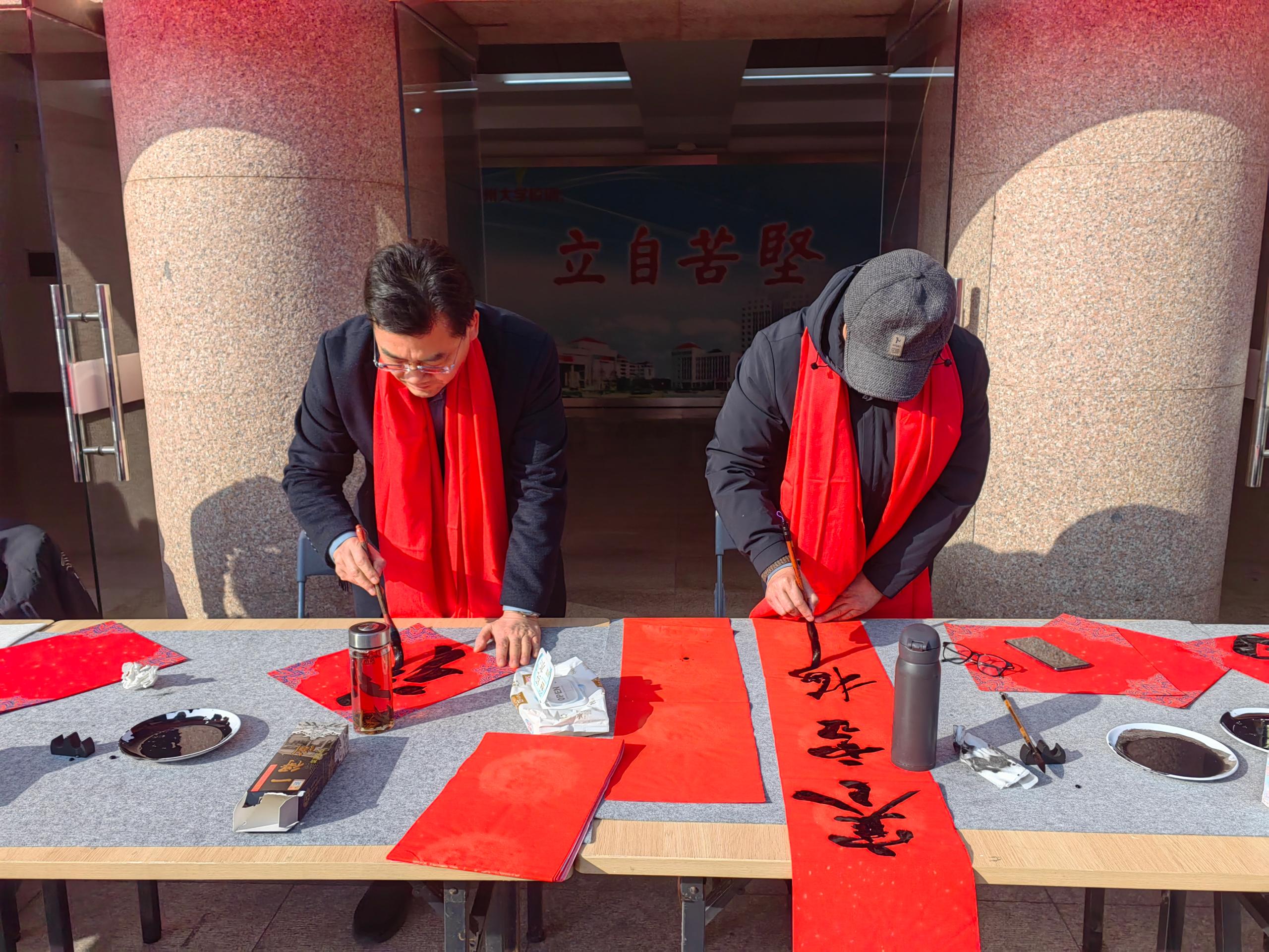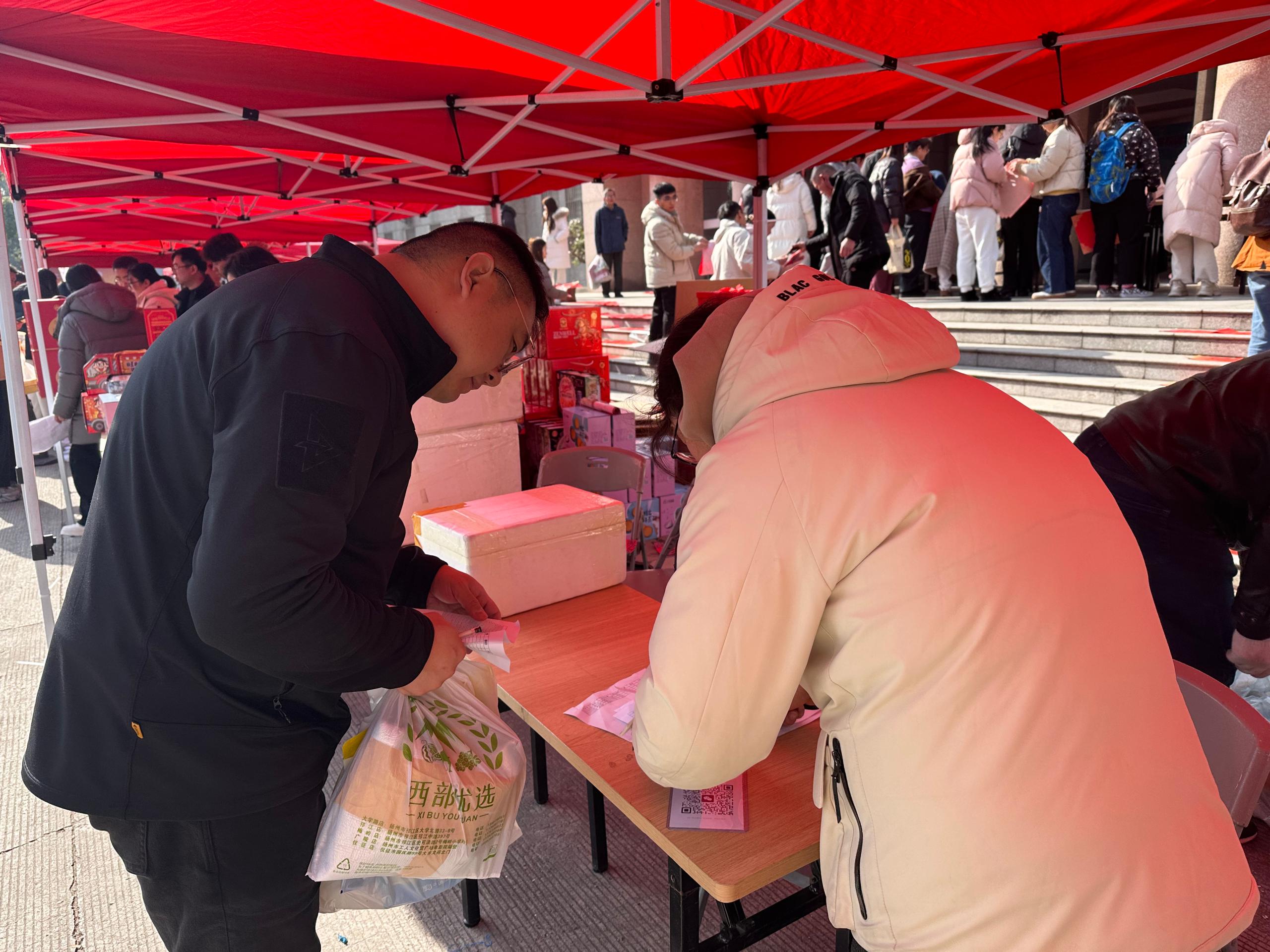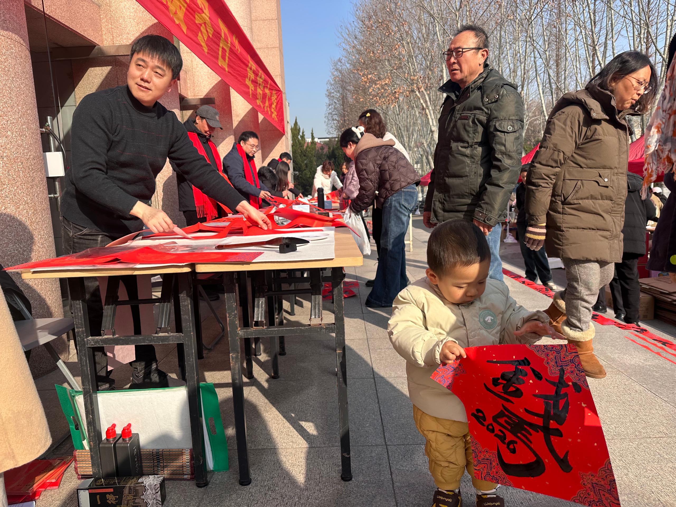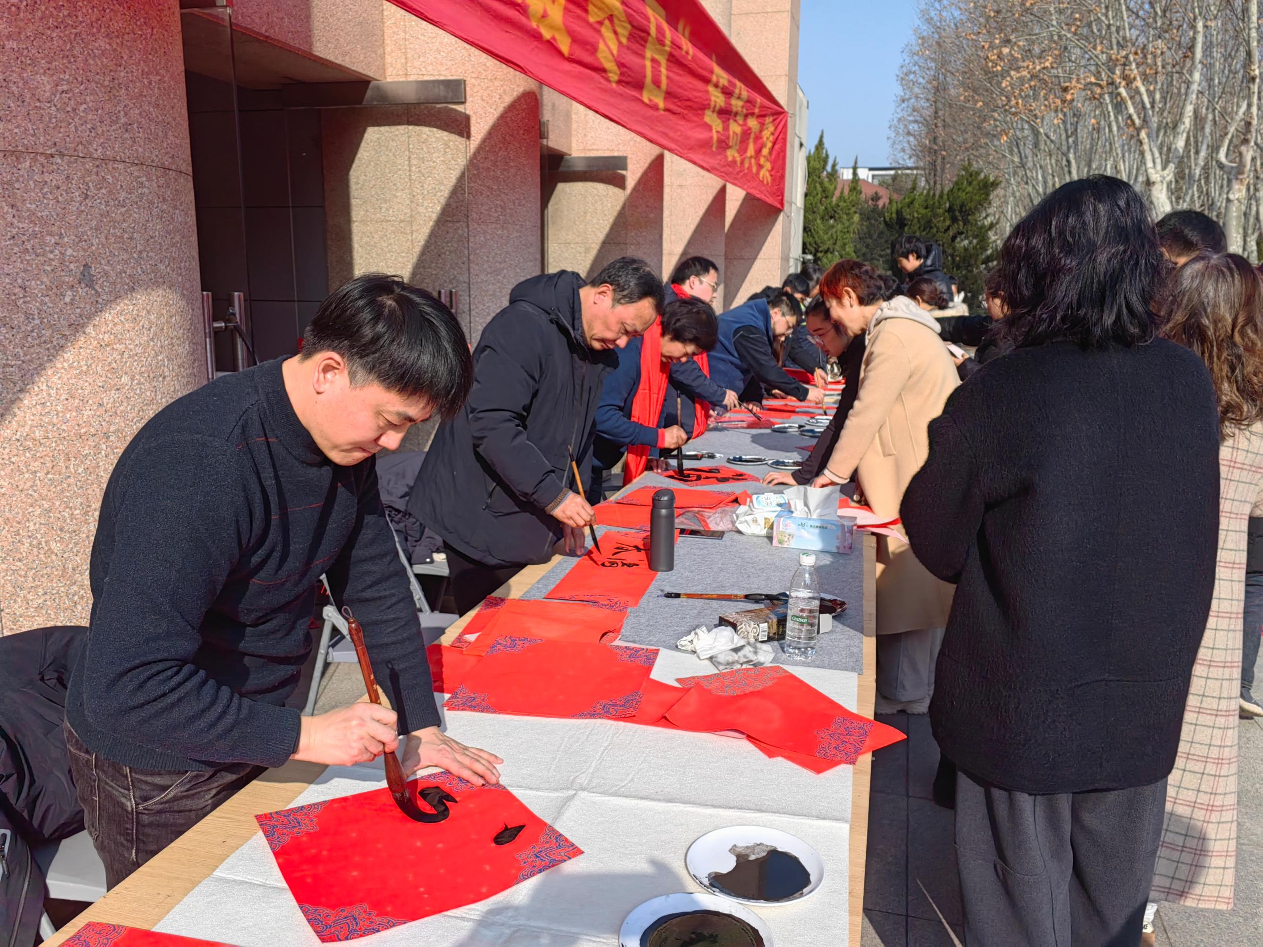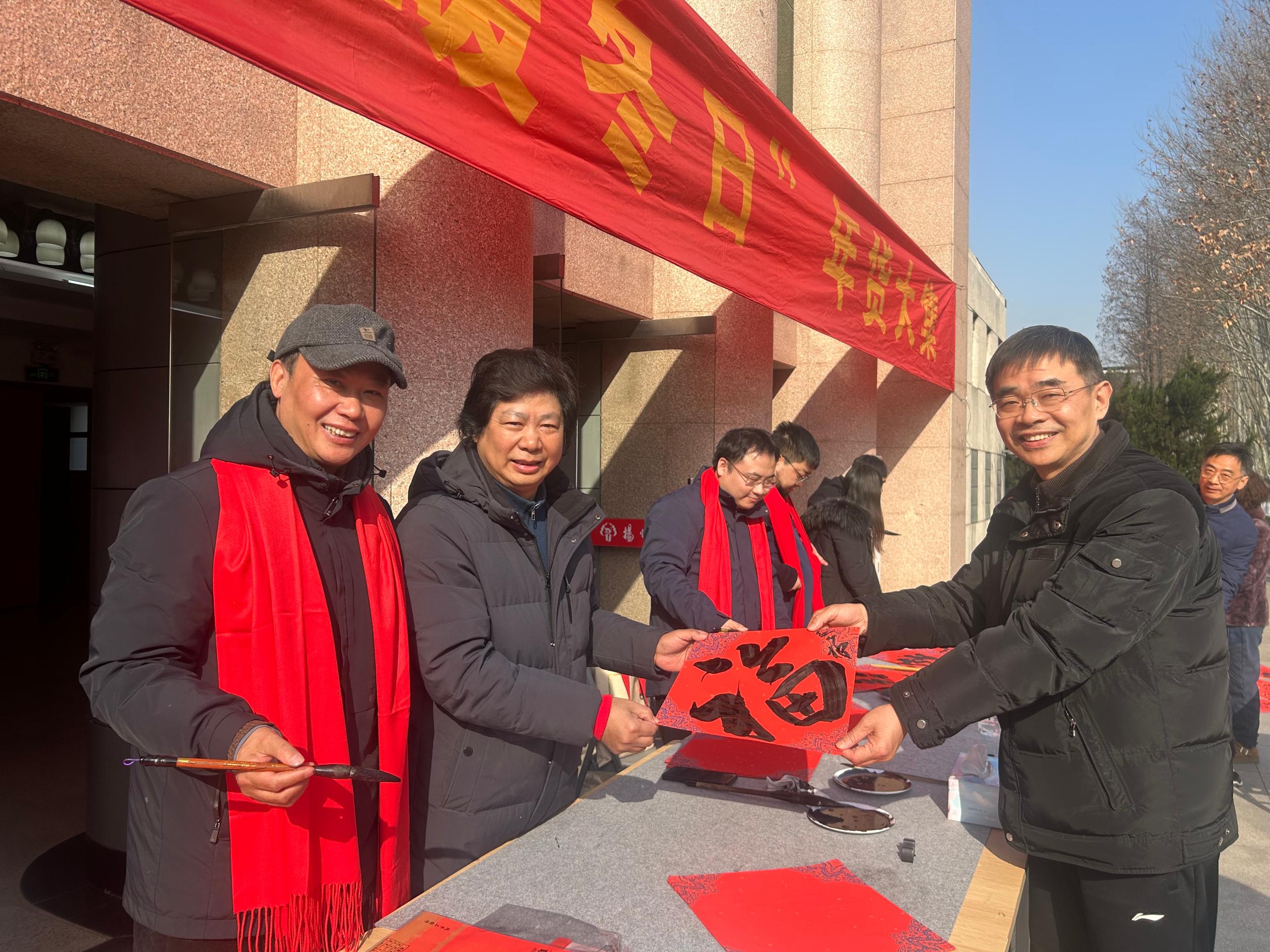 本次年货大集组织了近300种货品供教职工选购,活动现场提供线上订购货品领取服务,校工会工作人员担任“导购”,帮助教职工顺利提货并现场解答教职工咨询。校工会还特别策划了“送福·迎春”主题活动,邀请教职工书画协会的老师们现场挥毫。墨香氤氲的桌案旁,老师们笔走龙蛇,起笔、行笔、收笔间尽显功力,为前来“请福”的教职工量身定制饱含美好期许的福字与春联。一张张喜庆的福字、一副副吉祥的春联,不仅传递着书法艺术的魅力,更将对新年的祝福精准送达教职工心中。