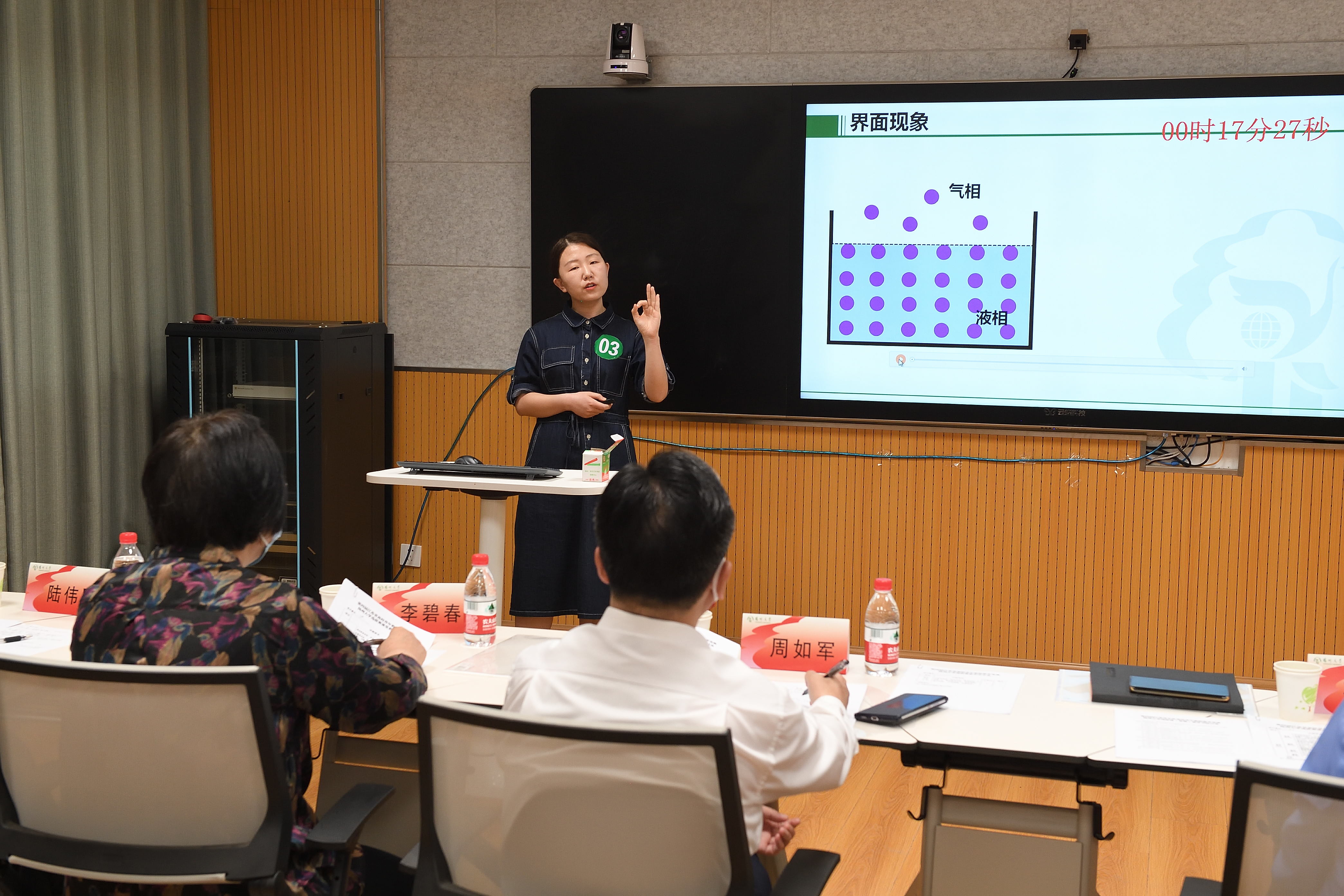 复赛参照省赛流程进行全模拟式竞赛,采取无生授课形式,对6位参赛教师的现场课堂教学、教学反思等进行综合评分。复赛评委由校党委常委、副校长周如军,国家级教学名师、动物科学与技术学院教授李碧春,第三届省青教赛评委、人事处处长、党委教师工作部部长孙鹏,二级教授、财务处处长陆伟刚,教务处处长王承堂等五位专家担任。选手们在赛前提交了与10个学时相对应的10个课堂教学节段的PPT,竞赛当天,选手现场抽取1个教学节段进行课堂教学展示。讲课过程中,他们各显其能,充分展示了饱满的教学热情、得体的教学仪态和扎实的教学功底。课堂教学结束后,选手针对授课内容当堂进行教学反思,总结教学的长处及需要改进的地方。