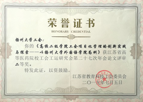 会议围绕“贯彻落实习近平总书记在学校思想政治理论课教师座谈会上的重要讲话精神,不断提升省内高等医药院校工会干部思想政治工作水平和业务工作水平,积极探索新时代工会工作的新思路、新方法”主题进行了充分交流。在此次工会工运研究会提交的论文评比中,我校推荐的论文《高校二级学院工会项目化管理的创新实践与探索---以扬州大学外国语学院为例》荣获二等奖,受到会议的表彰。