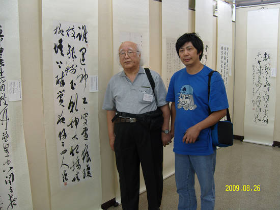 在展览上,他的自作诗《雪夜醉赏》书法作品引人注目,日方展览最高组织者山本千洞尤为喜爱,握着他的手在作品前合影。