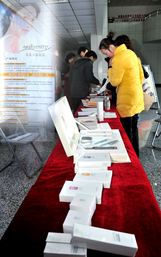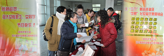 3月10下午,为庆祝“三八”国际劳动妇女节,校工会与扬大联环药业基因工程公司联合在中心校区大学生活动中心一楼大厅举办了美容咨询、化妆品试用及特惠展销活动。活动现场,广大女教职工满怀希望纷纷前来咨询、试用、选购,最后她们都满意而归。
