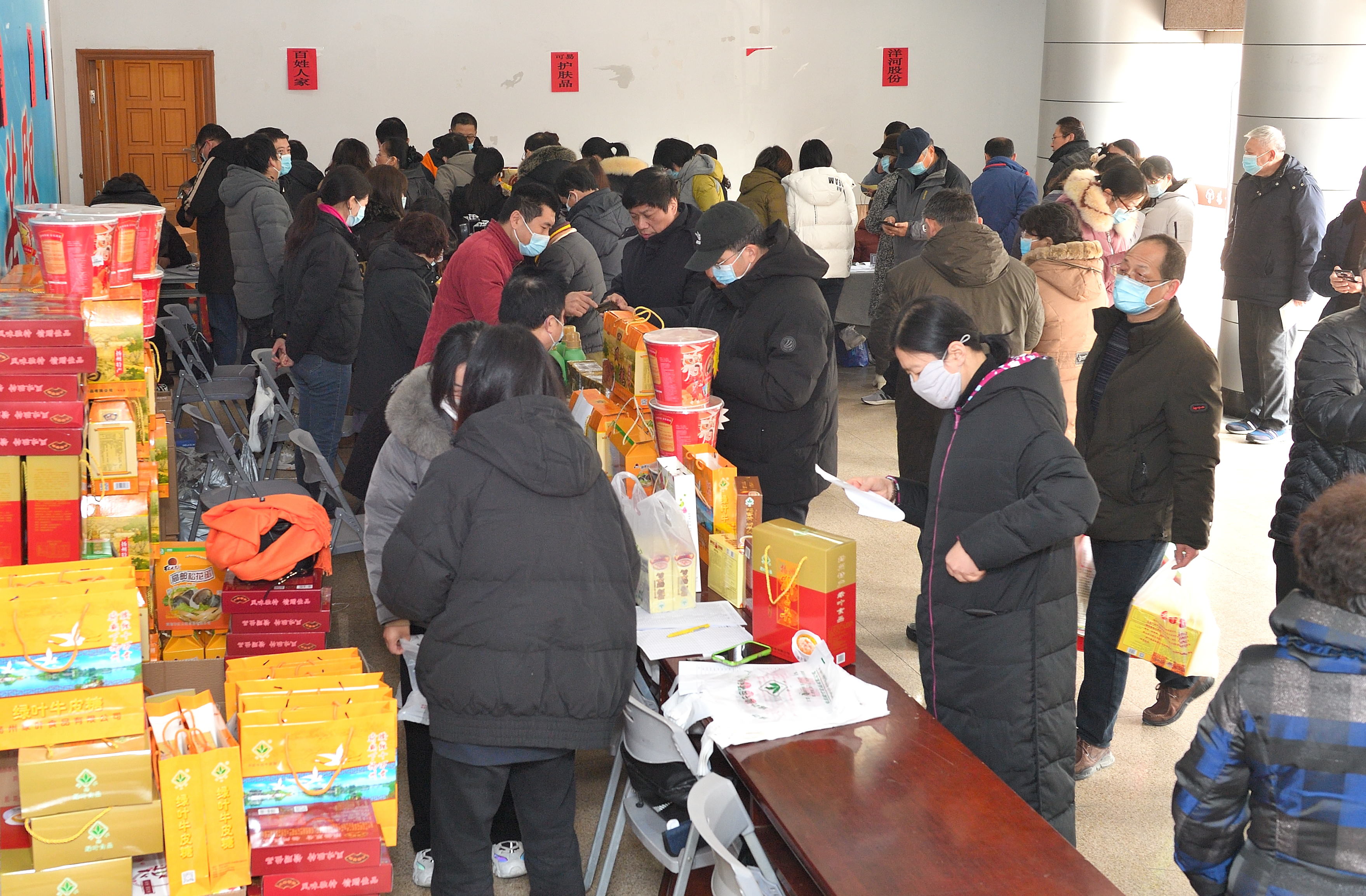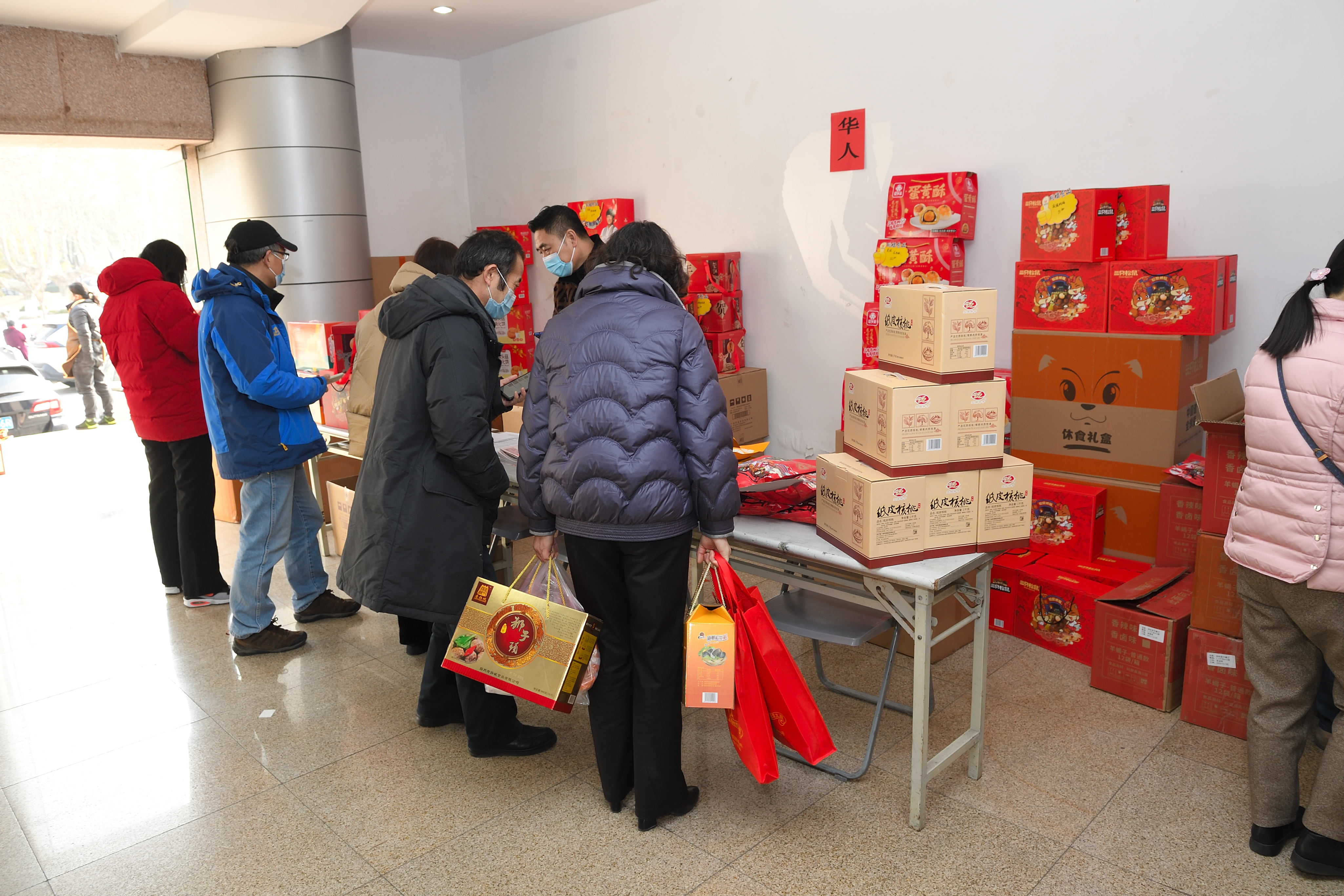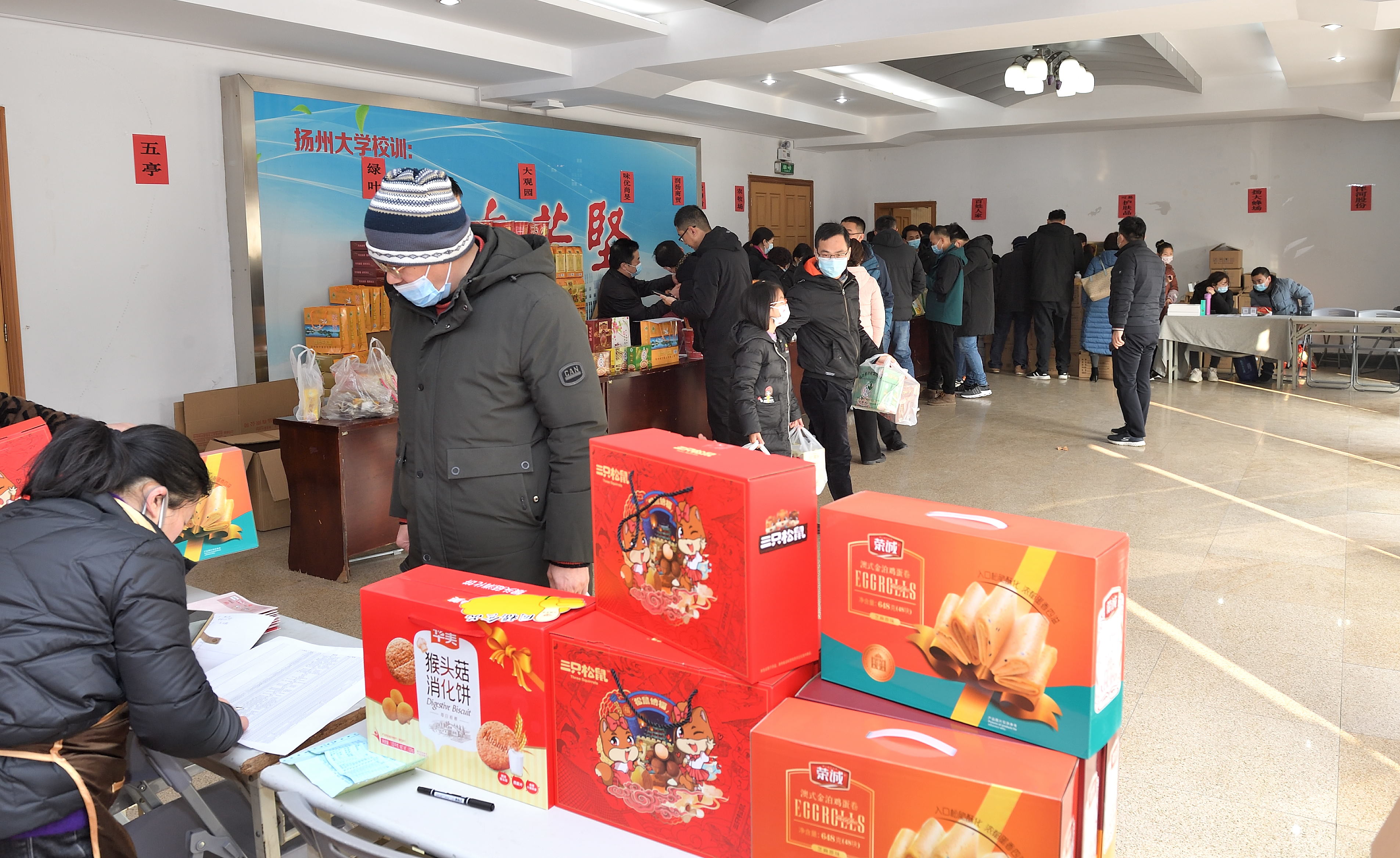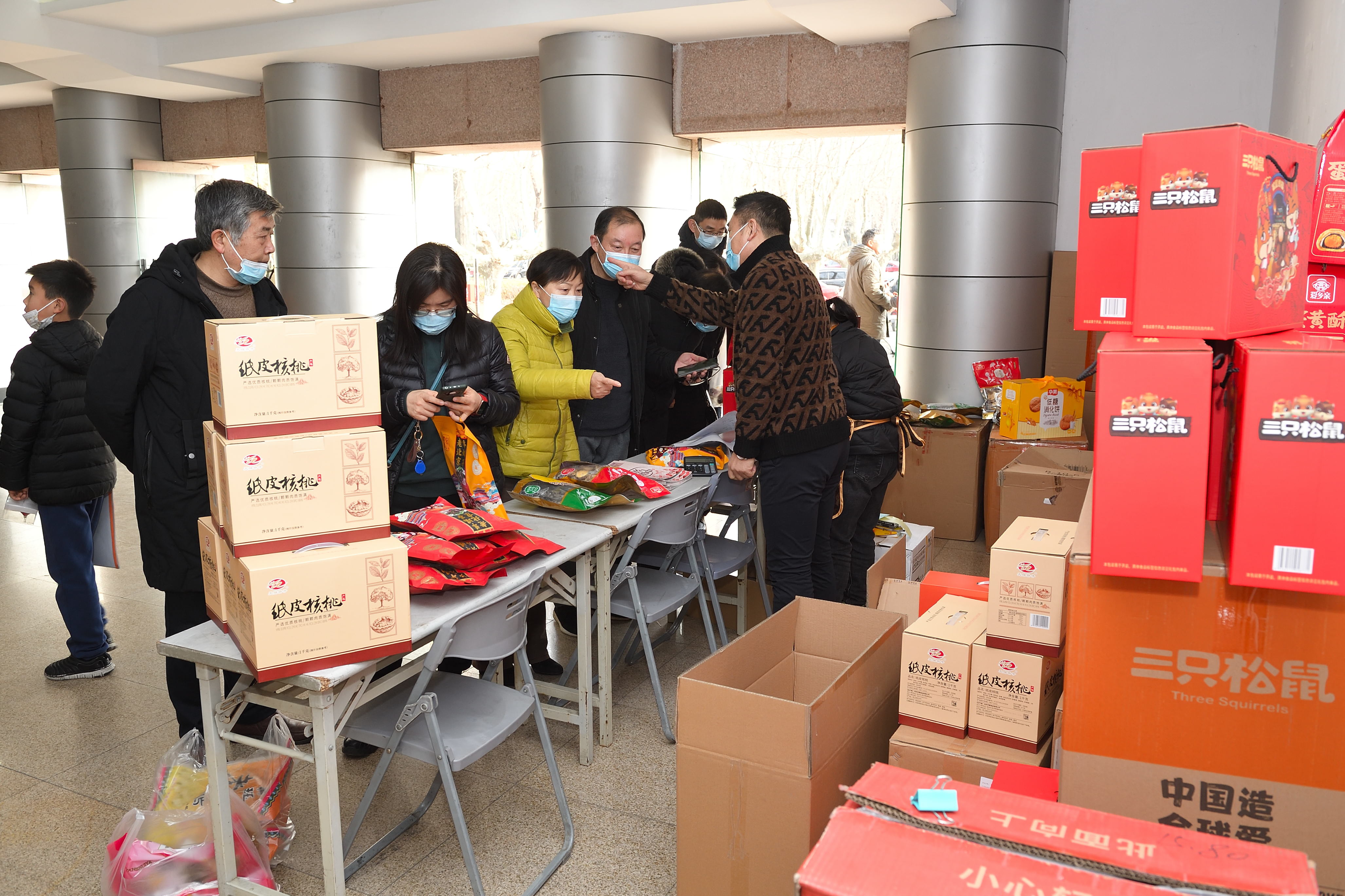 1月18日,校工会在文汇路校区大礼堂门厅举办团购服务日第三期——2022年春节年货小集市。活动现场除了提供线上订购货品领取服务,还提供线下购物服务。校工会全体工作人员担任“导购”,帮助教职工顺利提货、现场咨询并指导线上下单。