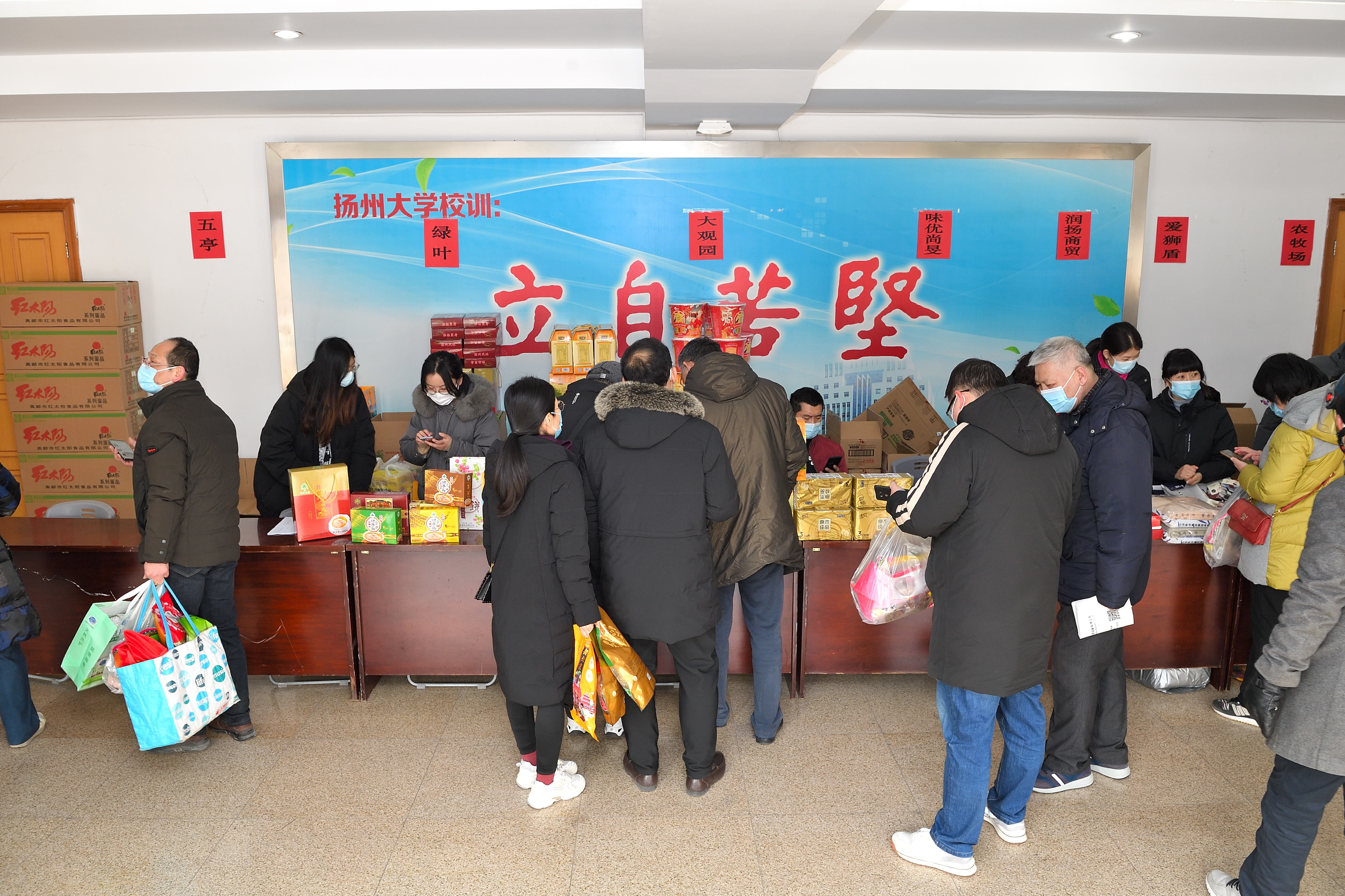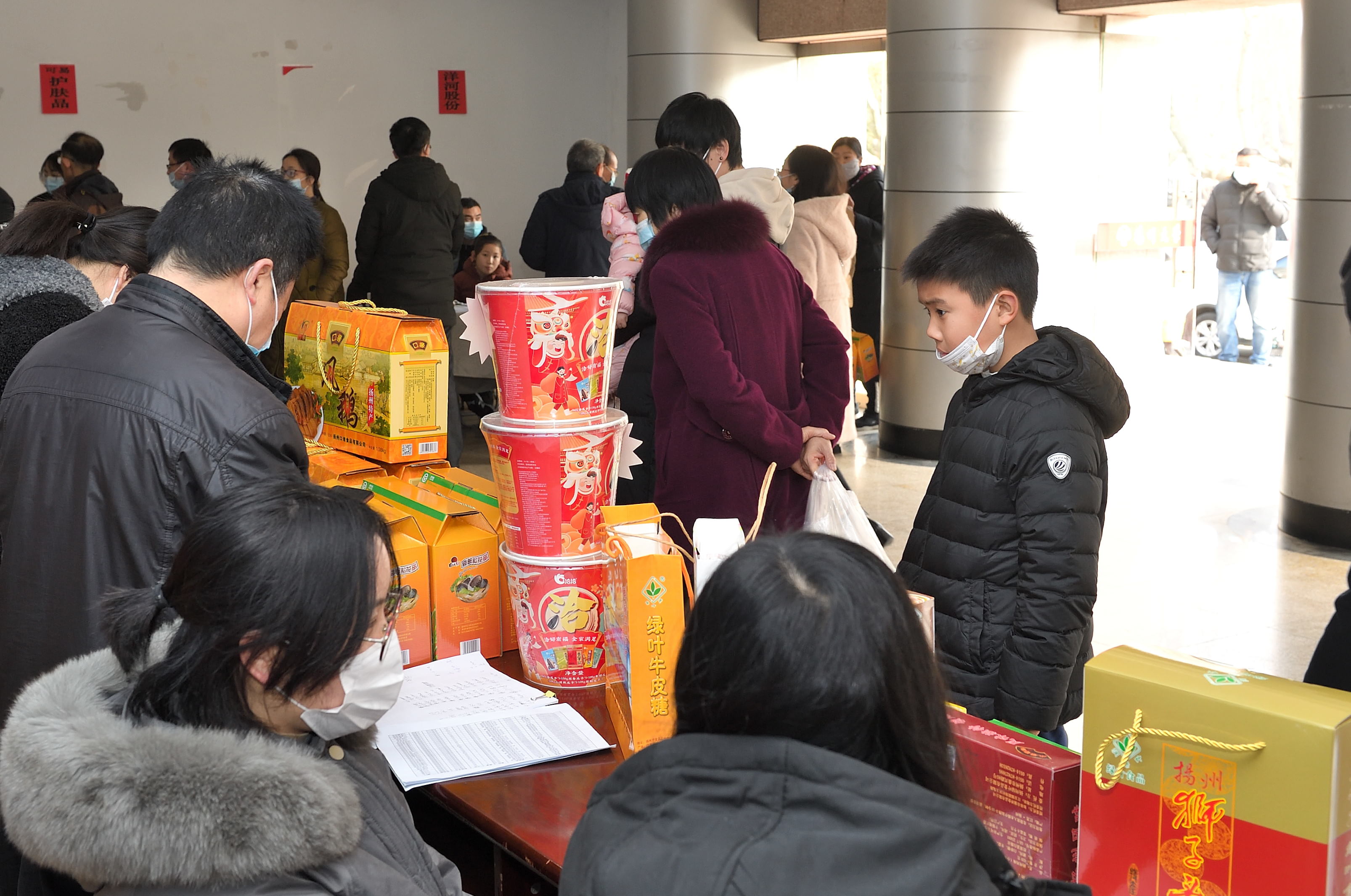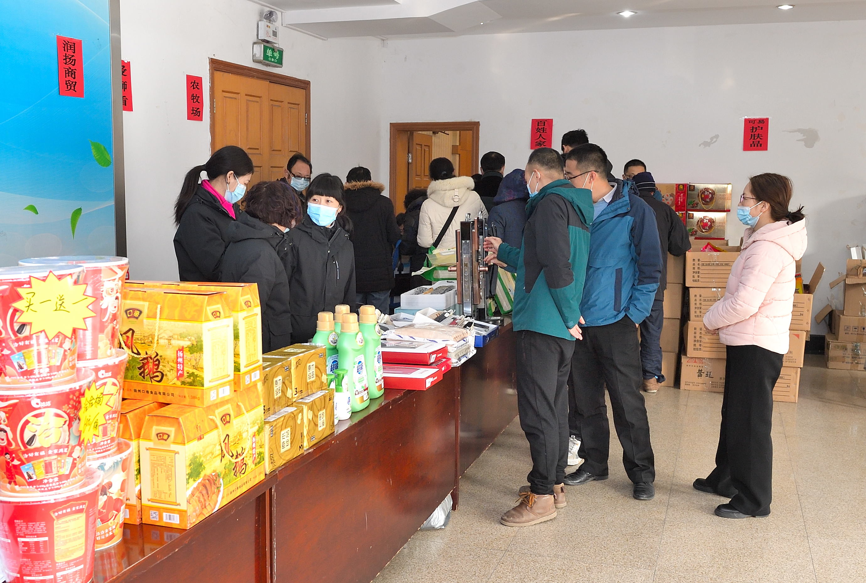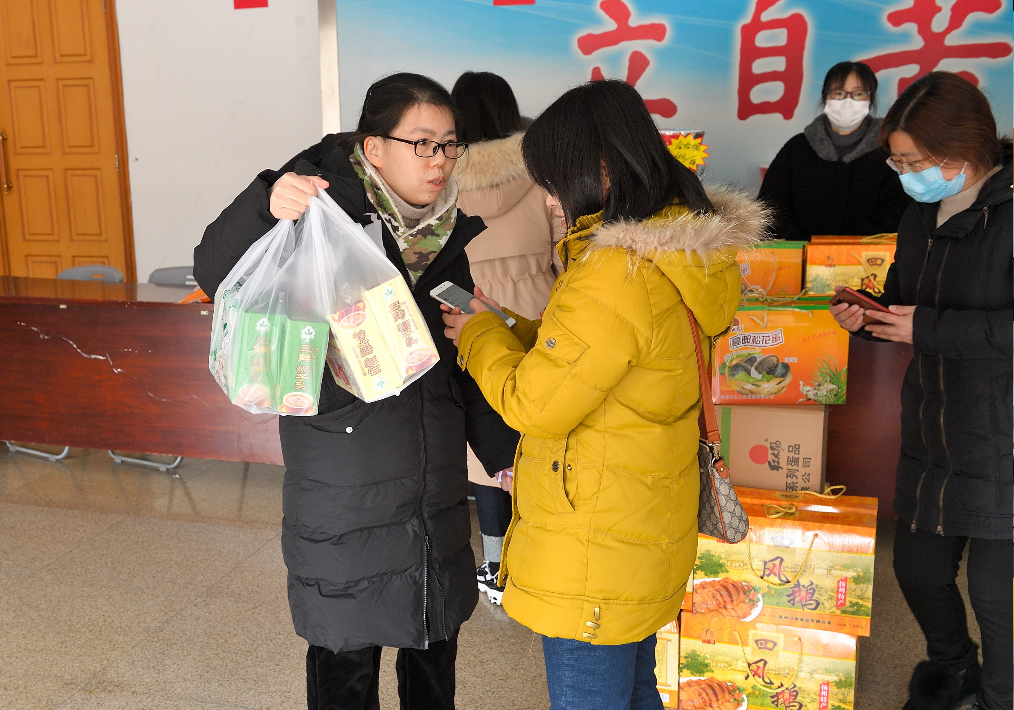 1月18日,校工会在文汇路校区大礼堂门厅举办团购服务日第三期——2022年春节年货小集市。活动现场除了提供线上订购货品领取服务,还提供线下购物服务。校工会全体工作人员担任“导购”,帮助教职工顺利提货、现场咨询并指导线上下单。