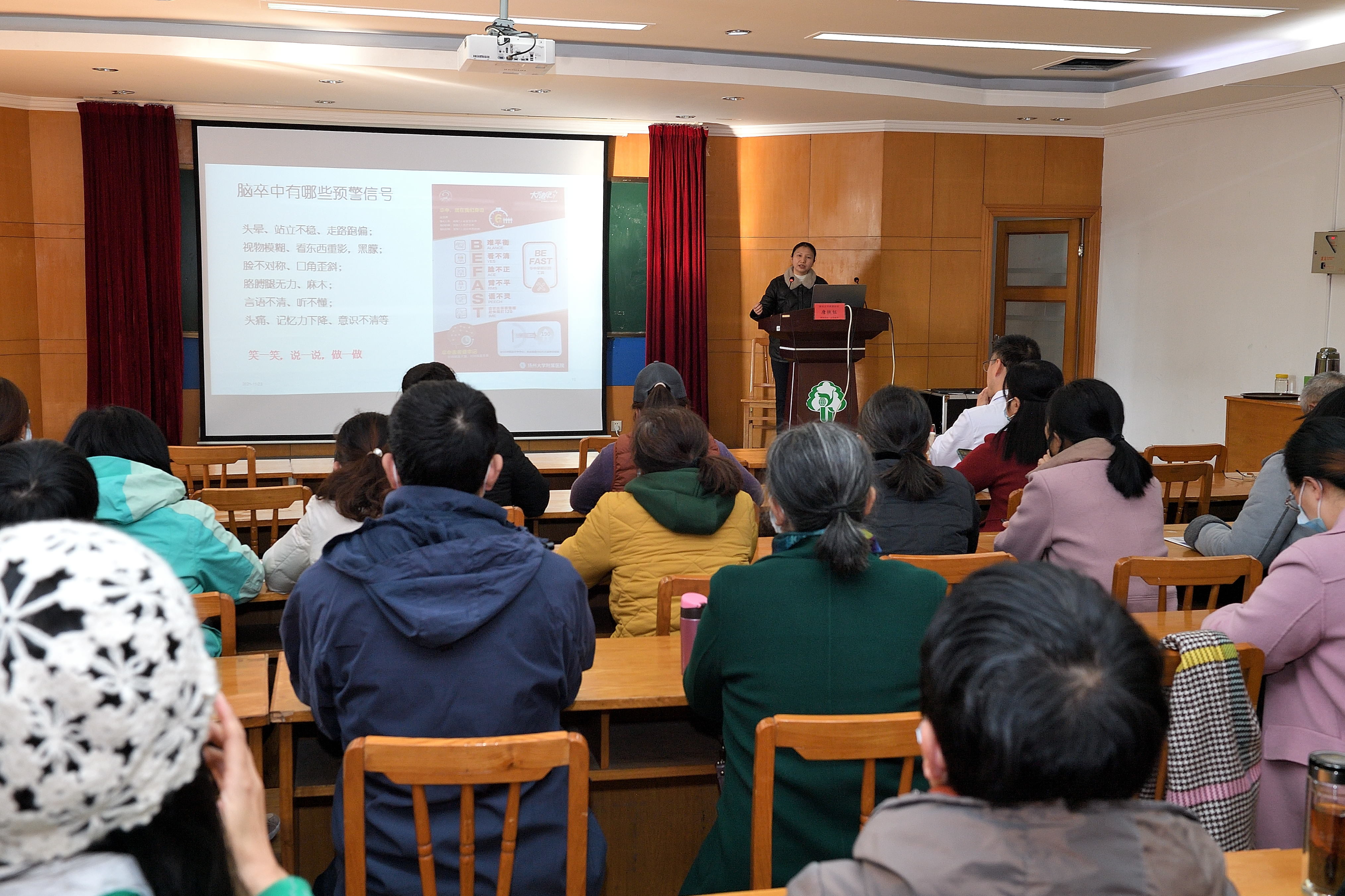 唐铁钰主任重点讲授了《脑卒中的识别与预防》,她用通俗易懂的方式讲解了“什么是脑卒中”“发生脑卒中怎么处理”“如何预防脑卒中”等知识点。通过讲座,教职工们了解了脑卒中的预警信号、“中风120口诀”、如何预防脑卒中等医学常识,明白了健康的生活方式、定期体检筛查的重要性。唐主任还根据现场老师的提问,普及了“低密度脂蛋白”等体检指标的临床意义。