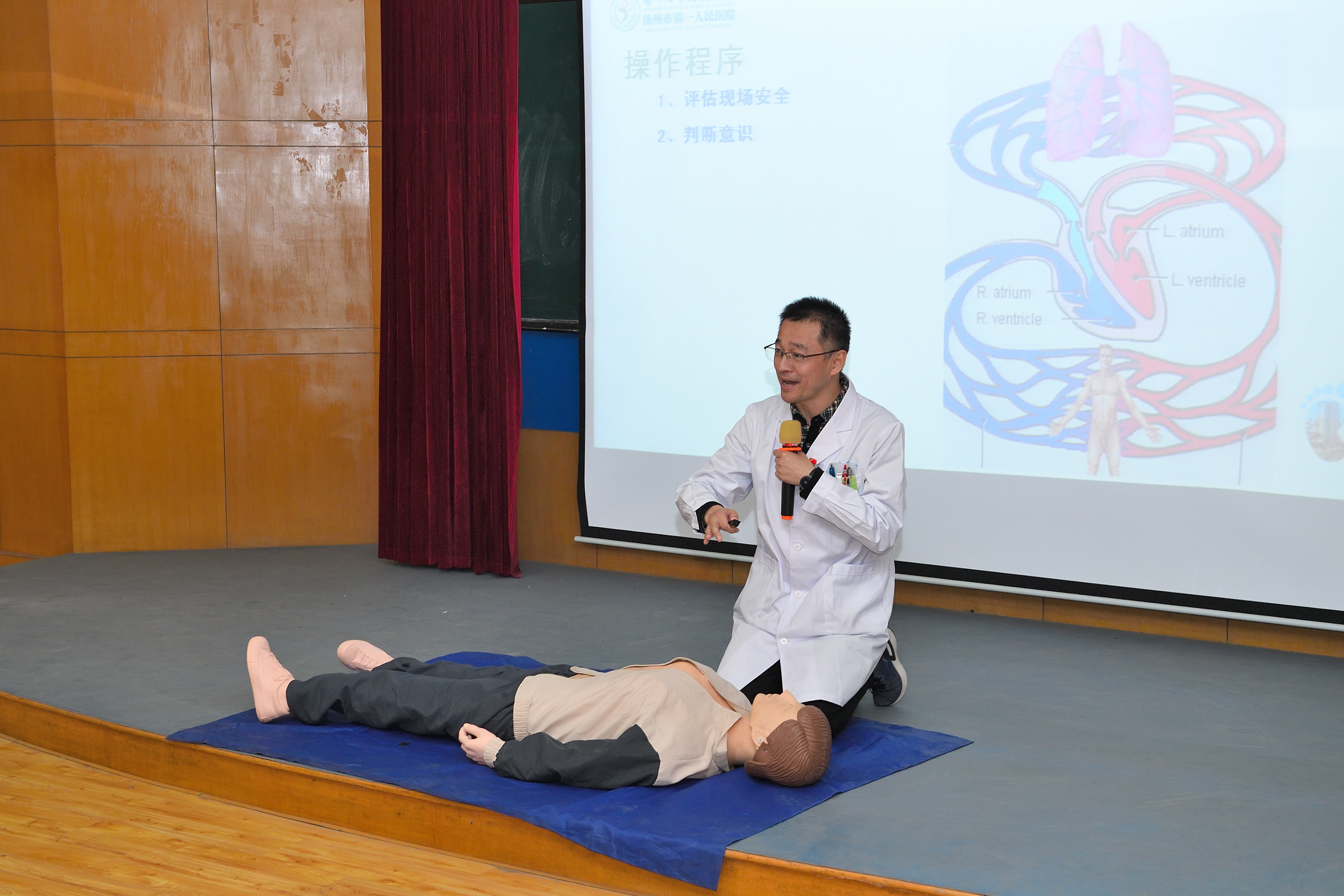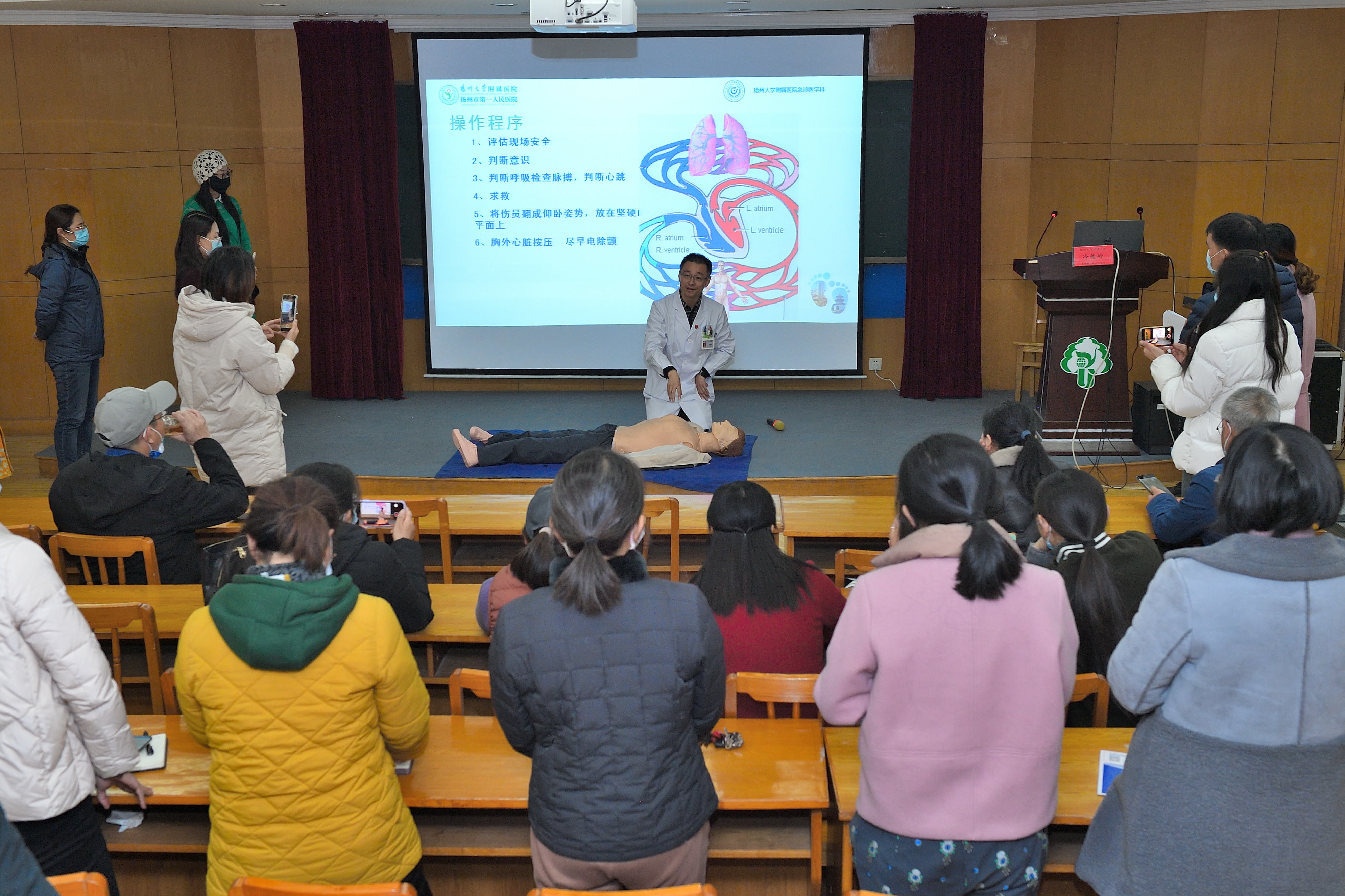 冷峻岭主任重点宣讲了《急症急救知识进校园》,冷主任从“怎样使用‘120’急救电话”说起,强调了现场急救的意义,普及了急救知识的主要内容,他结合教具模拟人,为大家详细演示了现场心肺复苏的操作程序,并给大家做了海姆立克急救法的真人现场示范。教职工们在冷主任的指导下,纷纷使用教具进行了“实战演练”。