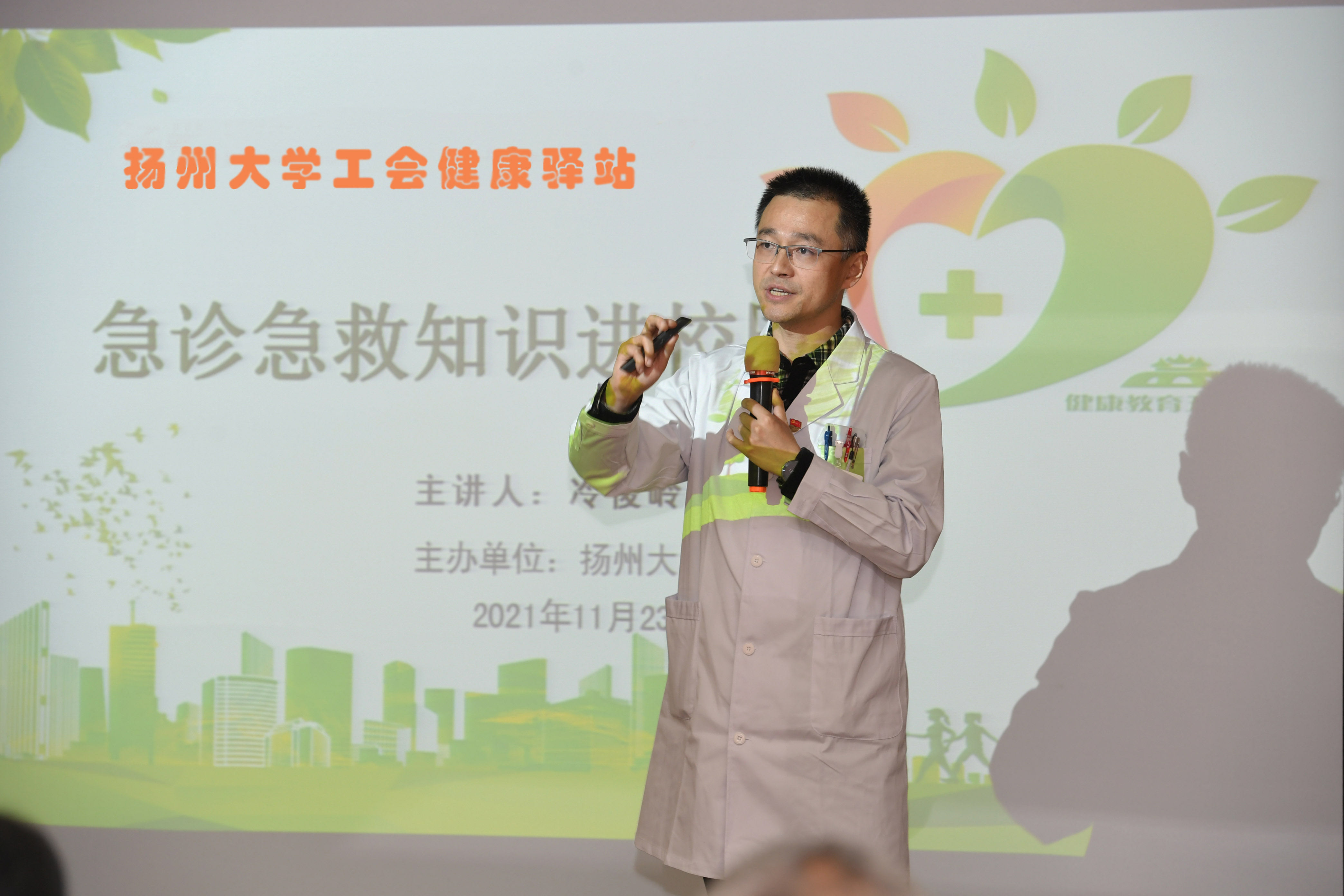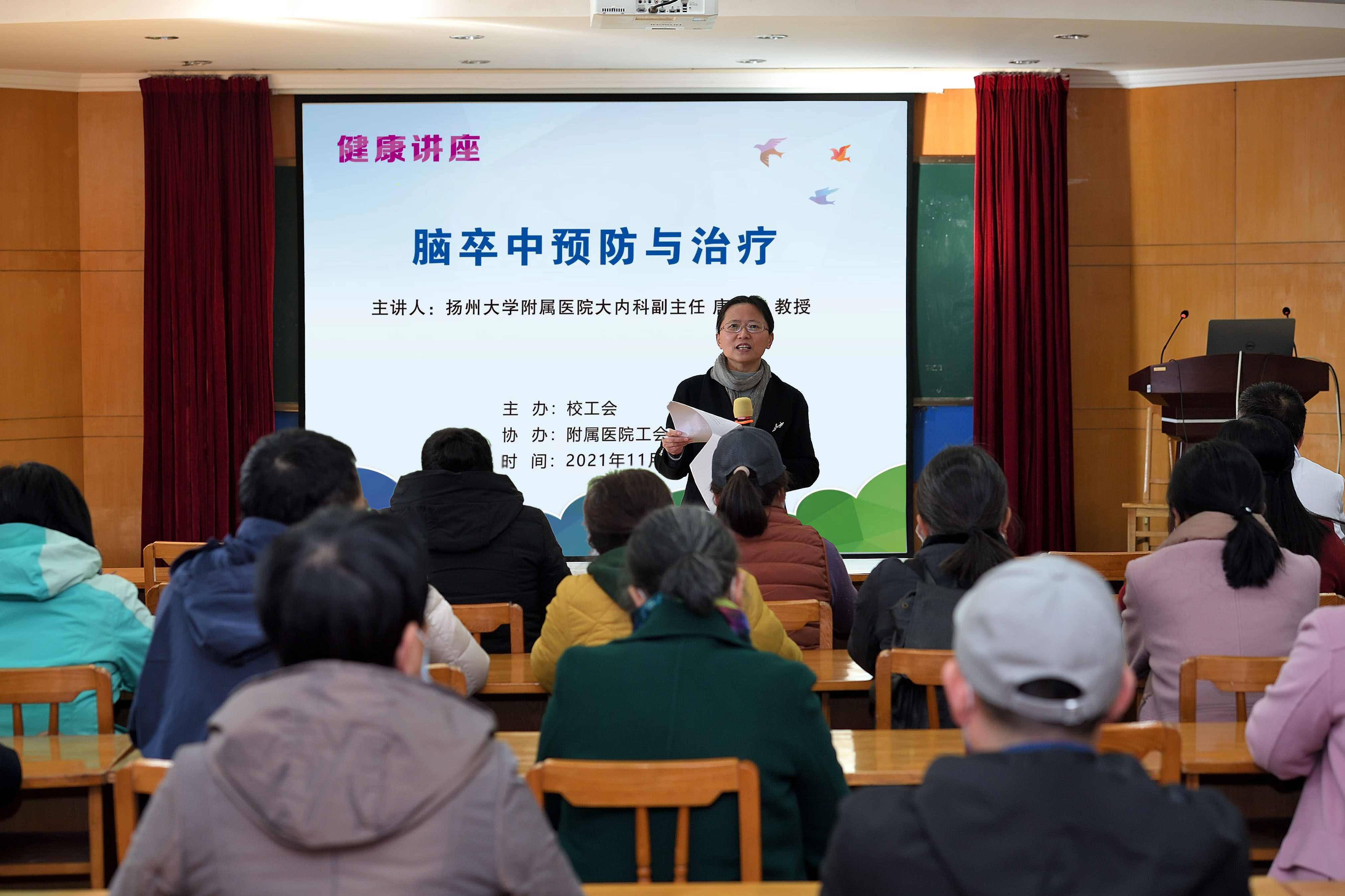 11月23日下午,由校工会主办、附属医院工会协办的专题健康知识讲座在生物科学与技术学院报告厅举办,特邀附属医院大内科副主任、神经内科主任医师、医学博士、硕士生导师唐铁钰,附属医院急诊科主任、主任医师冷峻岭为教职工普及健康知识。校工会副主席高静主持讲座。