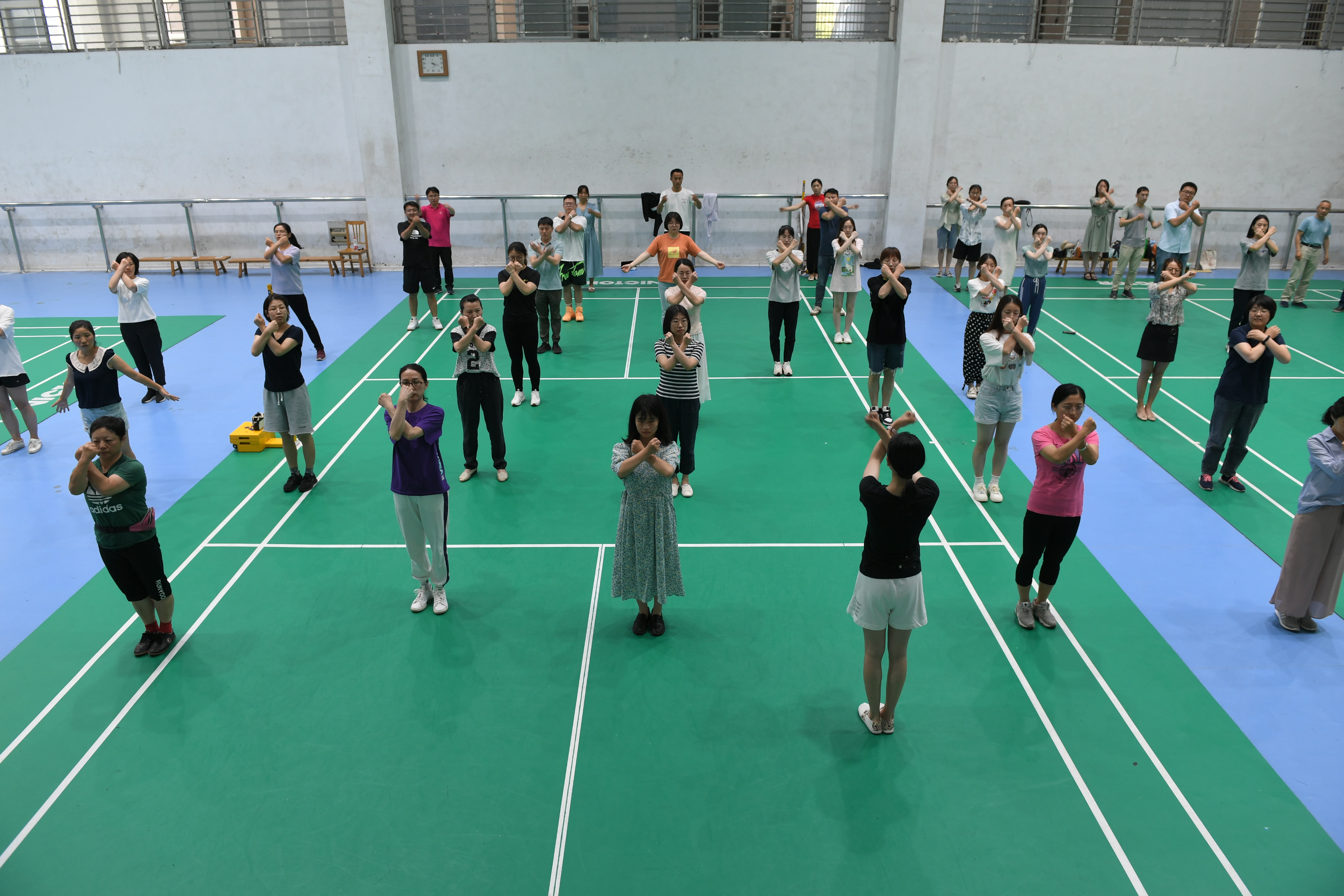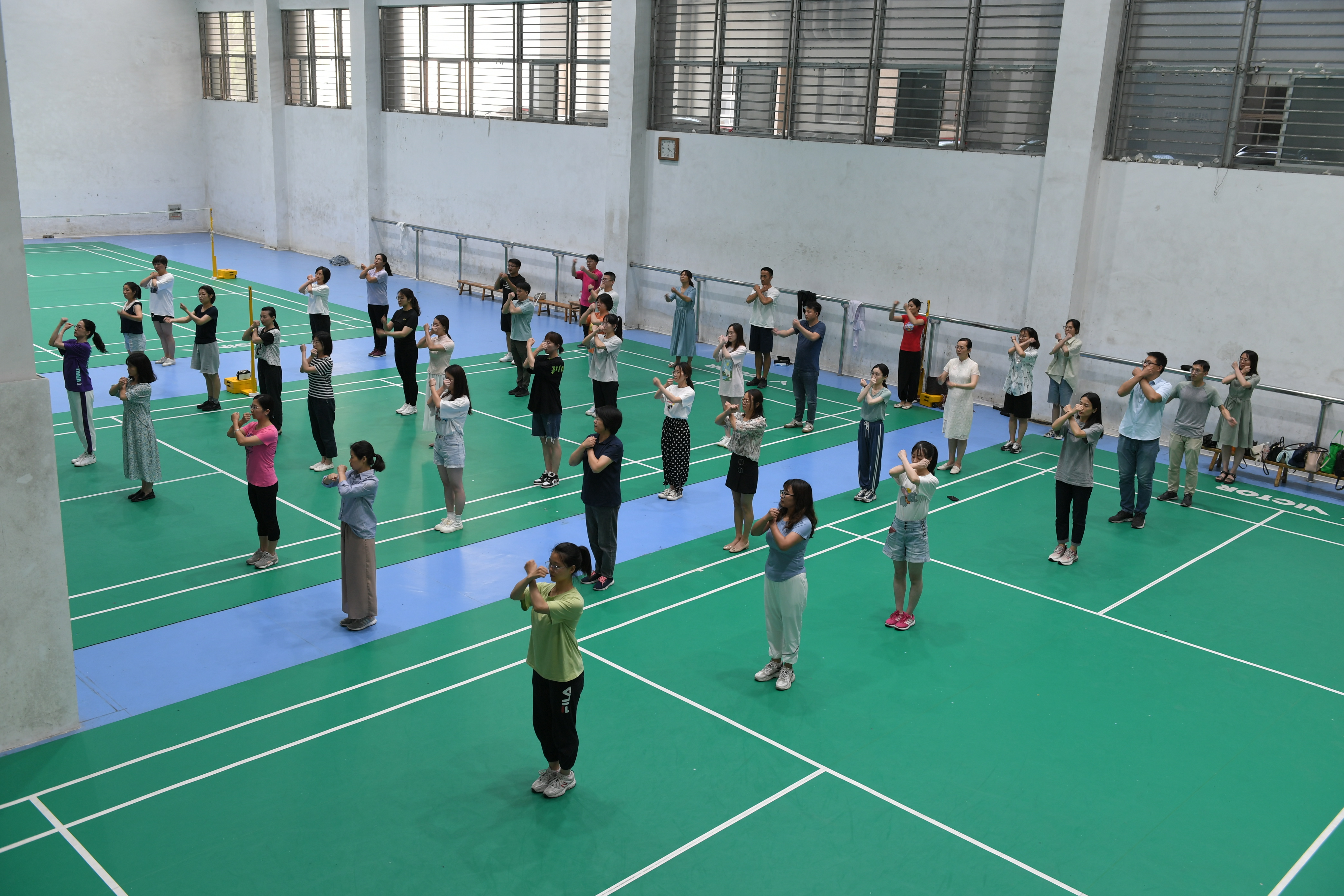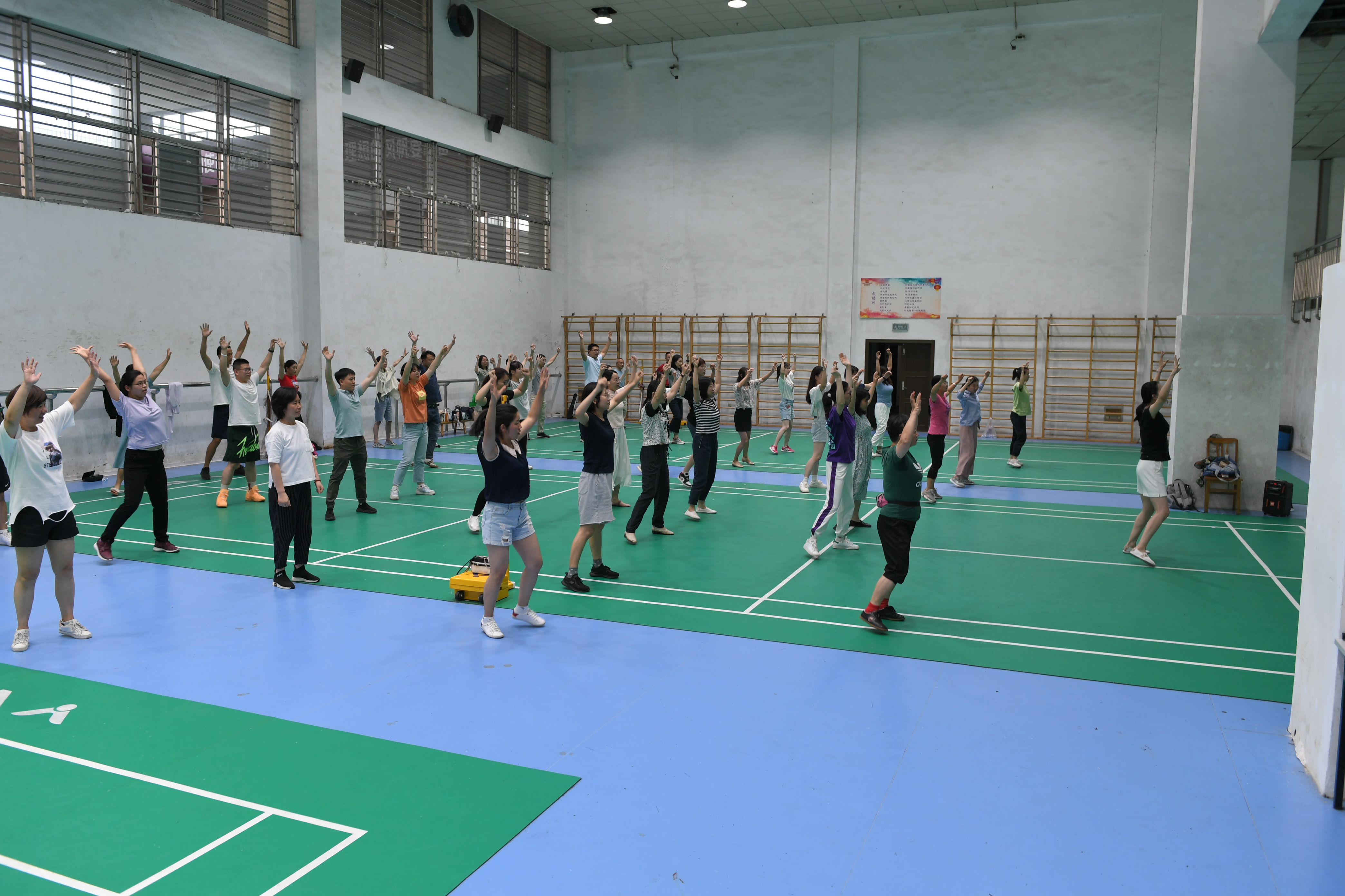 为进一步贯彻落实全民健身国家战略和推进健康中国建设,提高教职工健身意识、身体素质和健康水平,校工会决定在全校教职工中推广工间操,经过半年多的调研、策划和编排、准备,在学校公体部的大力支持下,从六月中旬开始,校工会在荷花池校区体育馆分期分批开展工间操推广集中培训,来自各二级工会的70余名学员参加了第一期培训。