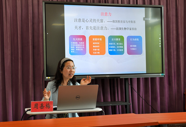 活动特邀扬州市首批特级班主任,高级教师,扬州市“十佳班主任”,扬州市“五一”巾帼标兵,作家协会会员,扬州市中小学班主任名师工作室指导老师,育才小学周岳梅老师担任主讲人,为大家权威讲解如何帮助孩子们在幼小衔接阶段做好心理准备、能力准备和环境准备。周老师结合自己教学过程中的详实案例,与家长们分享了如何通过专门训练有效提升孩子的注意力,如何正面强化、积极引导,以人为本激发孩子的学习兴趣,树立孩子的学习信心。周老师还耐心解答了青年教职工们的线上线下提问,纾解了他们在教育子女方面的困惑。