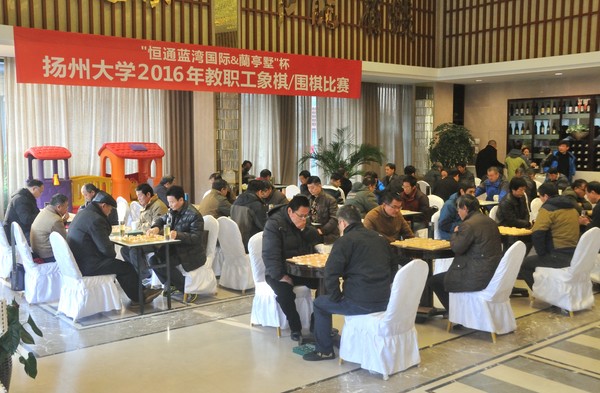 11月27日,由校工会主办、教职工象棋/围棋协会承办的“恒通蓝湾国际&兰亭墅杯”扬州大学2016年教职工象棋/围棋比赛在恒通蓝湾国际城市客厅顺利举行,来自各院级工会的70多位象棋围棋爱好者参加了比赛。经过一天五轮次的激烈角逐,化学化工学院工会、附属医院工会、信息学院工会、教科研工会分列象棋团体前四名;体育学院工会、信息学院工会、商学院工会、附属医院工会分列围棋团体前四名。黄勤获得象棋个人第一名,季恒忠、束旭潮、陈文建、张存、石炳熙、刘忠之、聂青松分别获得第二至第八名;曹永忠获得围棋个人第一名,耿利军、孙政、邵成忠、华宇、徐敏、周爱东、王树强分别获得第二至第八名。通过比赛,大家不仅切磋和提高了棋艺,同时又增进了彼此间的了解和友谊。