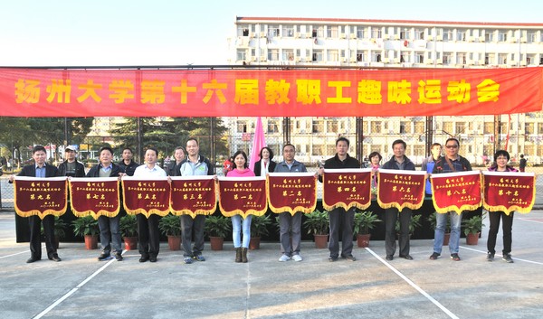 11月4日,校工会在荷花池校区篮球场举办第十六届教职工趣味运动会,来自全校36个院级工会代表队的千余名选手参加了赶篮球跑接力、盘带足球绕障碍接力、打保龄球、抱球跑接力、踢毽子、集体跳绳等10个项目的比赛。比赛中精彩不断,运动员们你争我赶,加油欢呼声此起彼伏。经过激烈争夺,最终后勤代表队荣获团体总分第一名,农牧场、体育学院、化学化工学院、农学院、水利与能源动力学院、图书馆、医学院、离退休处、环境科学与工程学院分获第二至第十名。