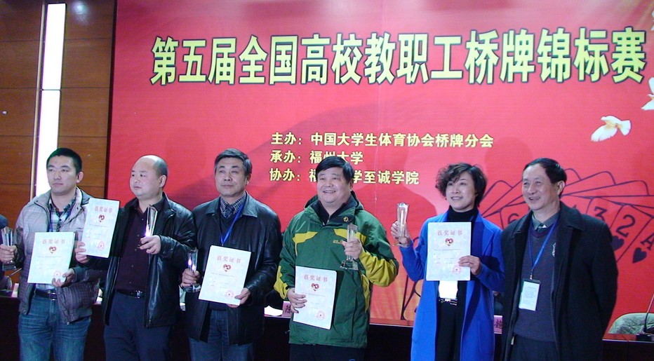 2月8日至12日,第五届全国高校教职工桥牌锦标赛在福州大学举行。校党委副书记、纪委书记刘延庆率学校代表队参赛。经过紧张激烈的角逐,我校李刚、成涛、钟建生、陈炳猛组成的代表队取得团体赛第七名,钟建生、陈炳猛取得双人赛东西组第四名。