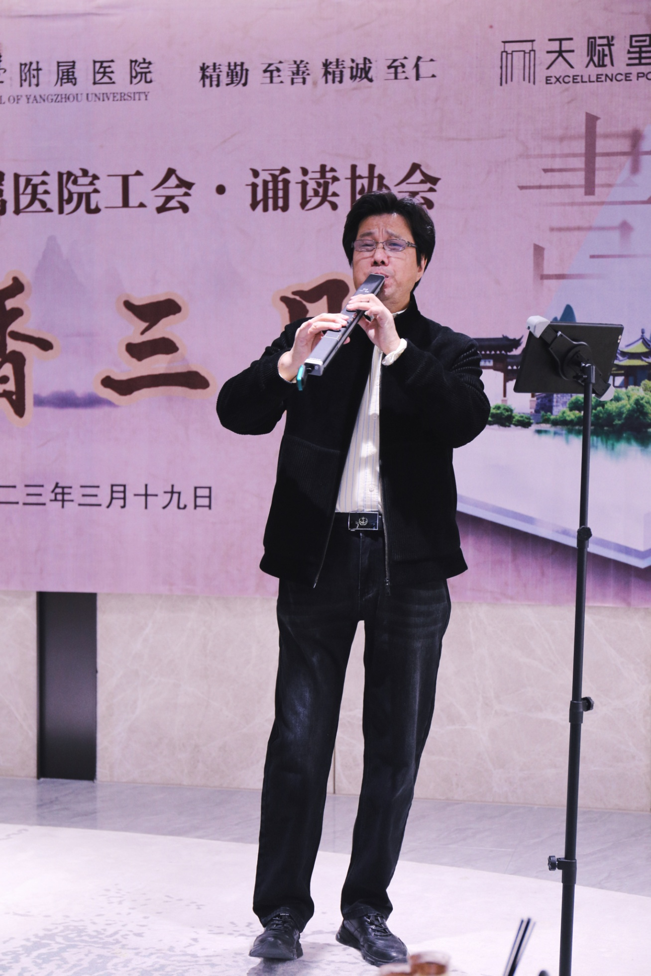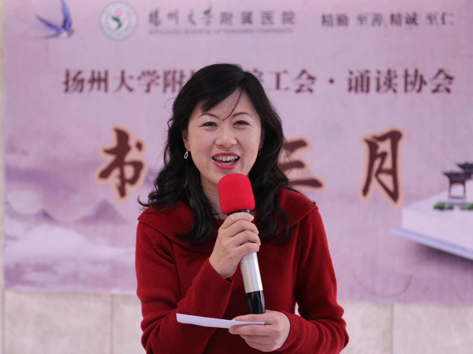 曲毕,诵读活动正式开始。首先出场的是来自儿科的王琼瑾主任,知性优雅的王主任是扬州市朗协的会员,她的诵读时而婉转、悠扬,时而铿锵、激昂,让在场的所有人无不沉浸在诗的交响曲中。