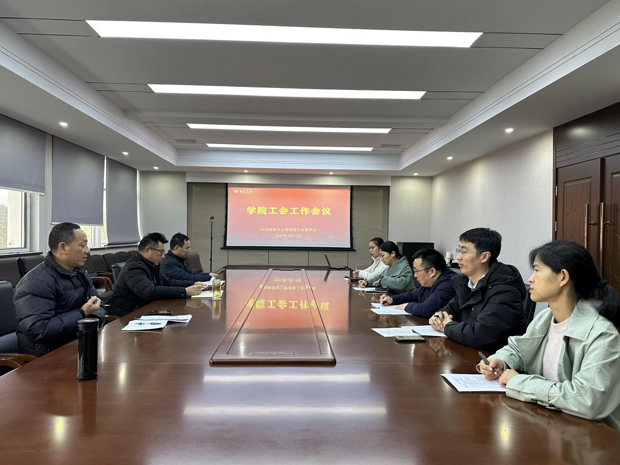 3月17日上午,水利学院在水利楼402会议室召开工会工作会议。会议由学院工会主席王拓主持,院党委书记王建军、院长成立、第二届工会委员会全体委员参加。