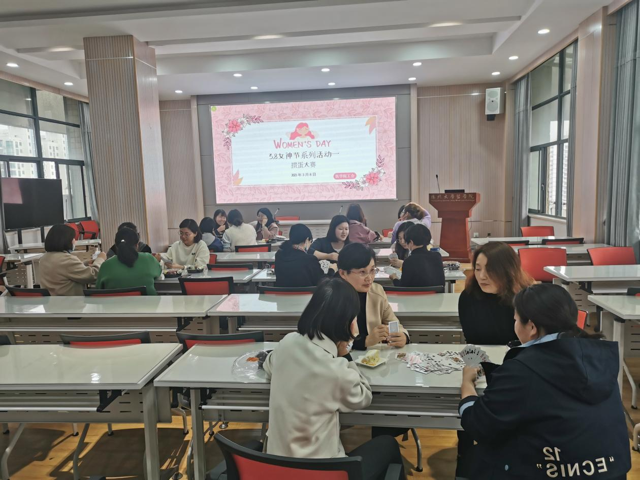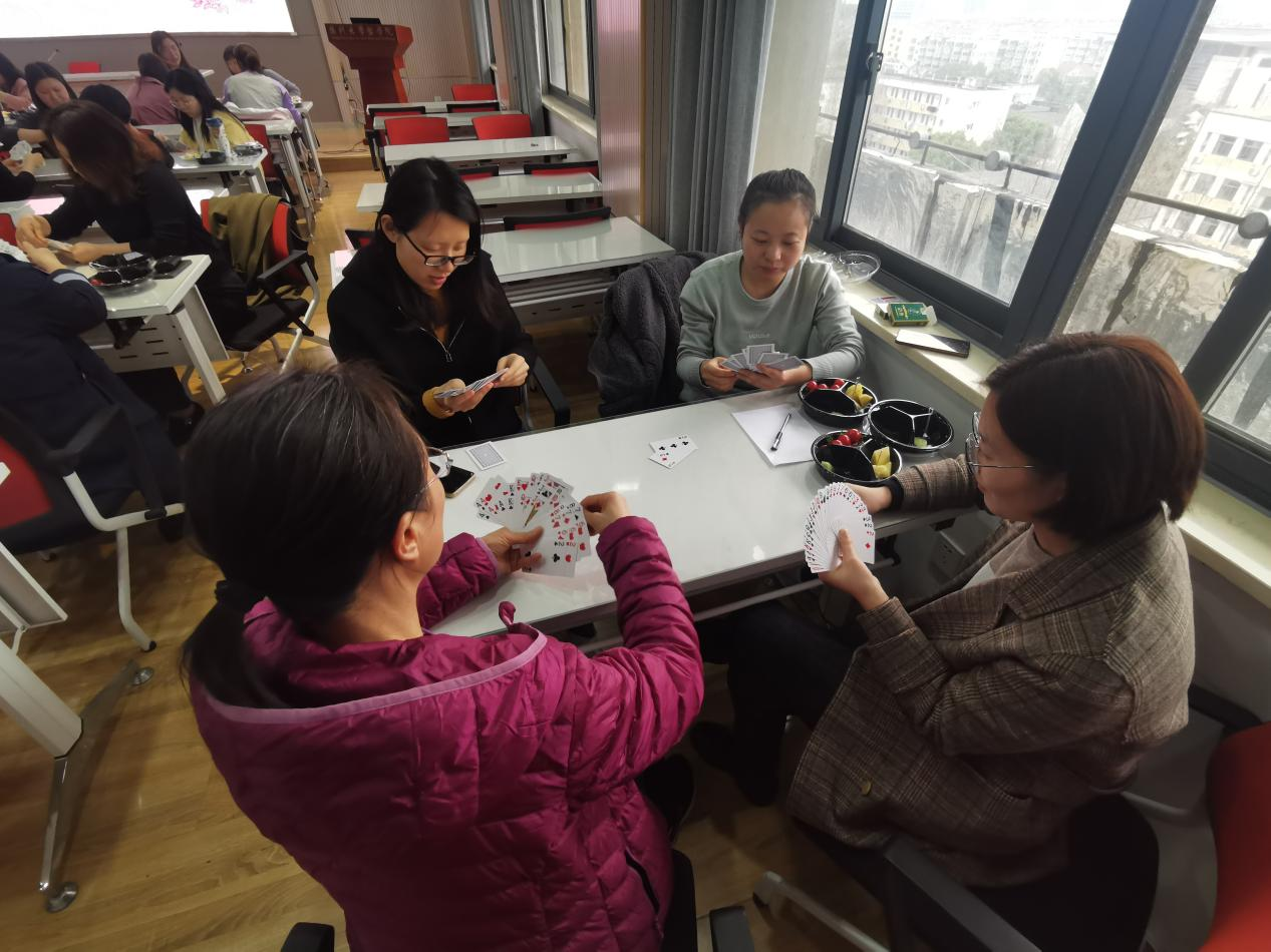 2023年3月8日下午医学院在江阳路北校区19号楼9楼举行迎接国际劳动妇女节扑克牌比赛。这是疫情结束后第一次妇女节,学院党委和院工会非常重视女教师们的身心健康,组织开展了妇女节系列活动。此次是系列活动之一:扑克牌大赛,希望借助这次活动让女教师们在紧张的工作之余能暂时放松心情,在欢快的气氛中交流学习、工作、生活等各方面的情况,为老、中、青三代女教职工提供互相认识和交流合作的平台。从实际效果来看,这次活动达到了预期目的,参加的女教职工超过了学院女教职工总数的80%,很多新来的年轻女教师增加了对学院的归属感,活动也提升了学院的凝聚力。大家都相约更多地参加学院、学校的各项活动,为学院的发展多做贡献!
