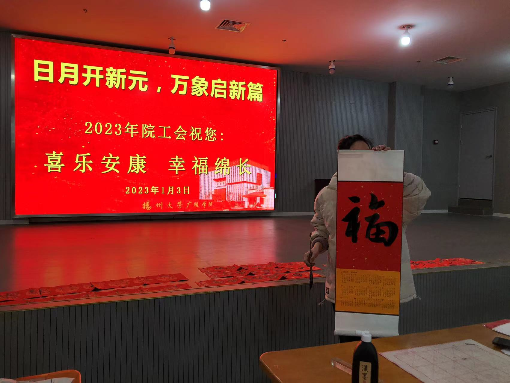 老师们喜获大红“福”字、春联,个个洋溢着欢乐的笑脸。“院工会的传统项目真好,感谢院工会”。“新时代、新征程、新目标,学院的未来一定会红红火火。”大家感慨。