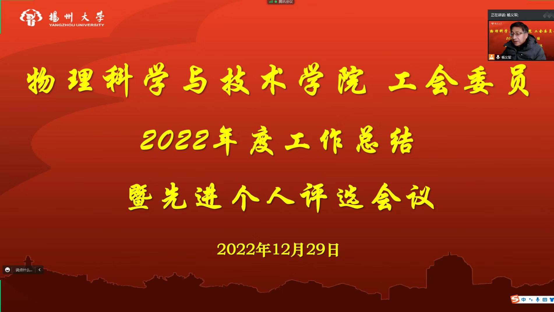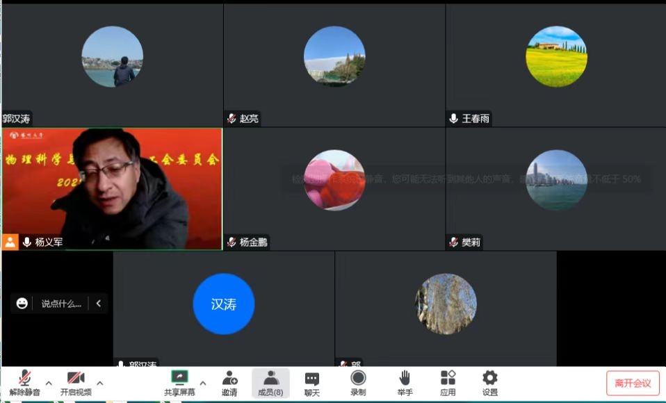 12月29日下午,物理学院工会委员会召开2022年年终工作总结会,分管领导王春雨书记和全体工会委员参加会议。会议以视频方式举行。