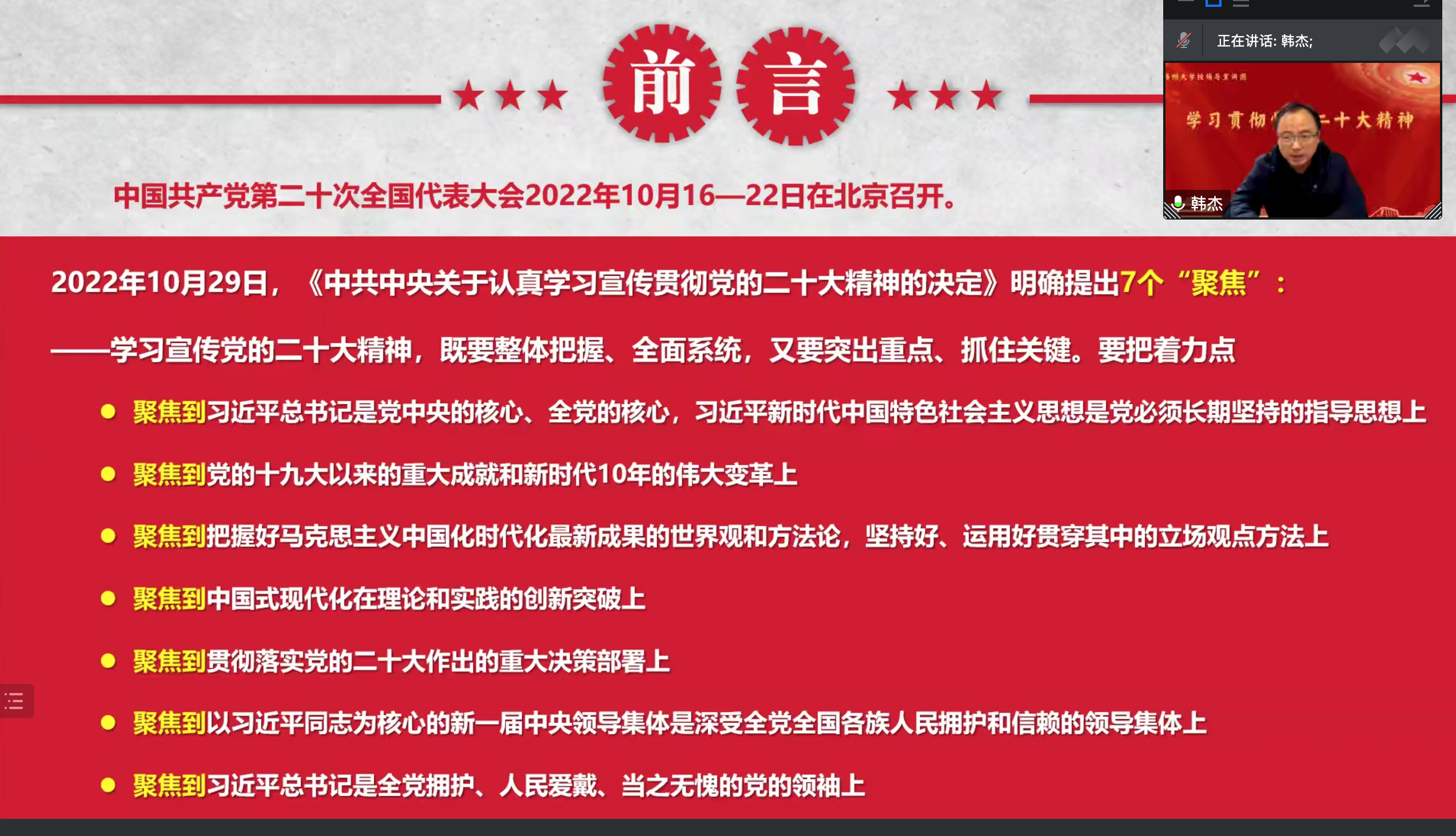 12月29日,校领导宣讲团成员、副校长韩杰围绕学习贯彻党的二十大精神作专题宣讲。海外教育学院工会组织全院教职工进行了专题学习。