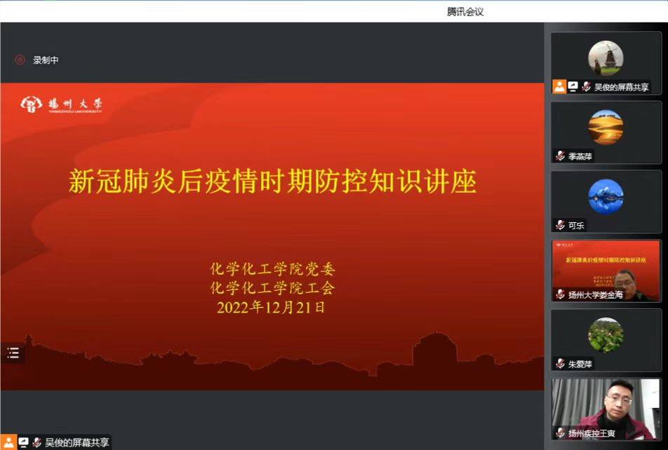 当前,新冠病毒快速蔓延,防治形势非常严峻。为帮助我院师生了解规范的个人防护方法,缓解紧张、焦虑情绪,科学应对感染及康复过程中可能遇到的问题,12月21日晚,院党委、院工会邀请新冠病毒防治专家、扬州市疾控中心急性传染病防治科科长、副主任医师王寅,为全院师生做了“新冠肺炎后疫情时期防控知识”专题讲座(腾讯会议)。院党委娄金海书记主持会议。