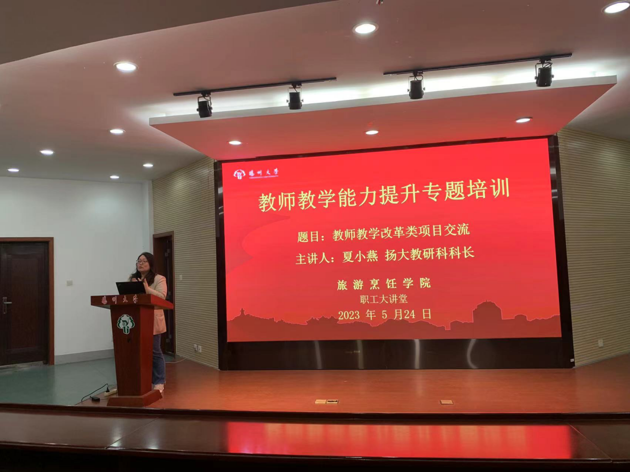 为提升专任教师的教学能力,5月24日下午,旅游烹饪学院工会特聘请扬州大学教研科科长夏小燕老师,为专任教师在笃行楼N302报告厅举办“教师教学改革类项目交流"的教学研究和教学改革专题讲座,学院专任教师参加了此次讲座。