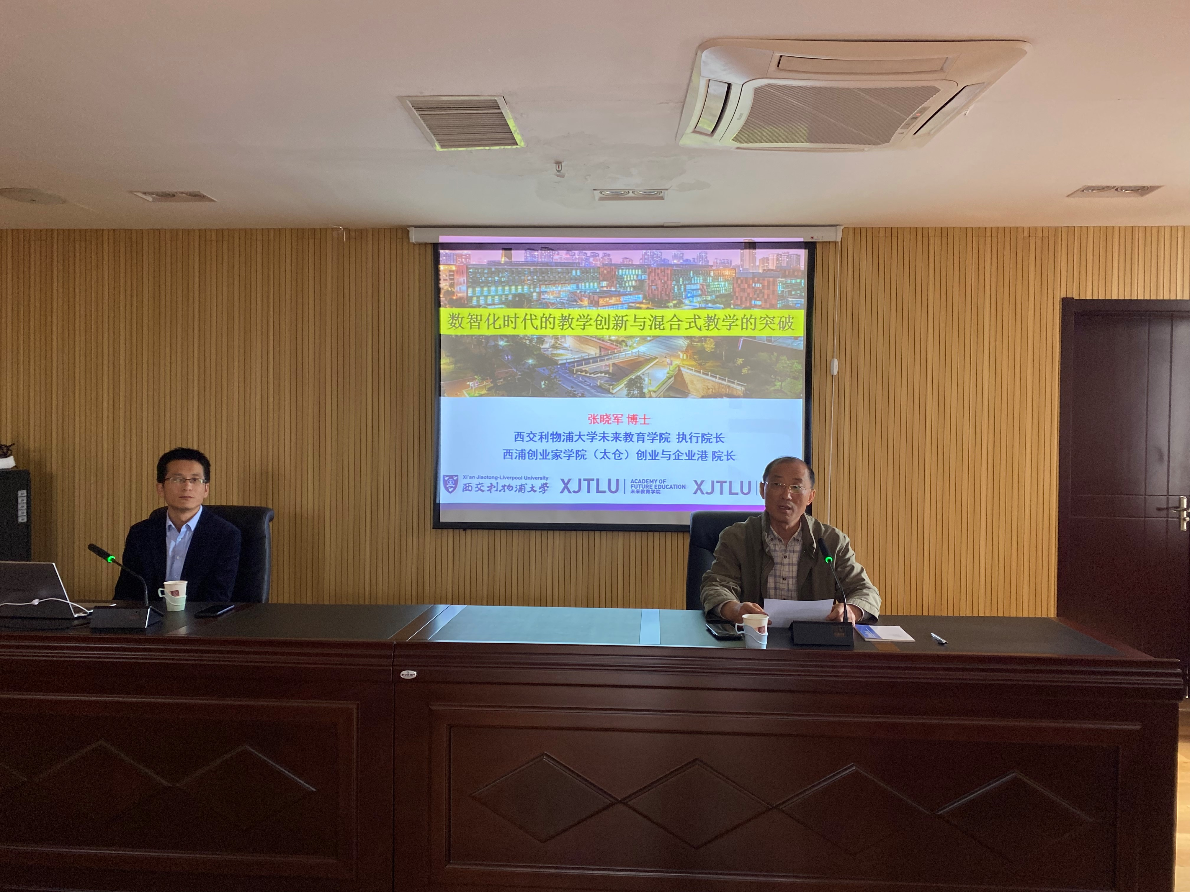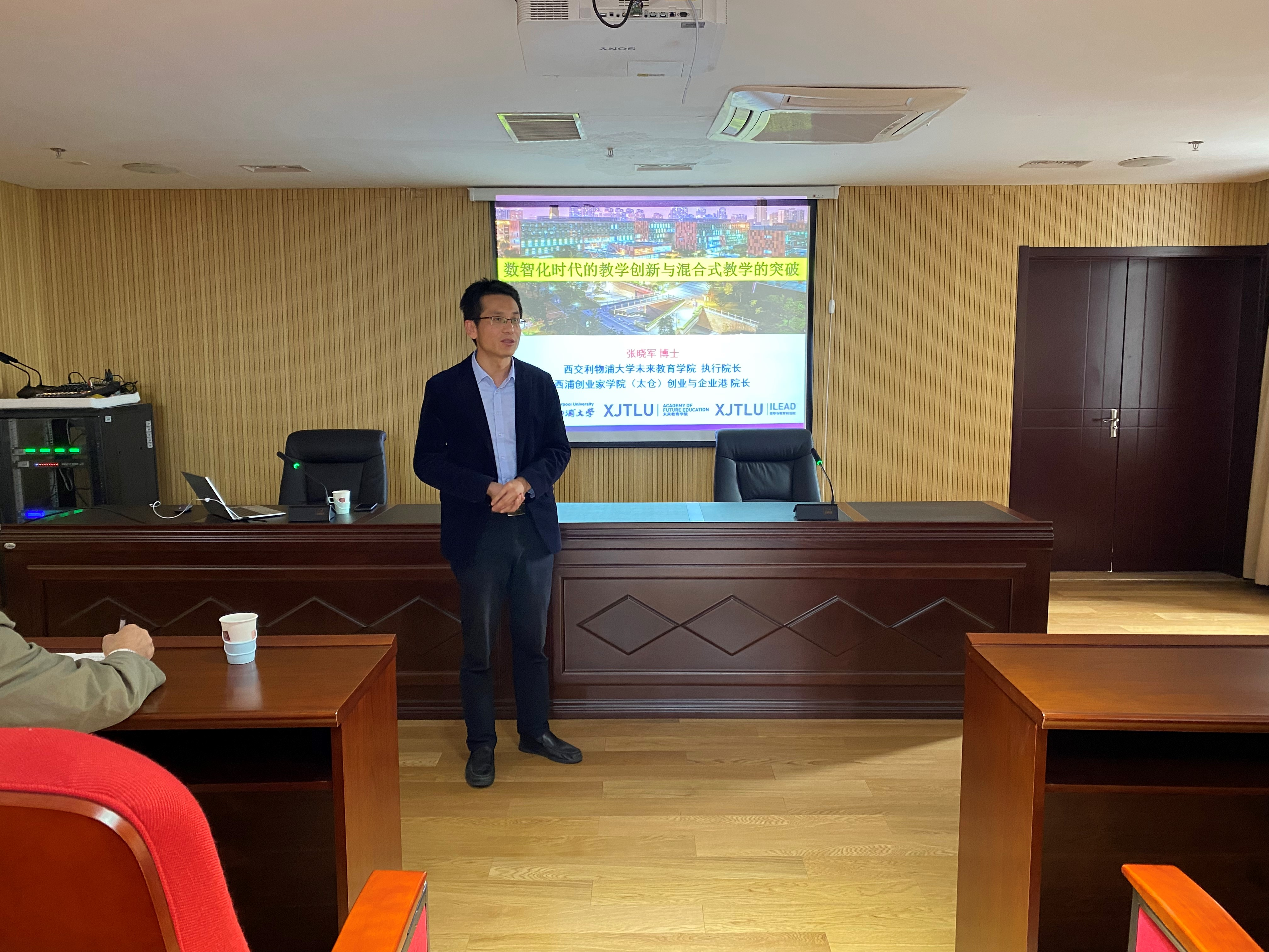 5月11日下午,学院工会、教务处在图书馆S1101举行数智化时代的教学创新专题报告会。西交利物浦大学未来教育学院执行院长、西浦创业家学院(太仓)创业与企业港院长、英国高等教育学会首席会士(Principal Fellow)、博士生导师张晓军高级副教授应邀作“数智化时代的教学创新与混合式教学的突破”专题报告。学院名师工作室首席专家张清教授主持报告会。