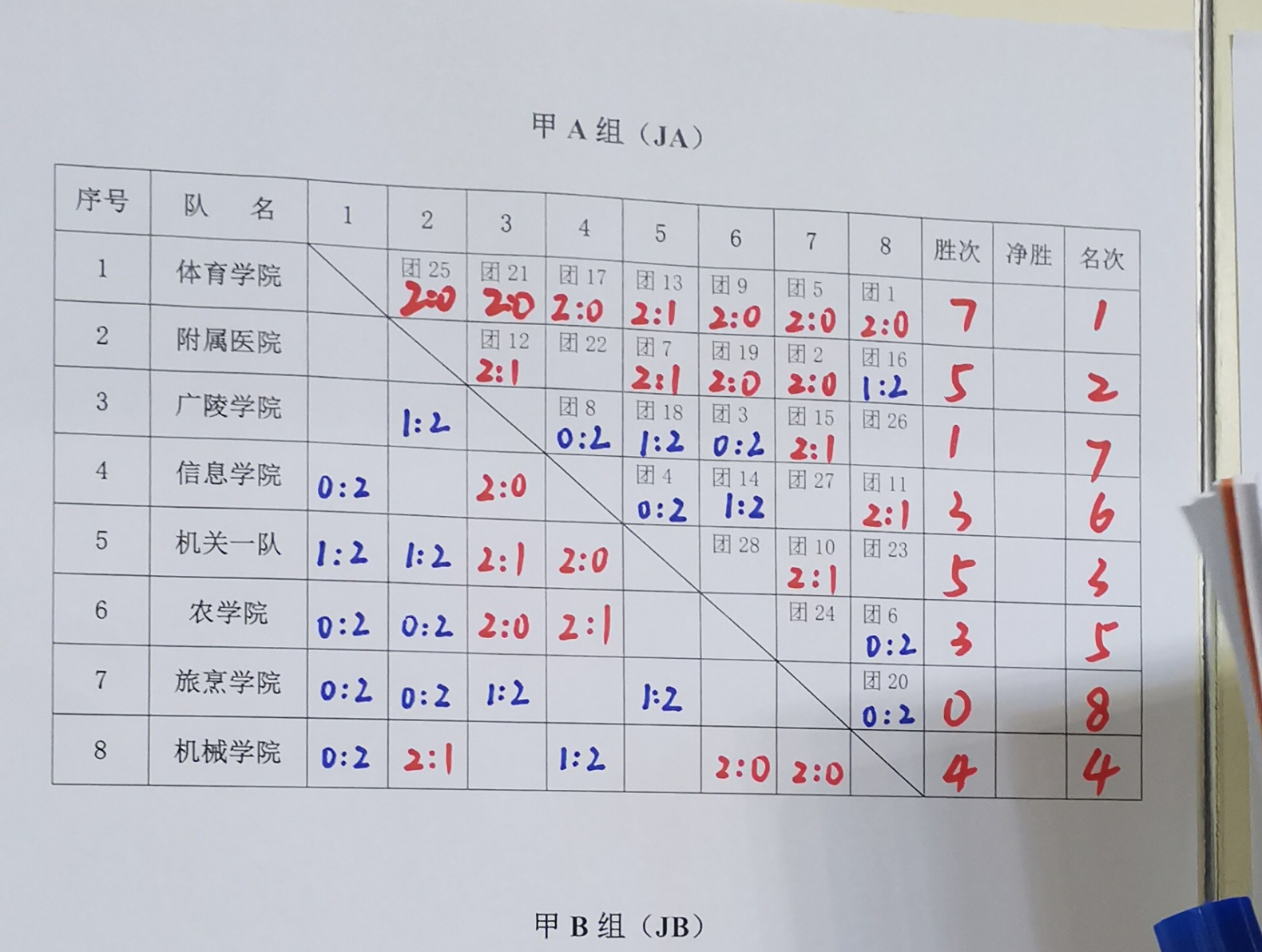 本届混合团体赛项目包括男子单打、混合双打、男子双打等三项。根据各队在上一届比赛中的成绩情况,将参赛队分成四个等级(甲A、甲B、乙A、乙B)分别进行比赛,上一届的前八名为甲A队,九到十六名为甲B队,十七到二十四名为乙A队,剩下的为乙B队,然后分别打循环赛。因在上届比赛中获得第二名,我院在甲A队进行比赛。