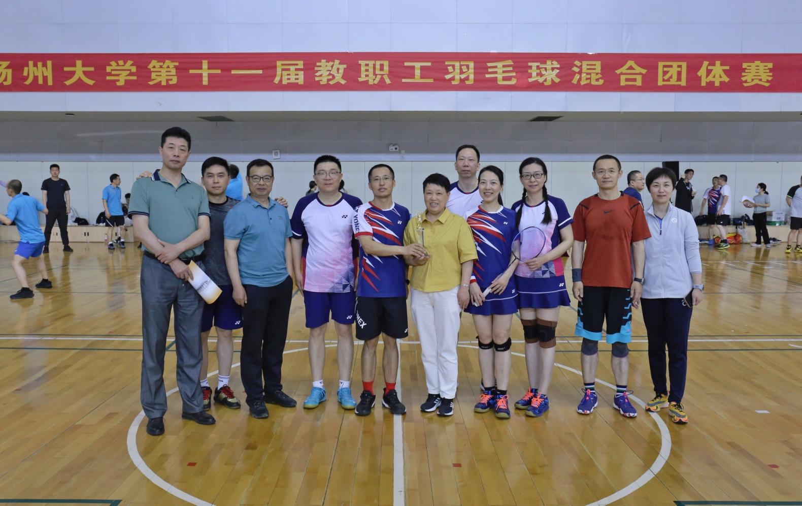 2023年5月13日-14日,“扬州大学第十一届教职工羽毛球混合团体赛”在扬子津校区文体馆拉开了帷幕。全校36个代表队近400多名领队、教练员、运动员参加了此次活动。我院派出了由朱玉霞主席任领队、李坚任教练、于海龙、范黄新、孙姜明、戴勇、朱斌、刘海红、周颖等运动员组成的参赛队伍参加了比赛。