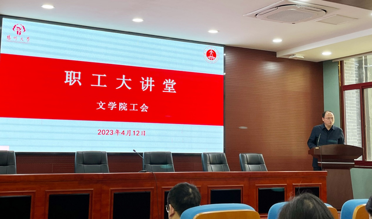 4月12日下午,文学院工会在瘦西湖校区文科楼中敏报告厅举办了职工大讲堂活动,本次活动的主题是“全面从严治党”专题教育。院党委书记李怀军向全体教职工传达了校党委书记焦新安在学校2023年全面从严治党工作会议上的讲话精神,同时要求党员干部和广大教师要深入学习并贯彻落实党的二十大精神,紧密围绕学校部署的中心工作,牢牢把握“压责任、强监督、严纪律、促发展”四个着力点,全力推动落实扬州大学第四次党代会确立的目标任务,为学校和学院各项事业的稳步前进提供坚实的保障。