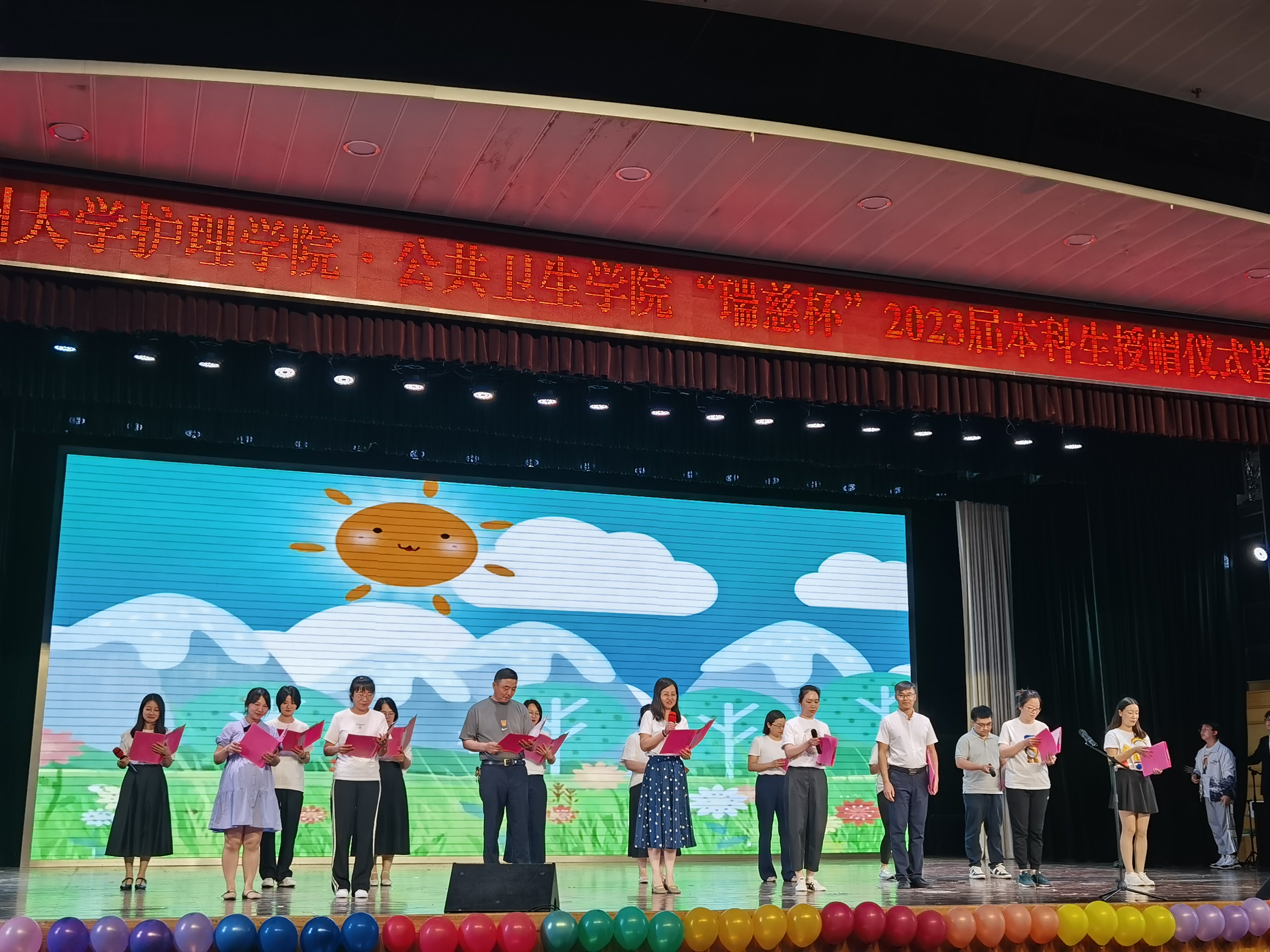 2023年6月12日,“鲜衣怒马少年时,不负韶华行且知”----扬州大学护理学院·公共卫生学院2023届毕业晚会在扬州大学荷花池校区小剧场拉开帷幕。学院工会的老师们精心策划了诗朗诵《我爱上班》,全院教职工结合实际情况认真地撰写朗诵稿,给同学们呈现了一个真实又有趣的诗朗诵,台下的同学们欢笑连连,老师们希望所有的毕业生,在未来,爱工作爱生活,鲜衣怒马,不负韶华。