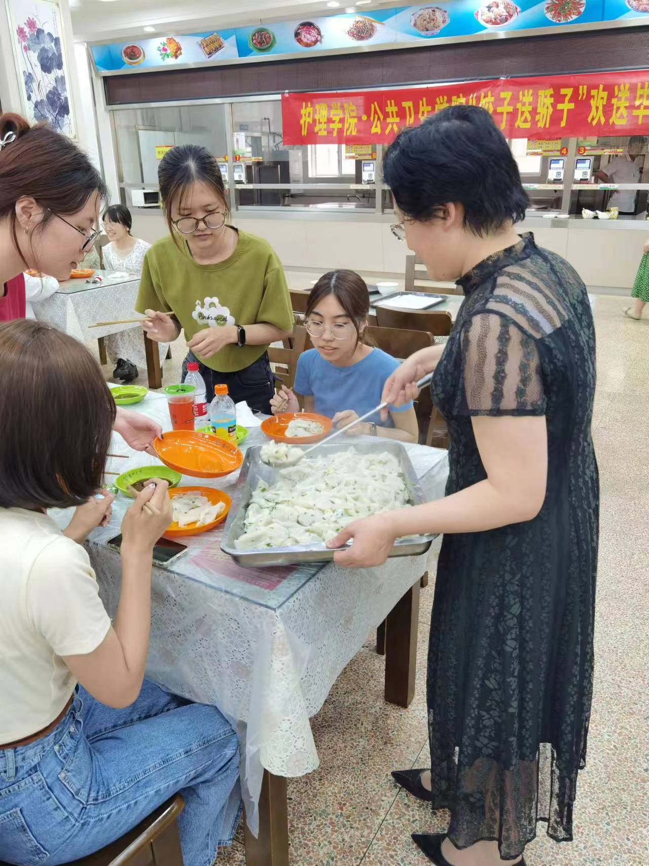 为欢送2023届毕业生,护理学院·公共卫生学院的教职工们精心策划了毕业晚会的节目,工会联合团委组织了“饺子送骄子”的活动。