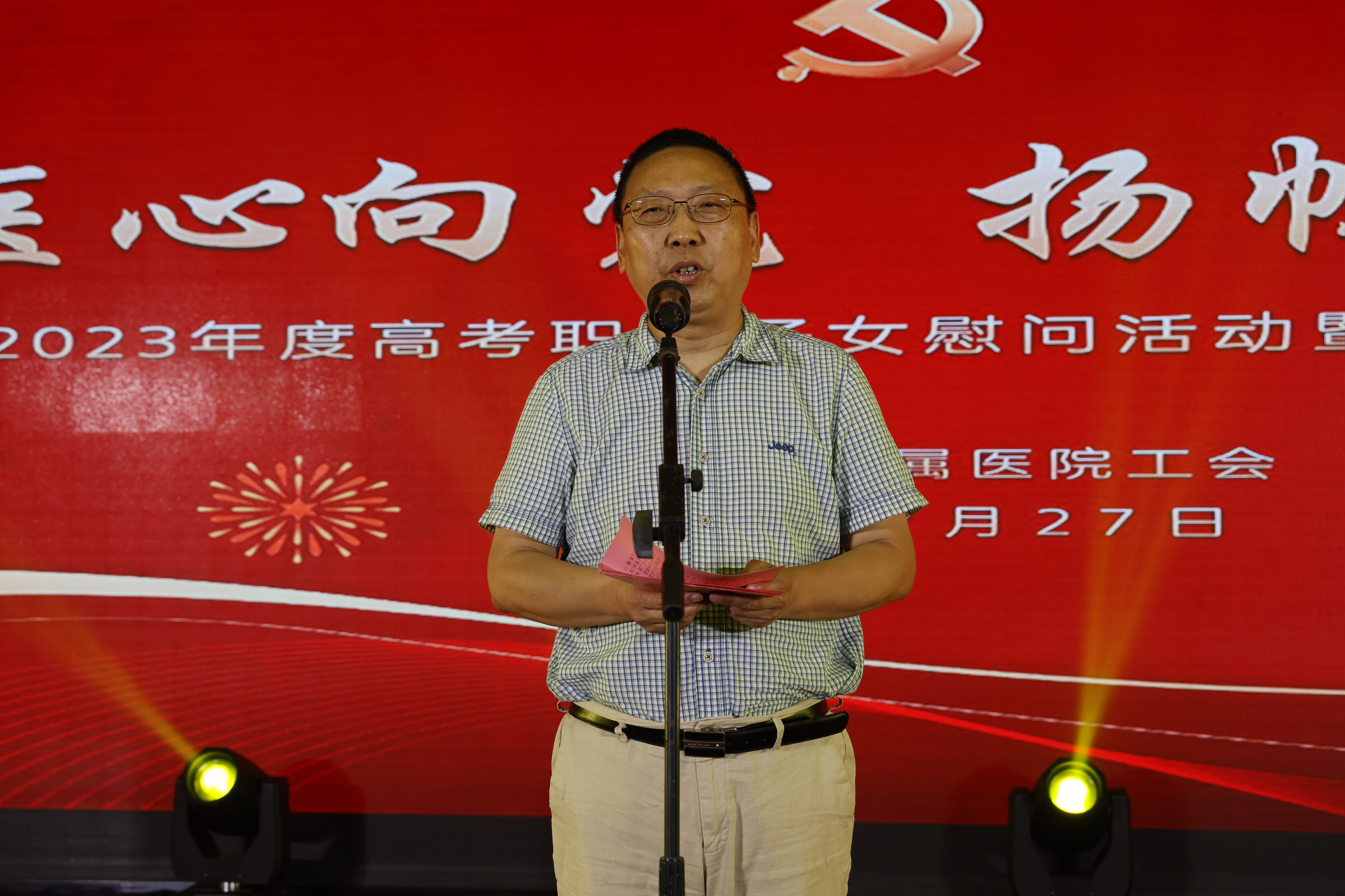 院党委书记刘佩健,党委副书记单清,党委委员蒋步锦、冷俊岭出席活动。党政办、纪委办、组织部、宣传部、工会、团委、医务部、护理部、门诊部等职能部门负责人以及各分工会主任、2023年职工高考子女、职工代表等参加活动。