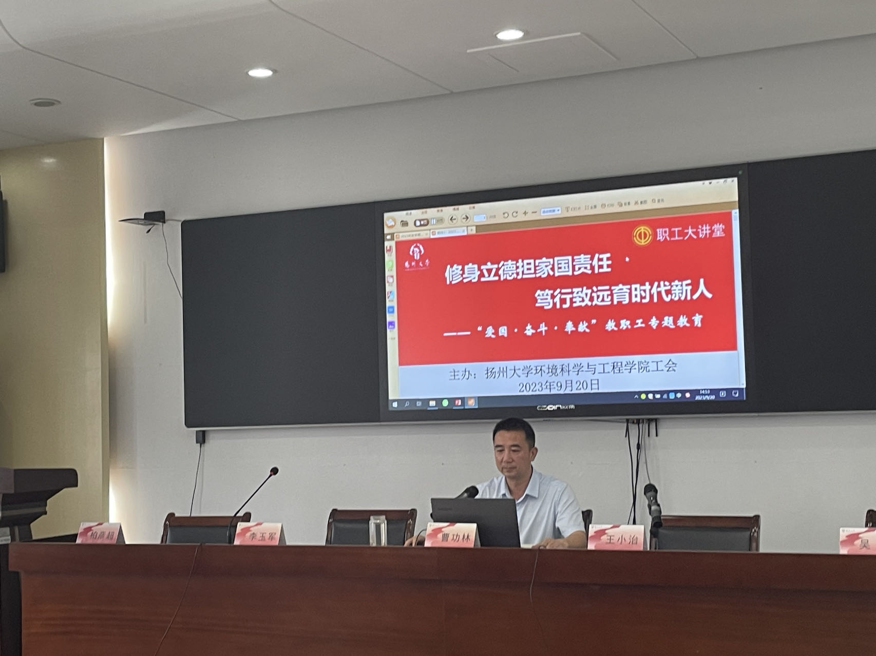 9月20日,环工学院工会举办职工大讲堂活动。环境科学与工程学院书记曹功林结合学院的发展以及开学第一课为全院教职工作了“修身立德担国家责任,笃行致远育时代新人”的专题讲座。院党委副书记李玉军主持了这次职工大讲堂。