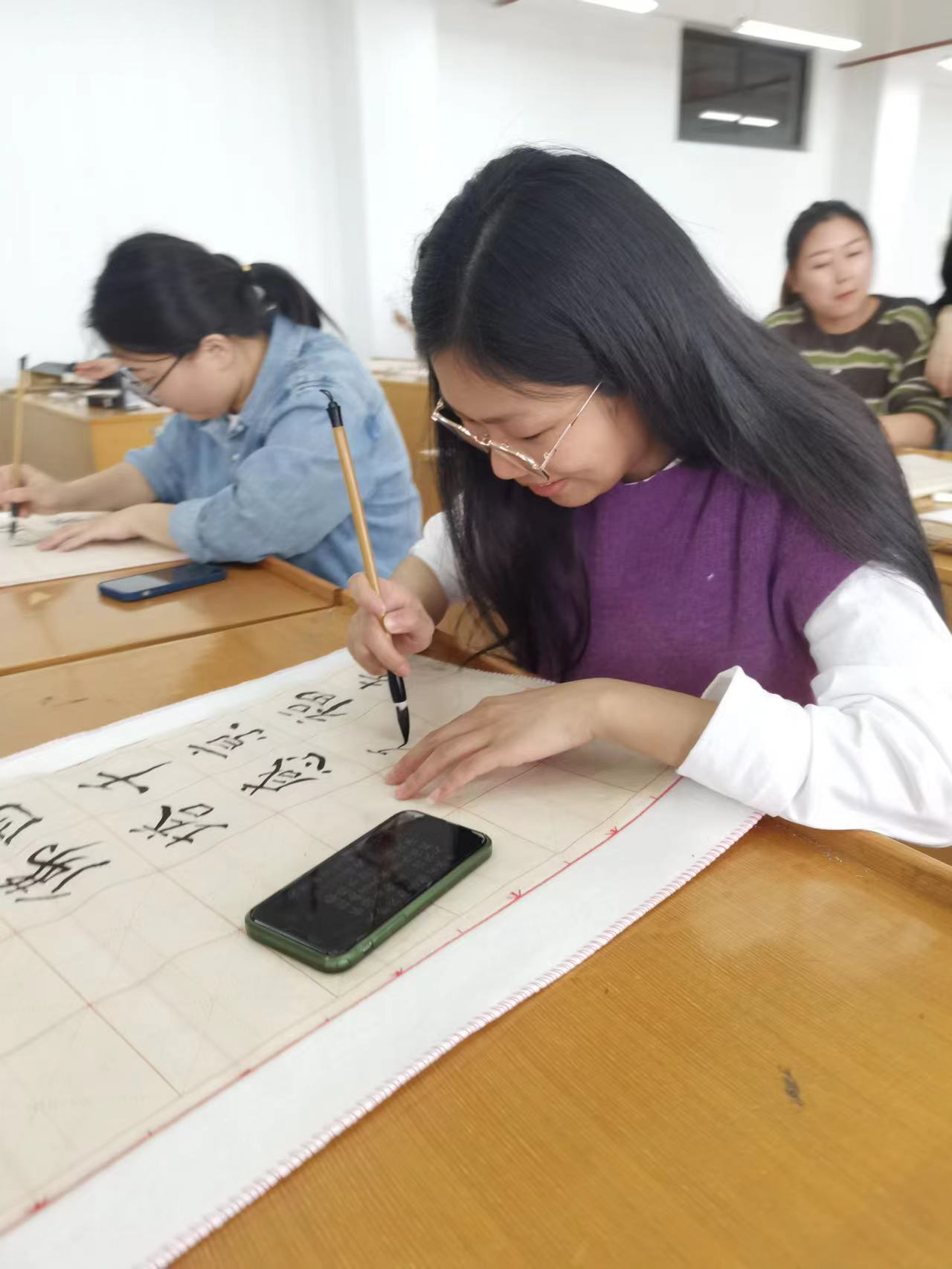 学员们一边认真观察,一边认真在纸上练习,从一笔一划、一撇一捺中感受到书法的博大精深。在金老师的指导下,大家正襟危坐,耐心书写,在缓缓流逝的时光中感受中华传统文化的独特魅力。