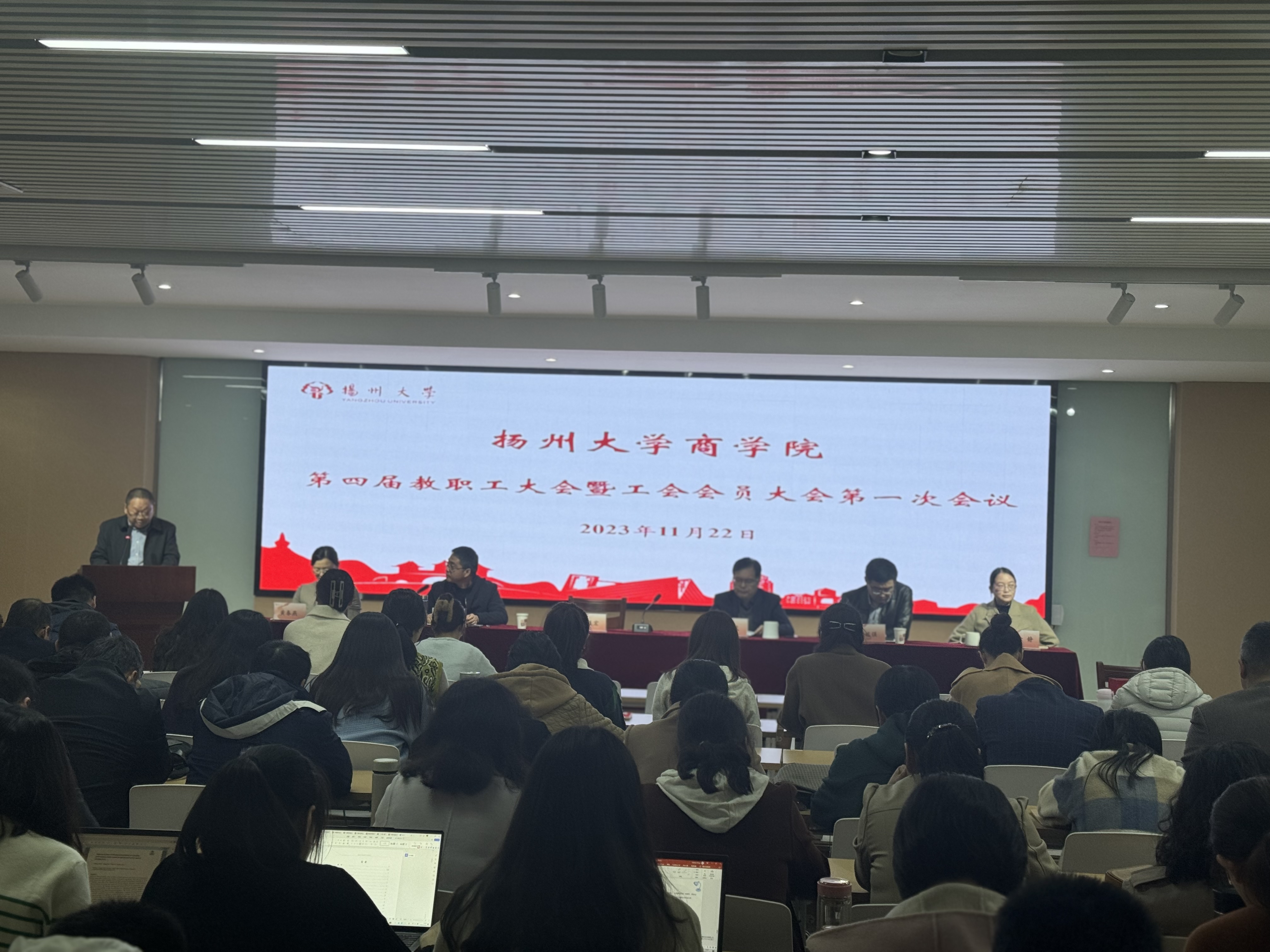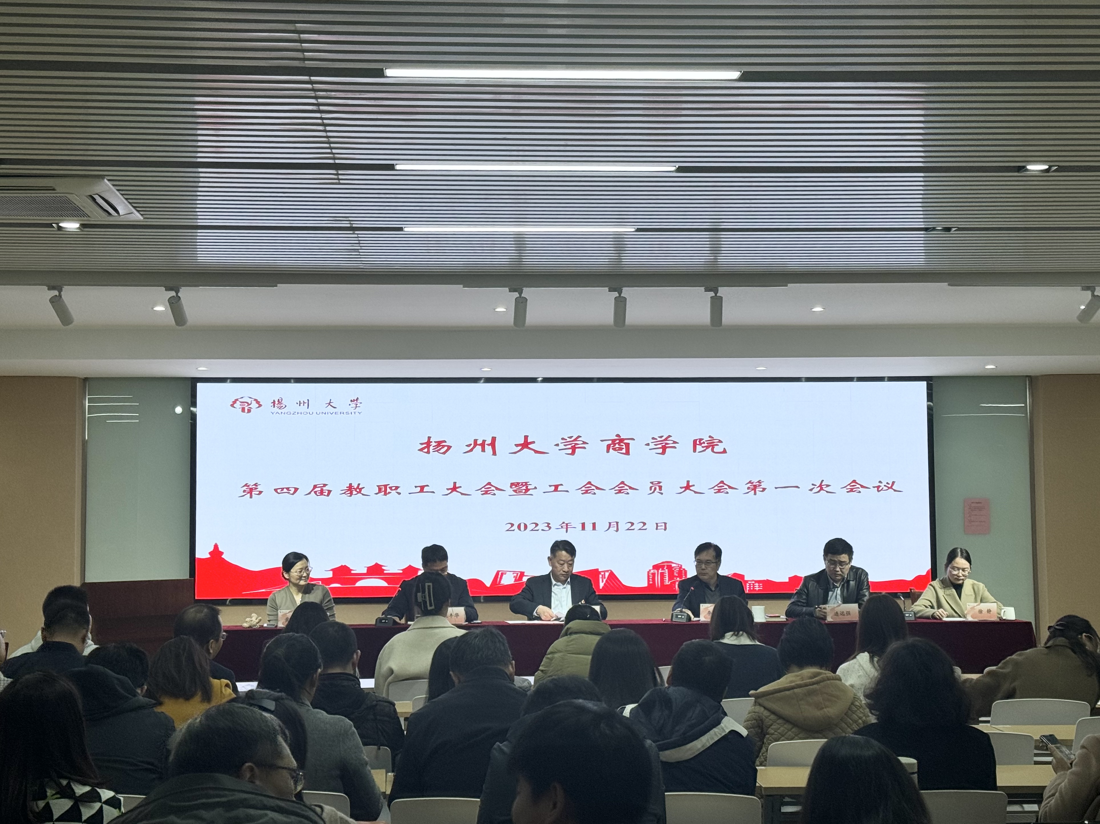 2023年11月22日下午14:30,商学院工会在学院新楼一楼会议室隆重召开第四届教职工大会暨工会会员大会第一次会议。校工会主席洪岑到会祝贺并致辞,全体院领导参加会议,会议由院党委副书记姚丰华主持。