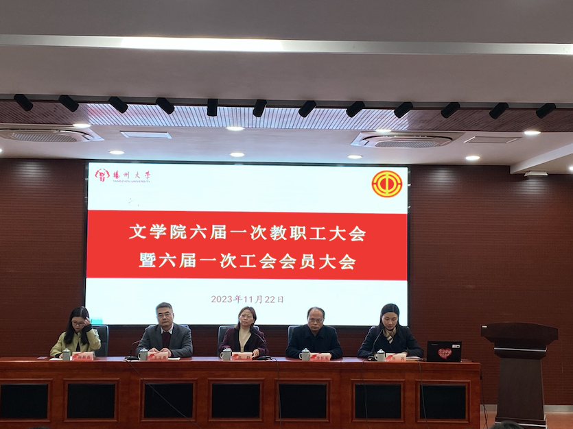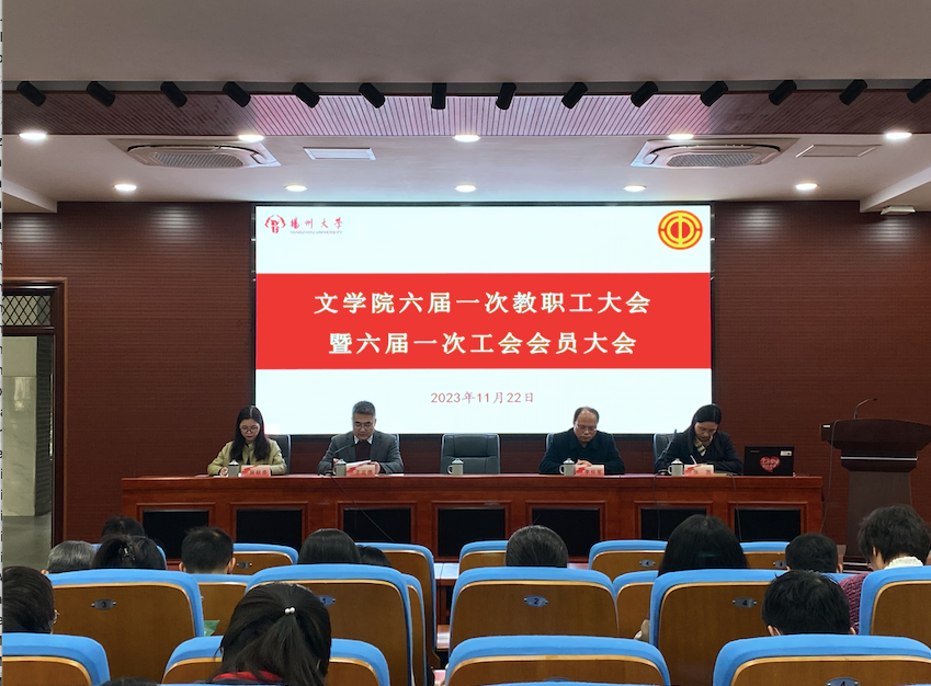2023年11月22日下午,文学院在瘦西湖校区文科楼中敏报告厅召开了六届一次教职工大会暨六届一次工会会员大会。校工会高静副主席受邀出席会议并致辞,院领导李怀军书记、王定勇院长出席会议并发表讲话,院工会主席施秋香老师作工会工作报告。会议由院党委张茜副书记主持。