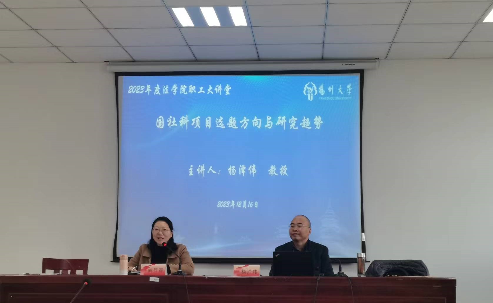 12月16日上午,法学院工会在扬子津校区笃行楼三楼模拟法庭举办了职工大讲堂。邀请了教育部长江学者奖励计划特聘教授、武汉大学国际法研究所副所长、国家社科基金重大招标项目首席专家杨泽伟教授为全院教职工做了“国社科项目选题方向与研究趋势”专题讲座。讲座由曲升霞副院长(主持工作)主持。