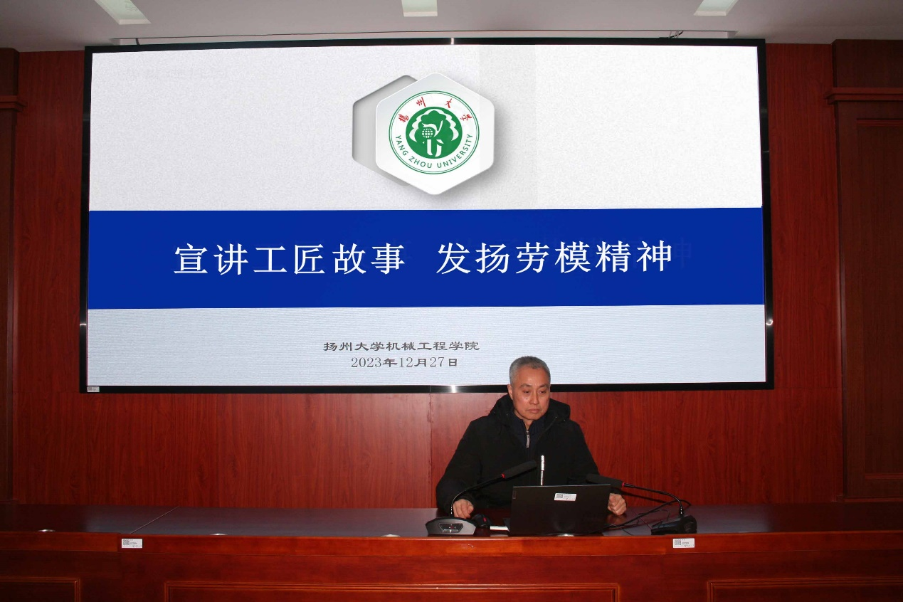 为全面加强新时代大学劳动教育,大力弘扬劳模精神、劳动精神、工匠精神,充分发挥劳模工匠在大学立德树人中的精神感召和教育榜样作用,机械学院工会于2023年12月27日下午在力行楼401报告厅,邀请第三届扬州工匠、第八届扬州五一劳动奖章获得者、2022年全省高校、科研院所教职工优秀发明专利获得者,我院实训中心指导教师秦康生高级技师开展了题为“宣讲工匠故事,传承劳模精神”劳模精神进校园活动。
