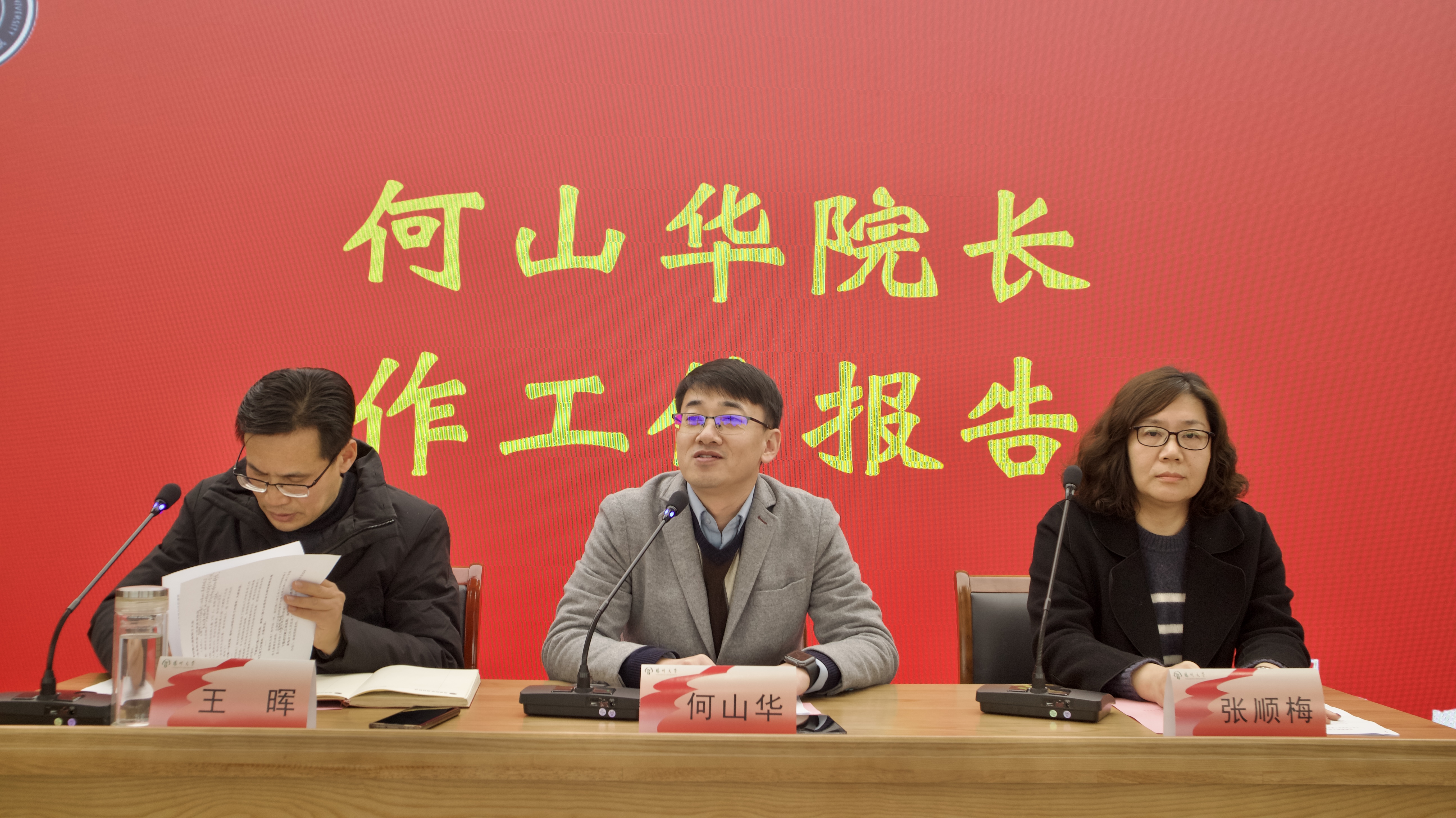 12月27日下午,我院在笃行楼报告厅举行第六届教职工代表大会暨第九届工会会员大会第一次会议。副院长(主持工作)何山华作学院工作报告,院工会主席张顺梅作工会工作报告,院党委副书记王晖主持会议,副院长杨晓春、副院长张强出席会议,共156名教职工参加会议。