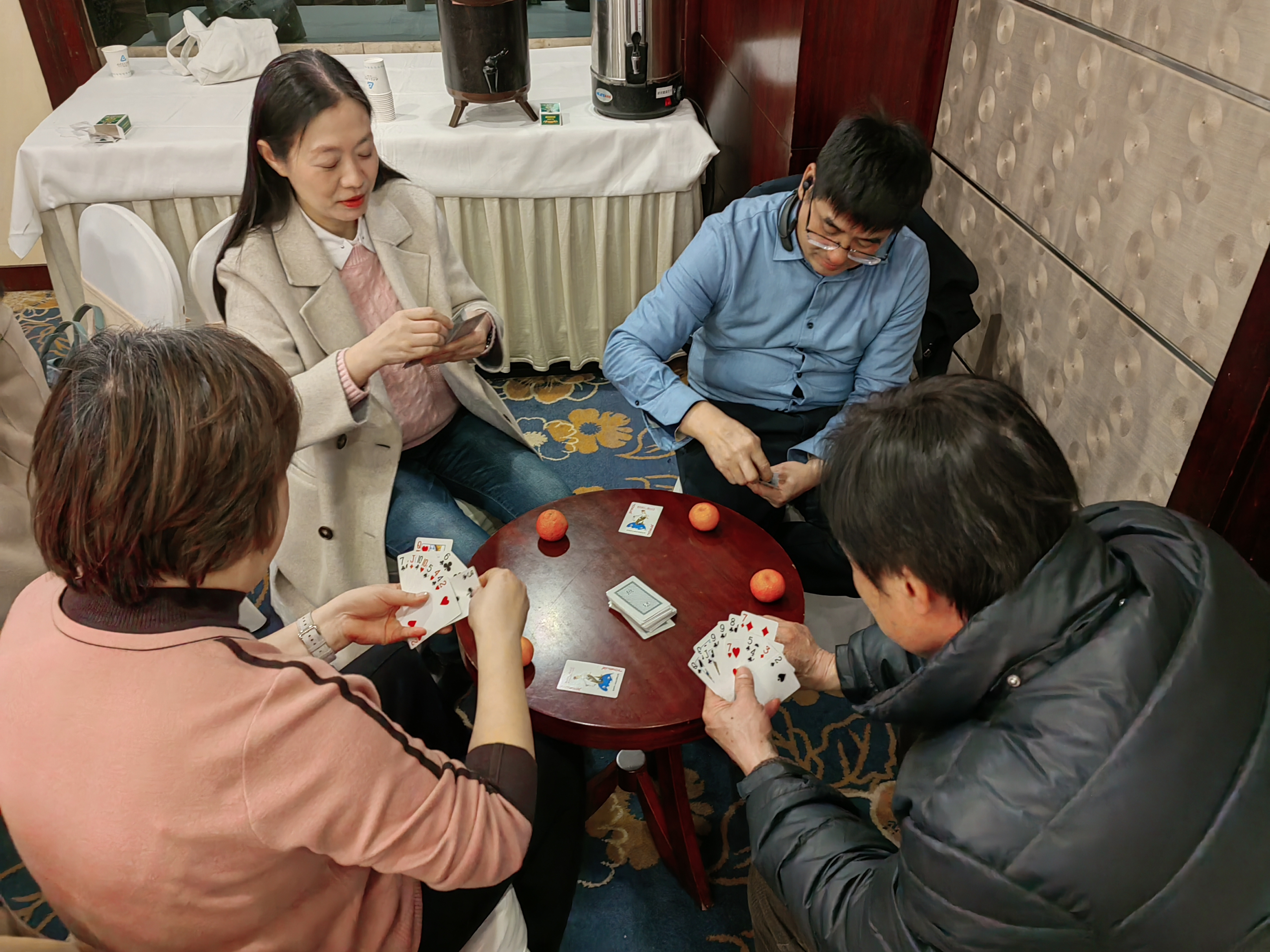 新春扑克比赛规则参考江苏省社会体育管理中心发布的《江苏省掼蛋竞赛规则(2023)》,采用组队淘汰制。现场分为4个小组进行激烈地角逐。最后由李怀军书记组摘得冠军,姜艳老师组摘得亚军。