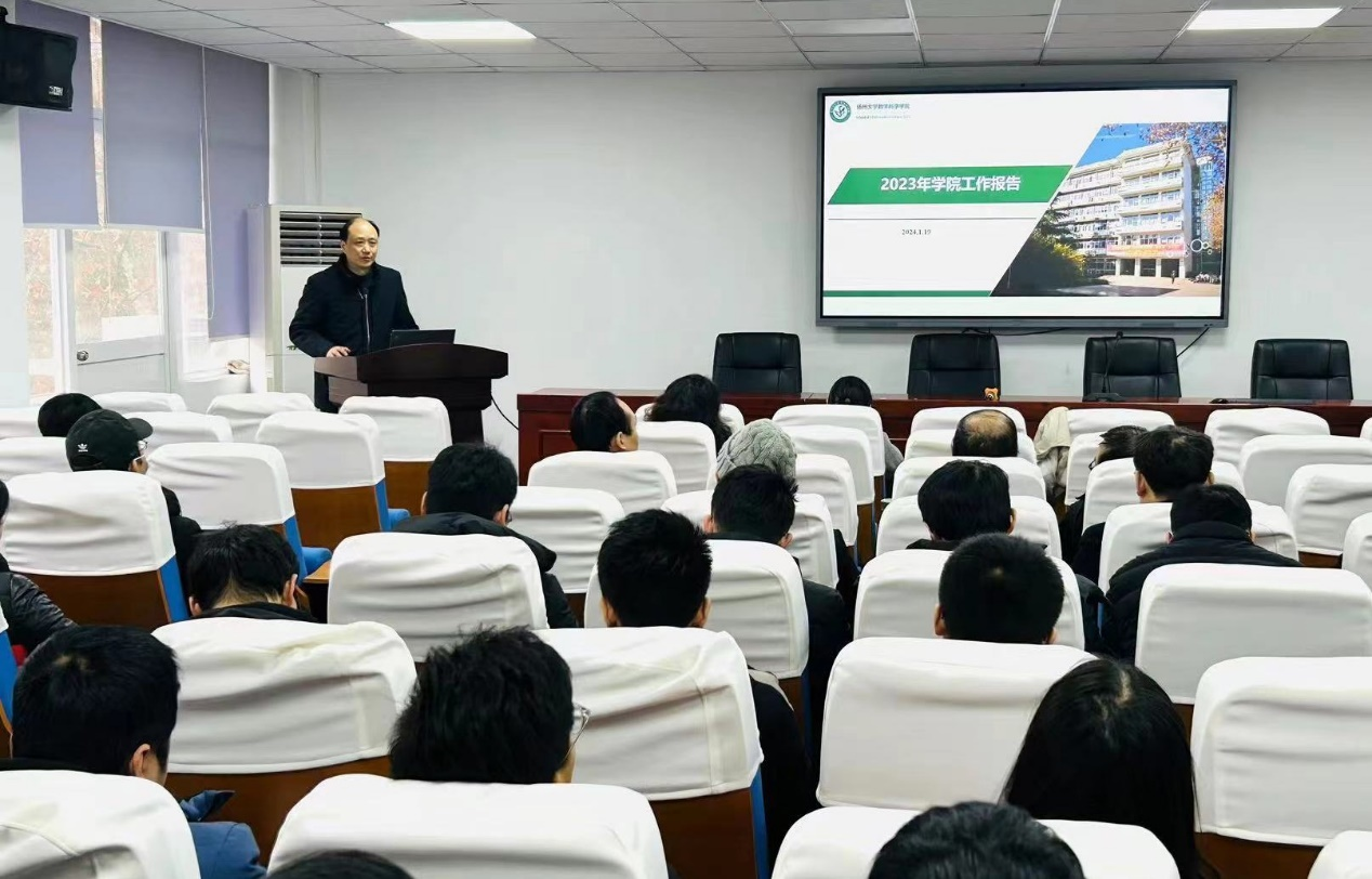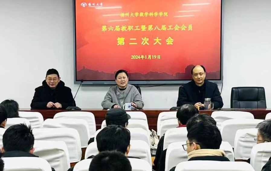 2024年1月19日上午,数学科学学院在瘦西湖校区数学学院227报告厅召开第六届教职工大会、第八届工会会员大会第二次会议,全体教职工和工会会员参加大会。院长凌智代表院行政作了2023年度工作报告,工会主席董琪翔代表院工会作了年度工作报告,院党委书记郭丽主持大会并作总结发言。