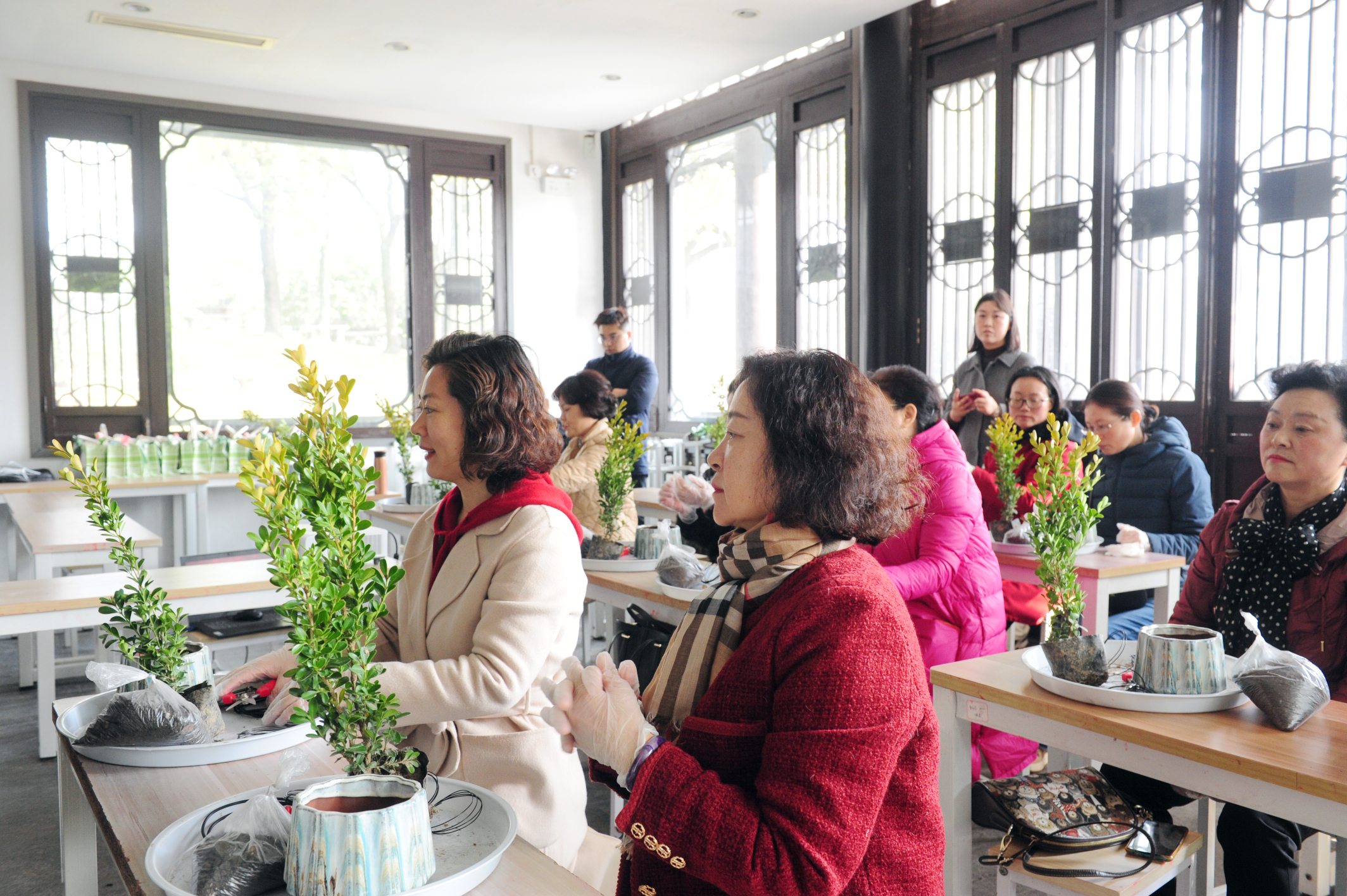 在扬派盆景博物馆内,大家聆听专家的精心讲解,亲手制作微景观小品,领略探索扬派盆景作为国家级非物质文化遗产的奇趣之美。