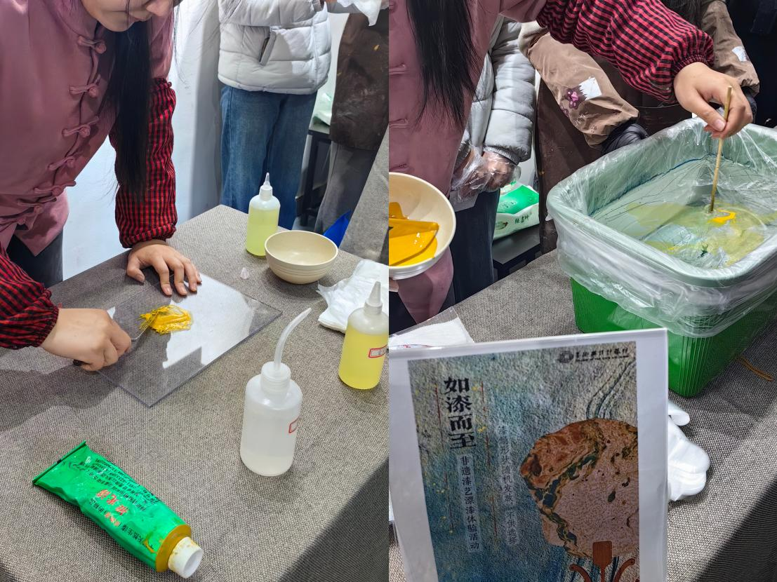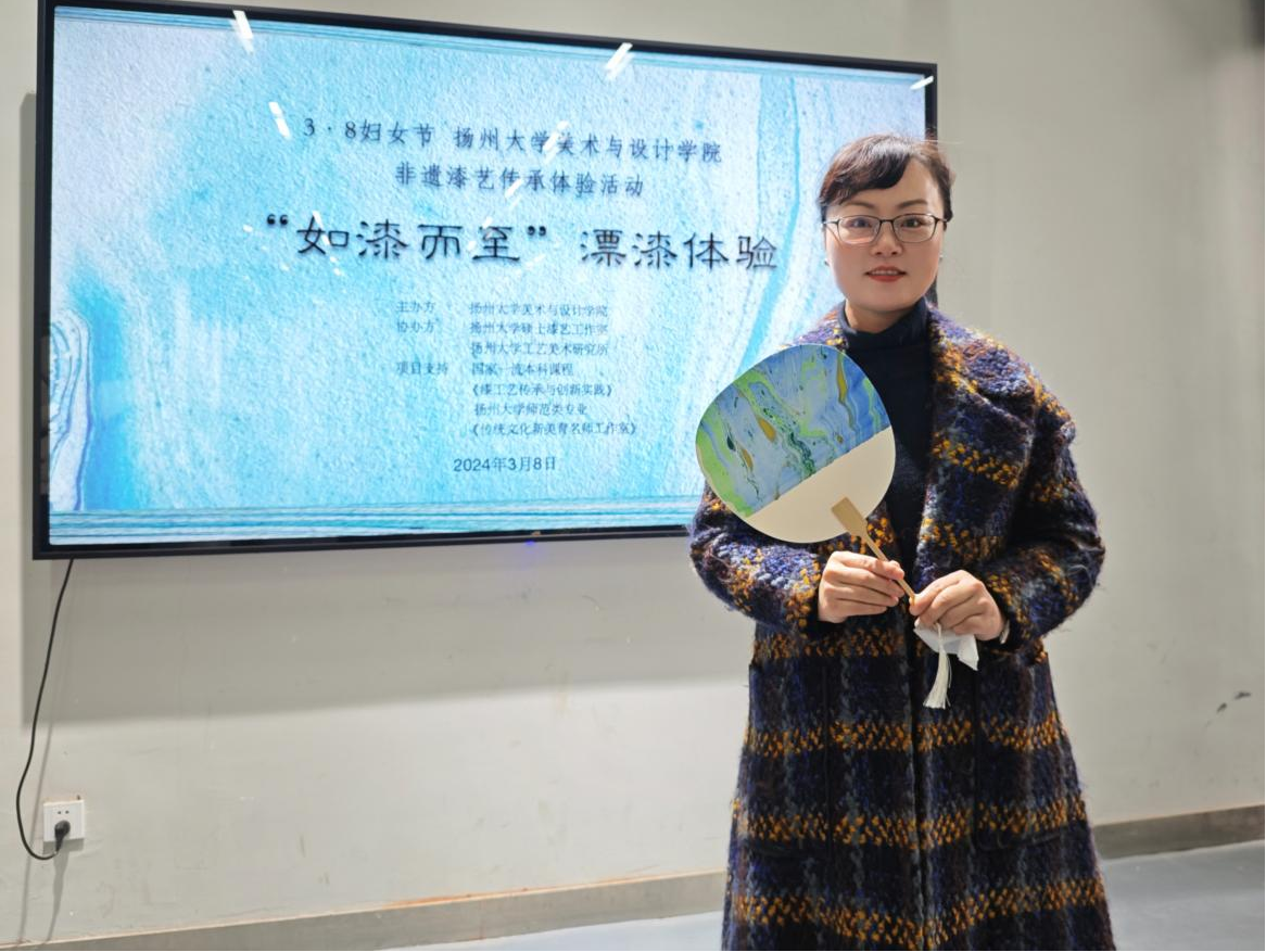 扬州是中国漆艺发源地之一,大漆漂漆是一种新颖的、具有漆艺独有特性的工艺技法。漂漆扇不仅是一种艺术装饰品,还承载着深厚的文化与寓意。三八国际妇女节之际,院工会结合学院专业优势,协同院漆艺工作室,举办了扬州大学美术与设计学院非遗漆艺传承体验活动——“如漆而至”漂漆体验活动。此次活动面向全校女教工,通过现场讲解、互动体验,带领大家一同感受扬州漂流漆的独特魅力。