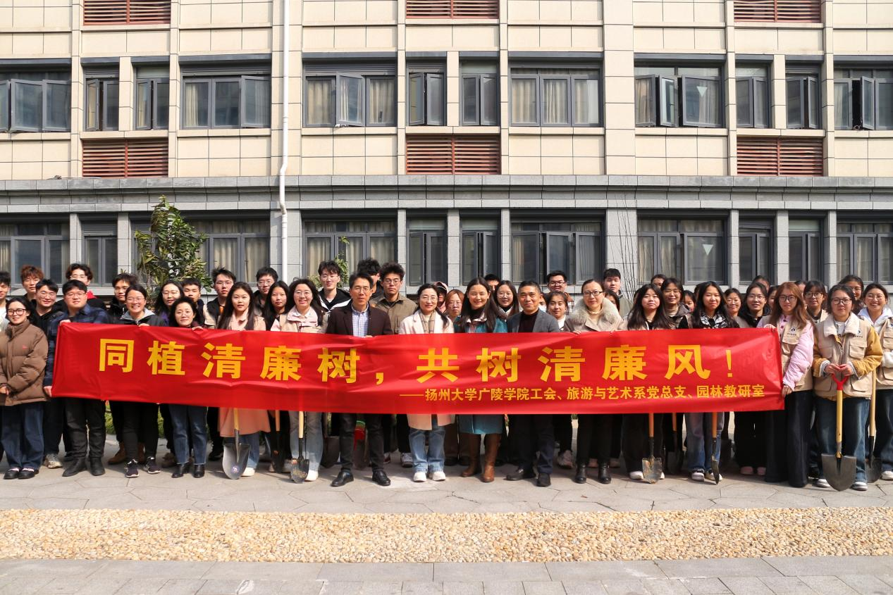 春光旖旎,万物复苏。为全面贯彻落实习近平总书记生态文明思想,绿水青山就是金山银山的发展理念,广陵学院工会联合旅艺系党总支、园林教研室、旅艺系全体辅导员于3月12日共同开展了"同植清廉树,共树清廉风"的植树节活动。院纪委书记杨璇老师、院长助理范守信老师、旅艺系党总支书记孙家珏老师、院工会主席帖容老师参加,旨在师生携手,助力廉洁校园建设,践行劳动教育,共扬廉洁之风。