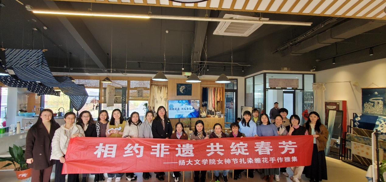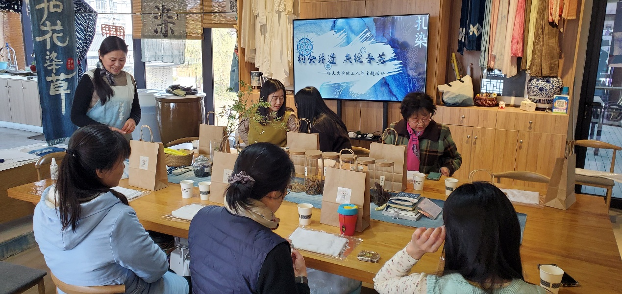 3月20日下午,为庆祝“三八”国际妇女节,文学院工会组织全院女教工,赴“运河非遗体验馆”亲身体验缠花、扎染的乐趣。在专业非遗老师的讲解和指导下,经过2个多小时的学习和制作,大家不仅对中国的缠花、扎染历史有了更加深入的了解,还凭借巧思制作出精巧别致的胸针和独一无二的扎染围巾,在欢声笑语中,老师们沉浸式体验了非遗文化,收获满满,留下了美好的回忆。