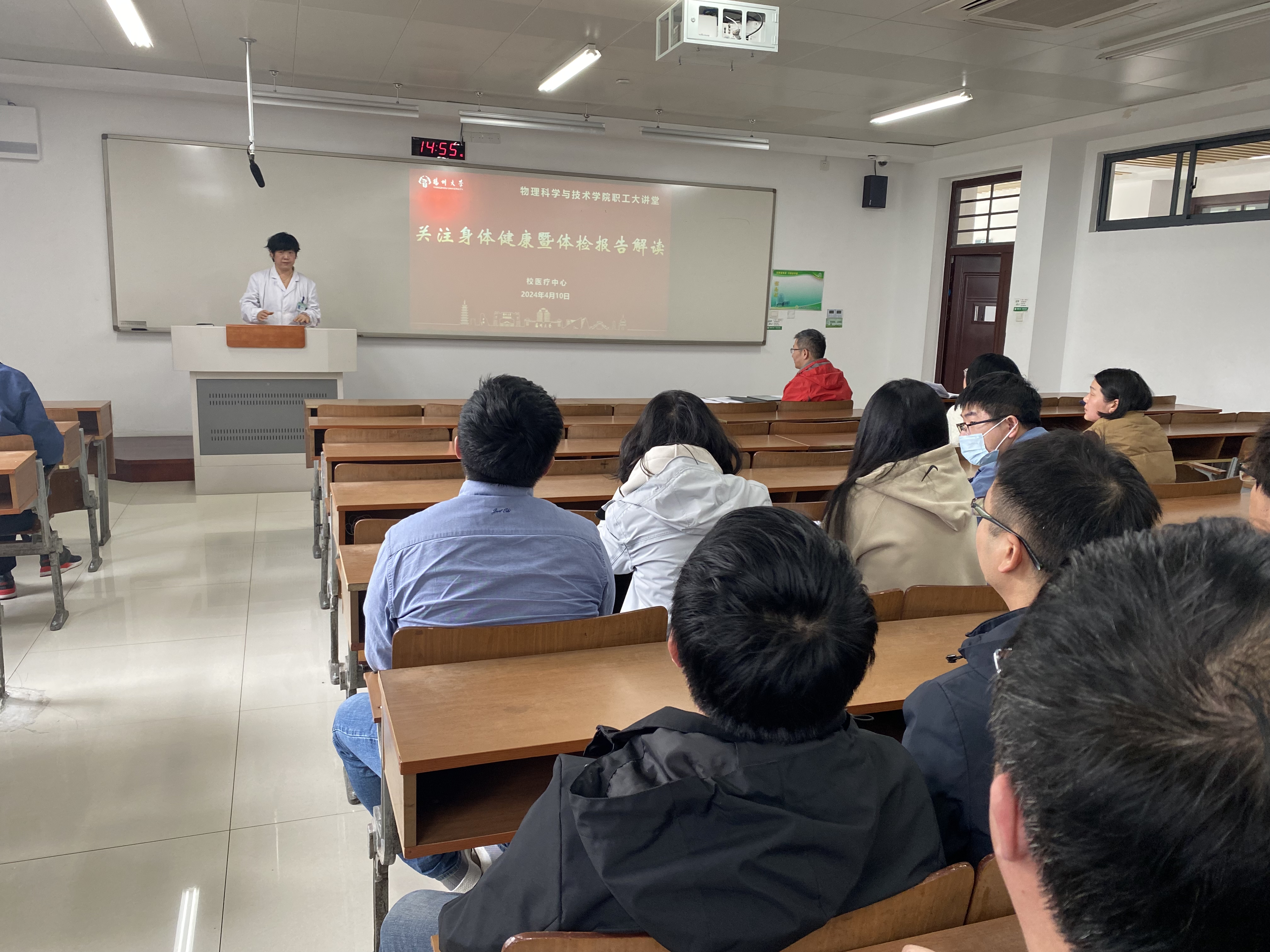 4月10日下午,物理科学与技术学院工会在瘦西湖校区8号楼N109举办职工大讲堂——“关注身体健康暨体检报告解读”科普讲座,邀请了瘦西湖校区卫生所所长刘莉医生为学院教师进行体检报告解读,并针对教师群体中一些常见的健康问题进行了个性化指导。